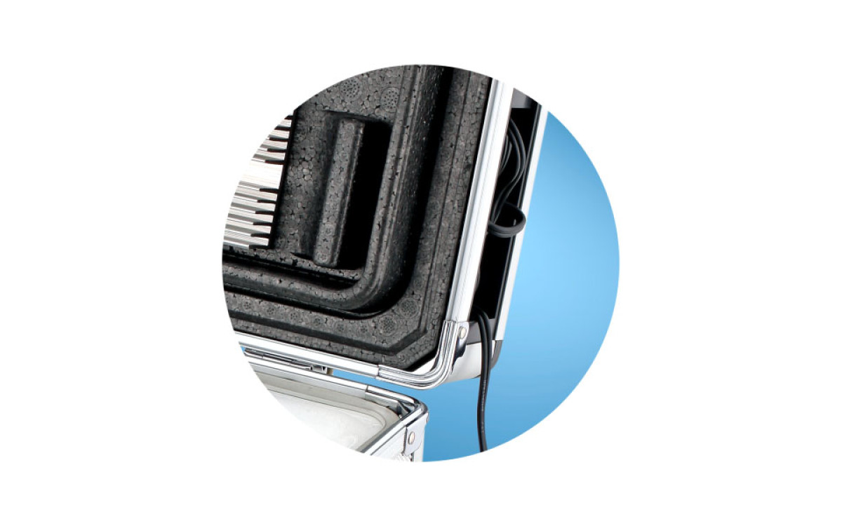 Принцип действия термоэлектрического контейнера (холодильника) основан на свойстве полупроводниковых пластин, это свойство получило название "эффект Пельтье". При протекании тока через полупроводниковую пластину одна сторона ее охлаждается (этой стороной пластина обращена внутрь контейнера), другая сторона - нагревается (эта сторона обращена наружу и охлаждается вентилятором).