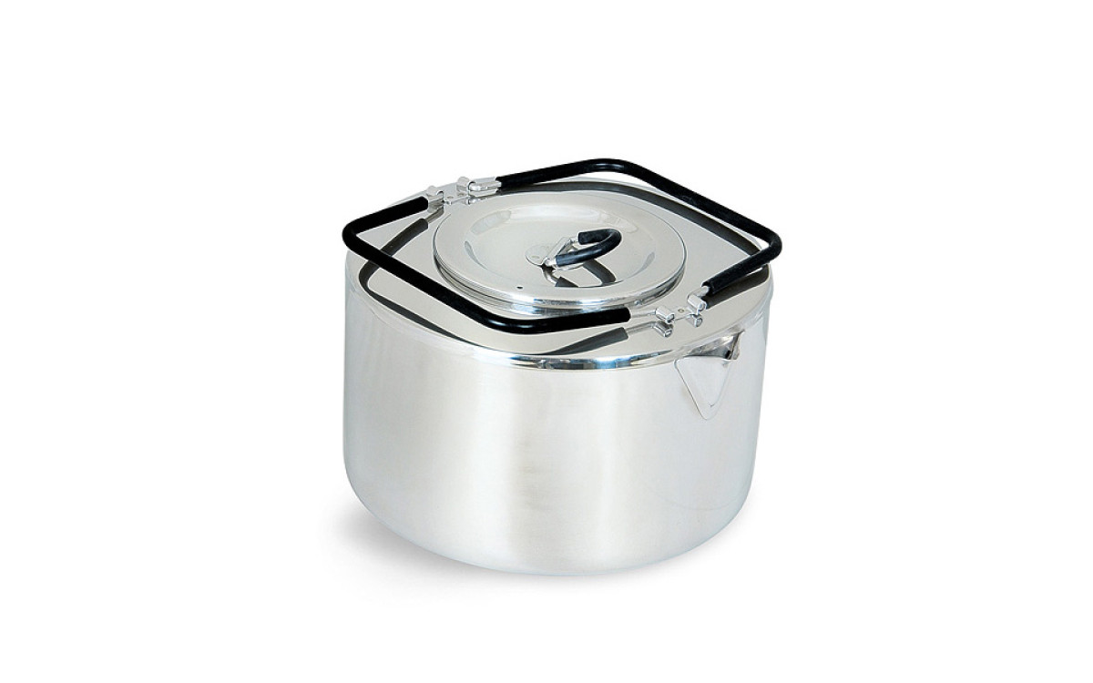 Чайник из нержавеющей стали со складными теплоизолированными ручками и встроенным ситечком.