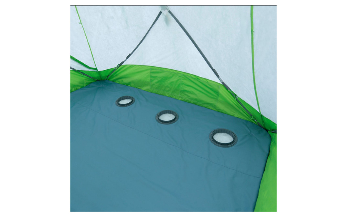 - Расположение утепленного пола поверх внутренней юбки обеспечивает укрытию высокую теплоизоляцию и исключает возможное задувание по всему нижнему периметру палатки. При этом теплая палатка совместно с гидро-термоизоляционным дном образуют цельное и очень устойчивое укрытие, способное защитить пользователя от сильного ветра, мороза и затопления водой.
