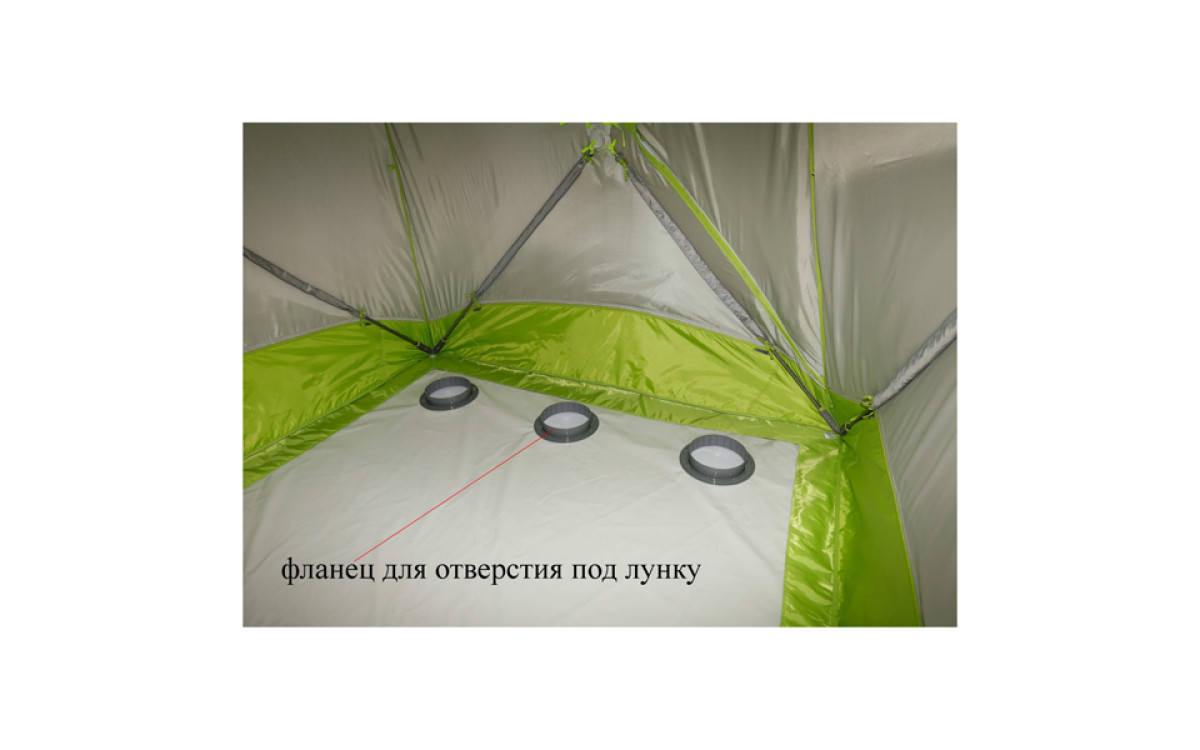 - Отверстия под лунки в гидроизоляционном днище могут быть вырезаны пользователем самостоятельно, исходя из конфигурации размещенного в палатке оборудования. Для оптимальной защиты пола палатки рекомендуется устанавливать - фланец для отверстия под лунку "ЛОТОС 200" (опция, приобретается отдельно), который образует бортик, исключающий затекание воды из лунки на поверхность пола.