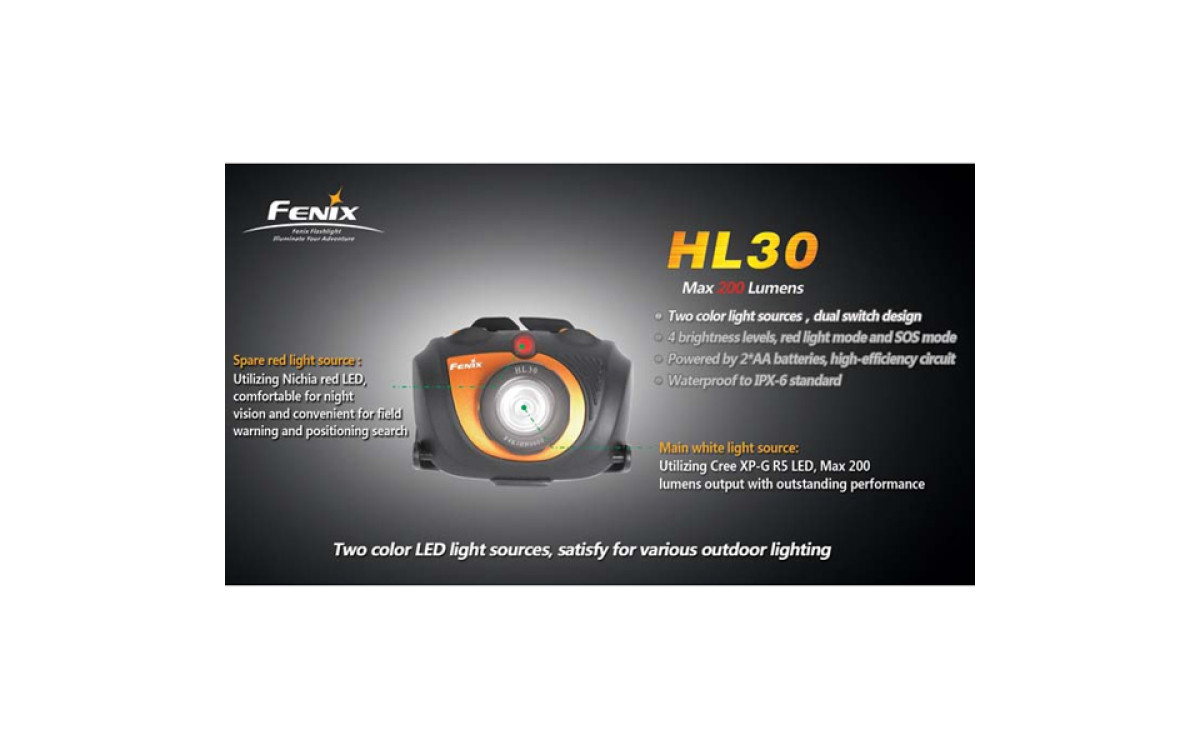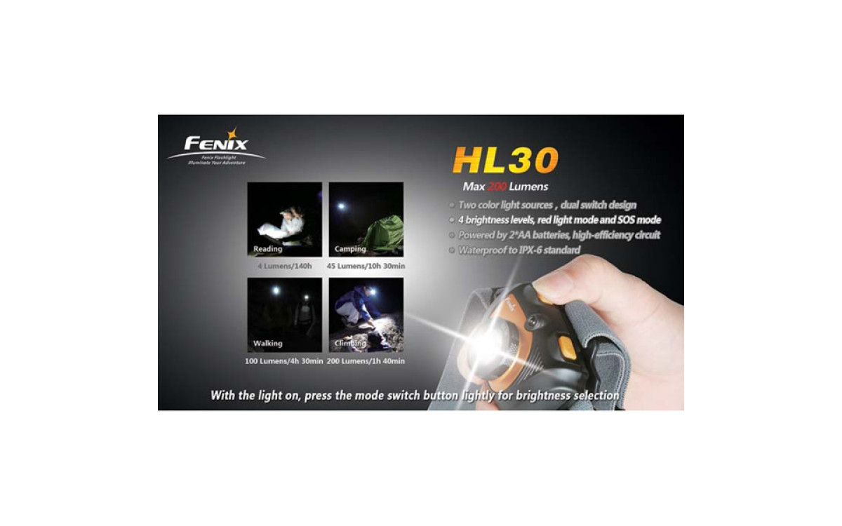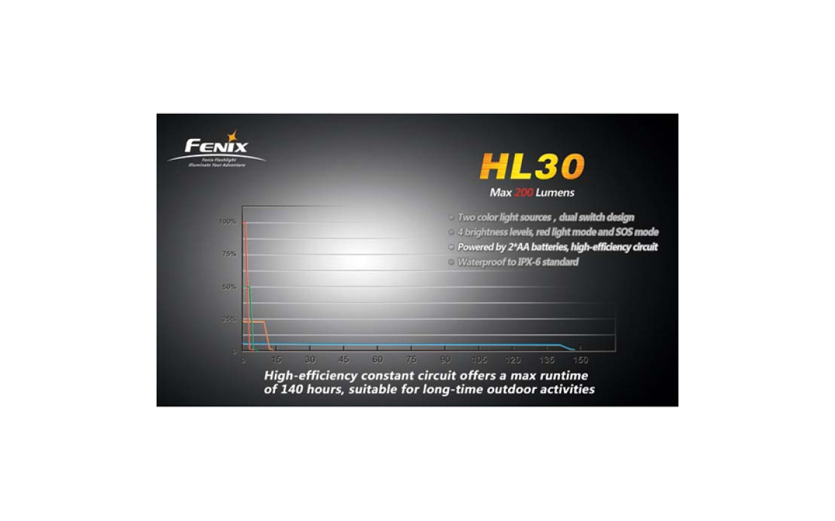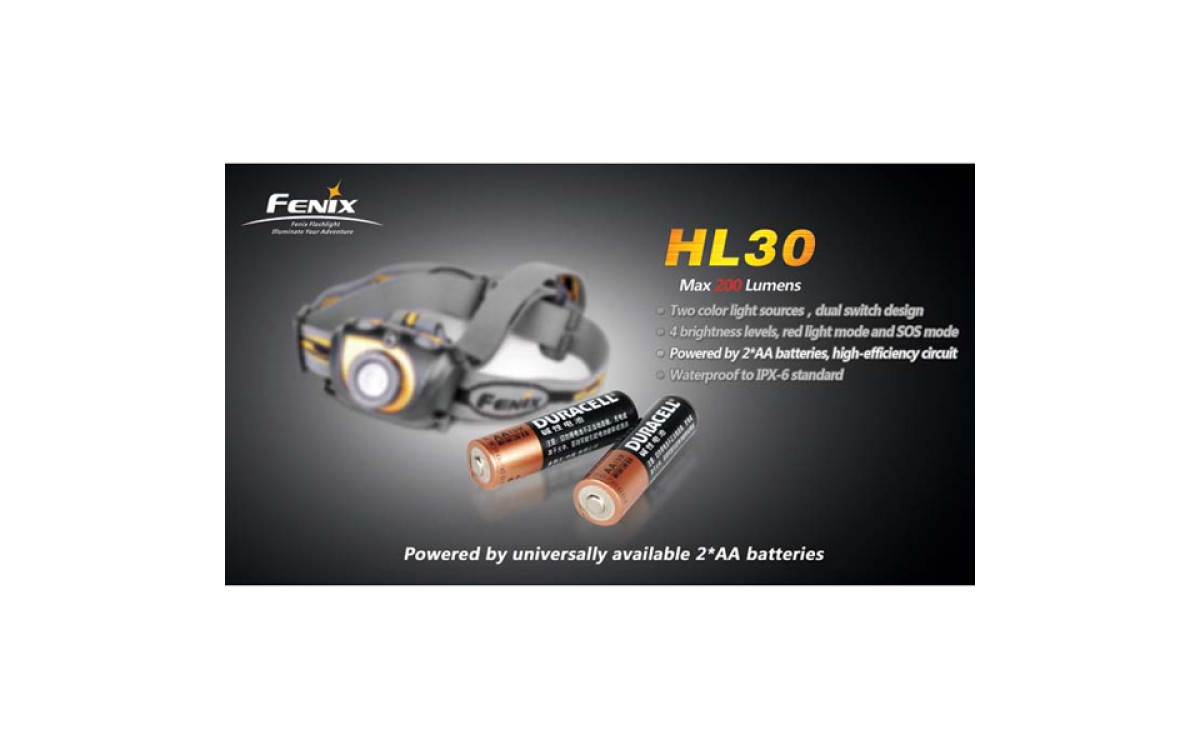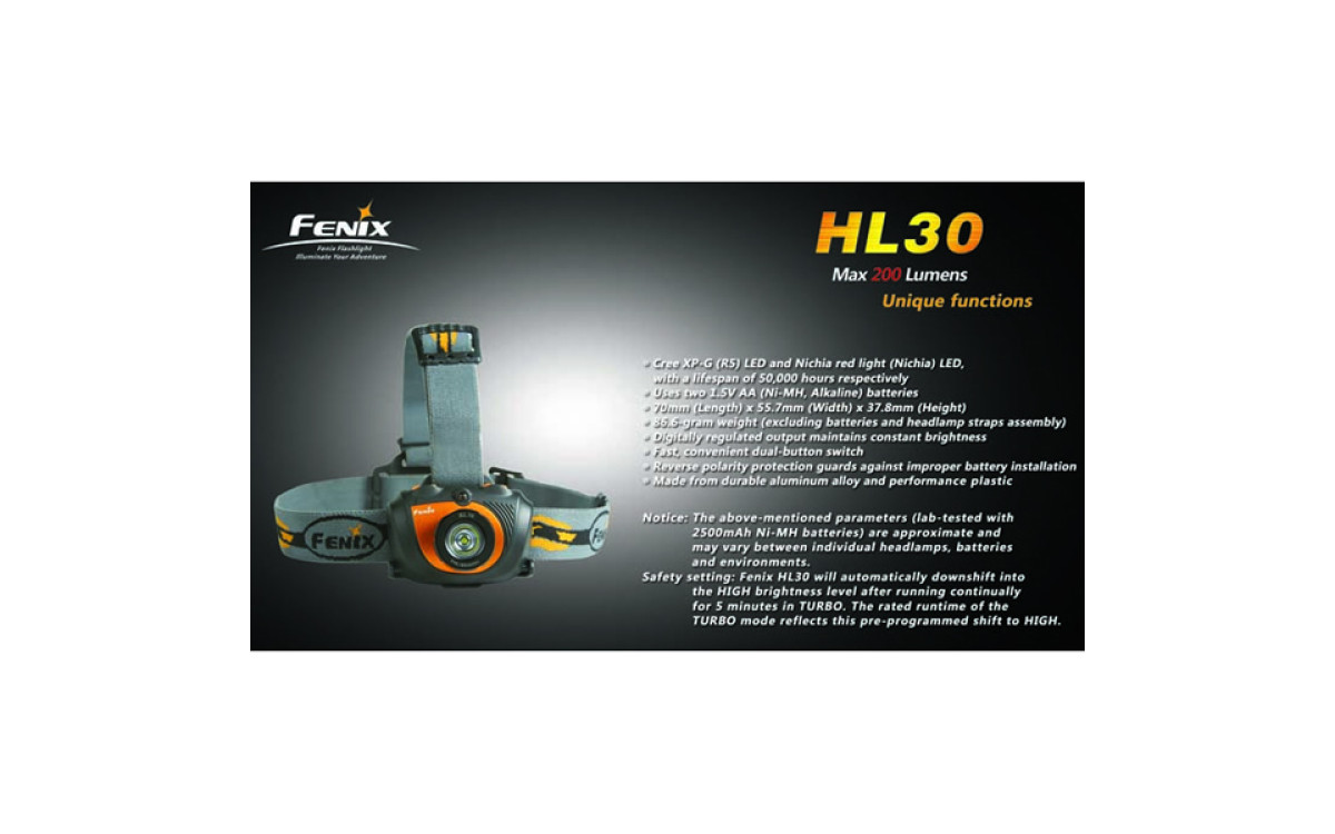 Fenix HL30 имеет цифровую регулировку яркости (процессор поддерживает яркость постоянной по мере разряда батарей), предупреждение о низком заряде батарей и запоминает последний выбранный режим работы. Защищен от переполюсовки элементами питания и перегрева светодиода.