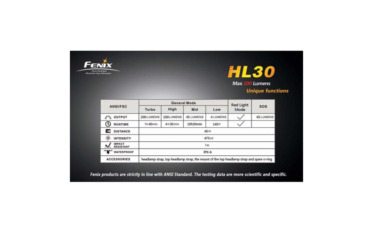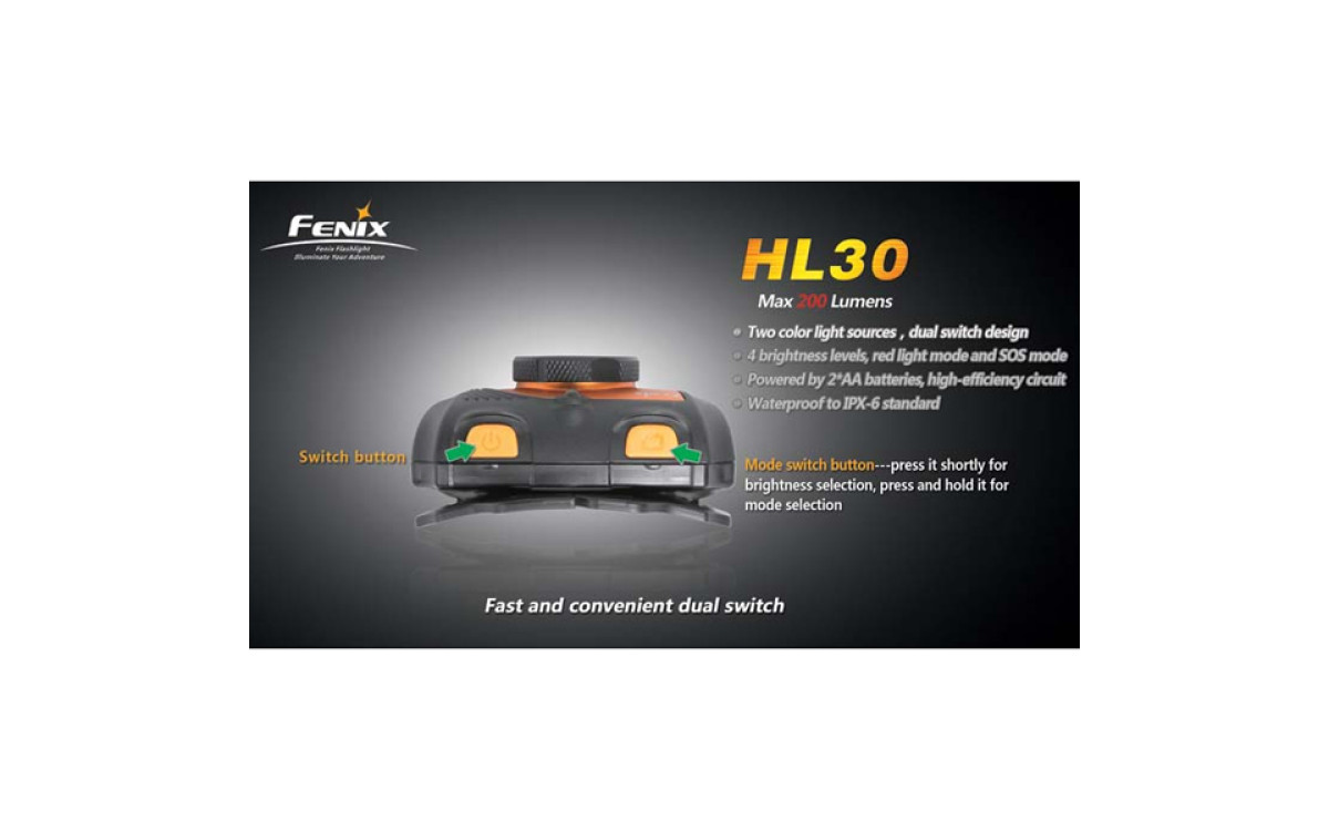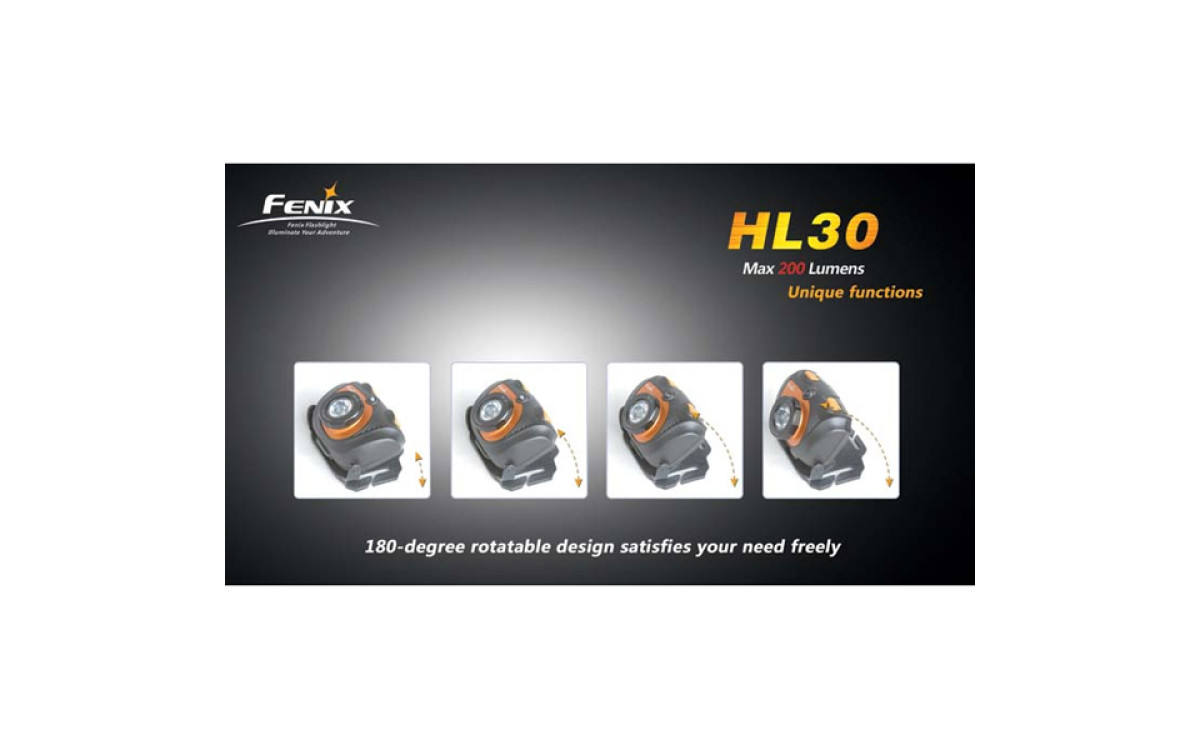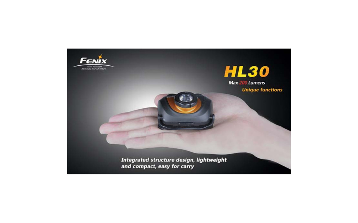 Fenix HL30 имеет цифровую регулировку яркости (процессор поддерживает яркость постоянной по мере разряда батарей), предупреждение о низком заряде батарей и запоминает последний выбранный режим работы. Защищен от переполюсовки элементами питания и перегрева светодиода.