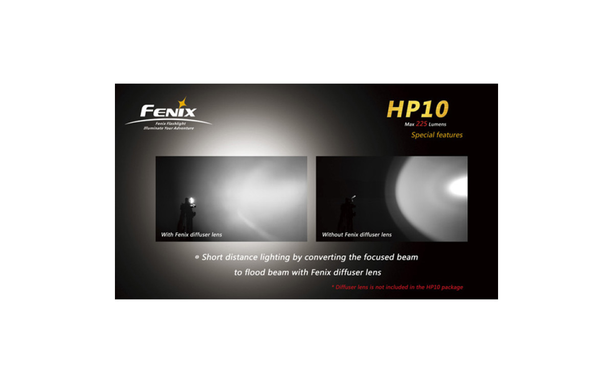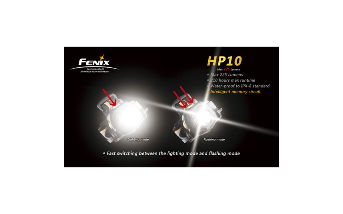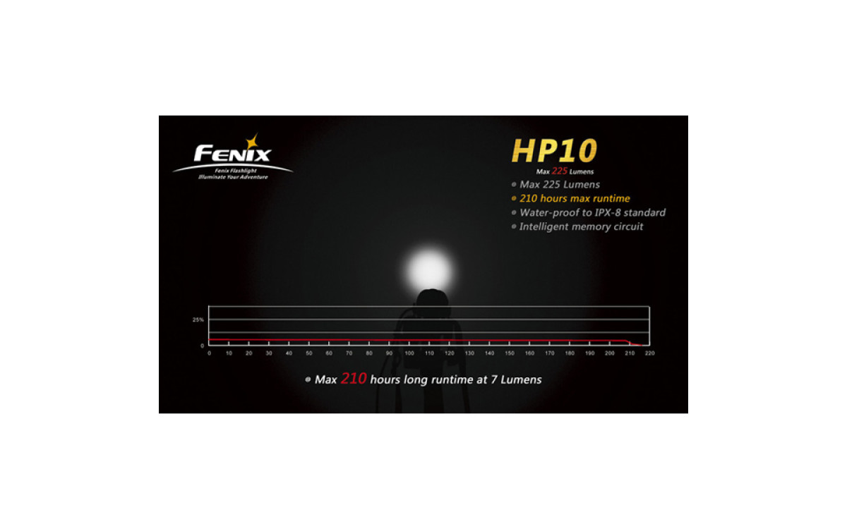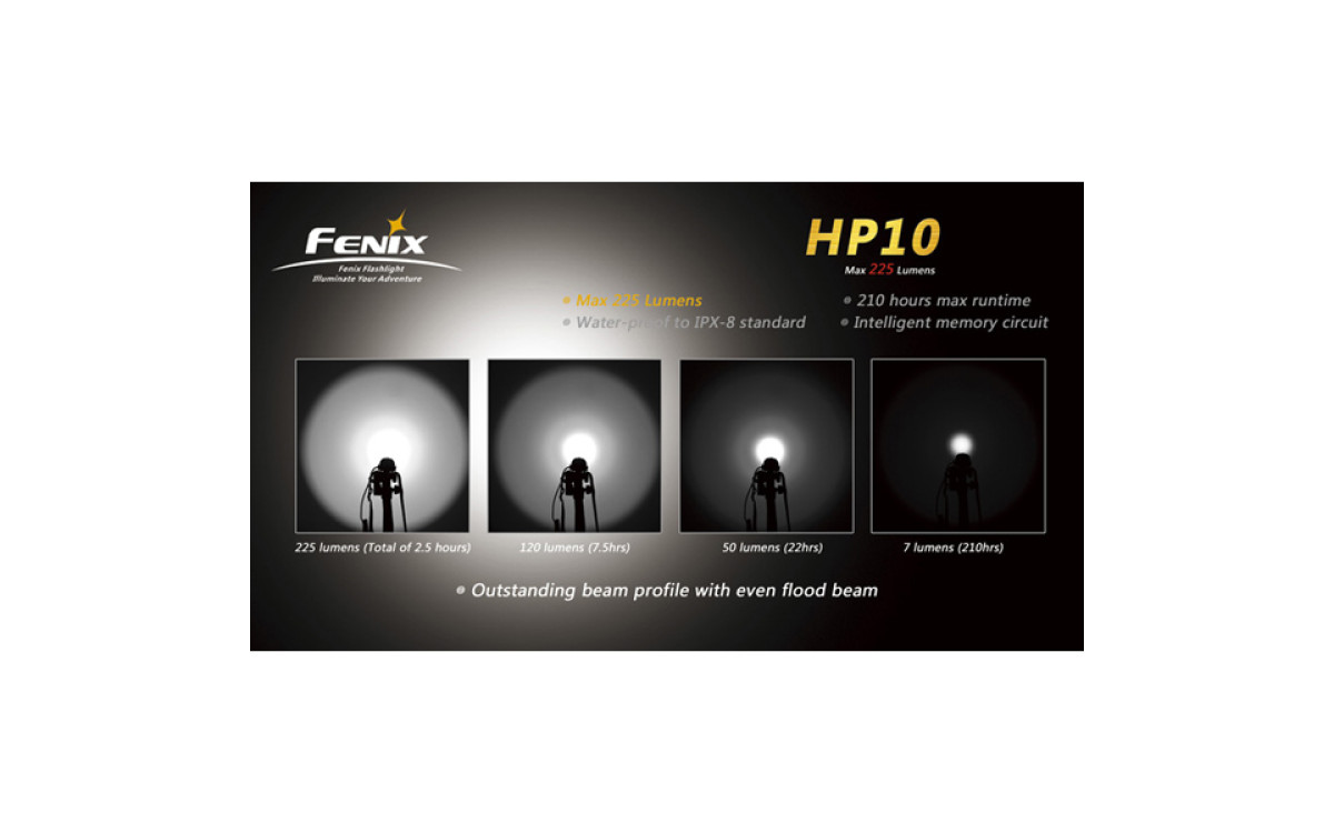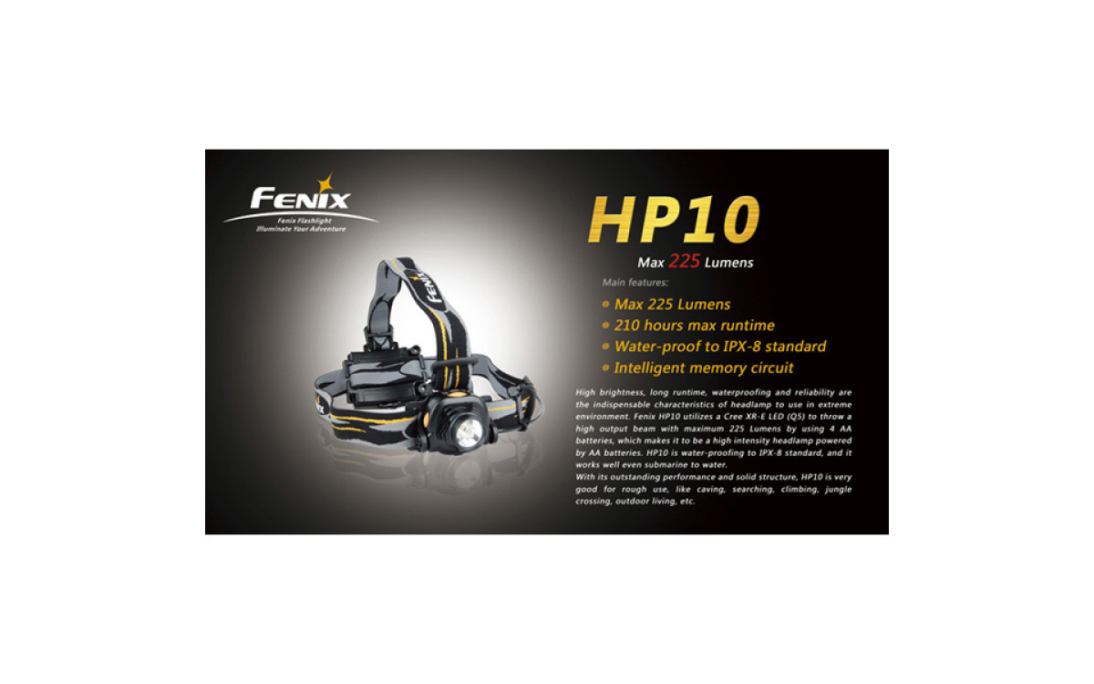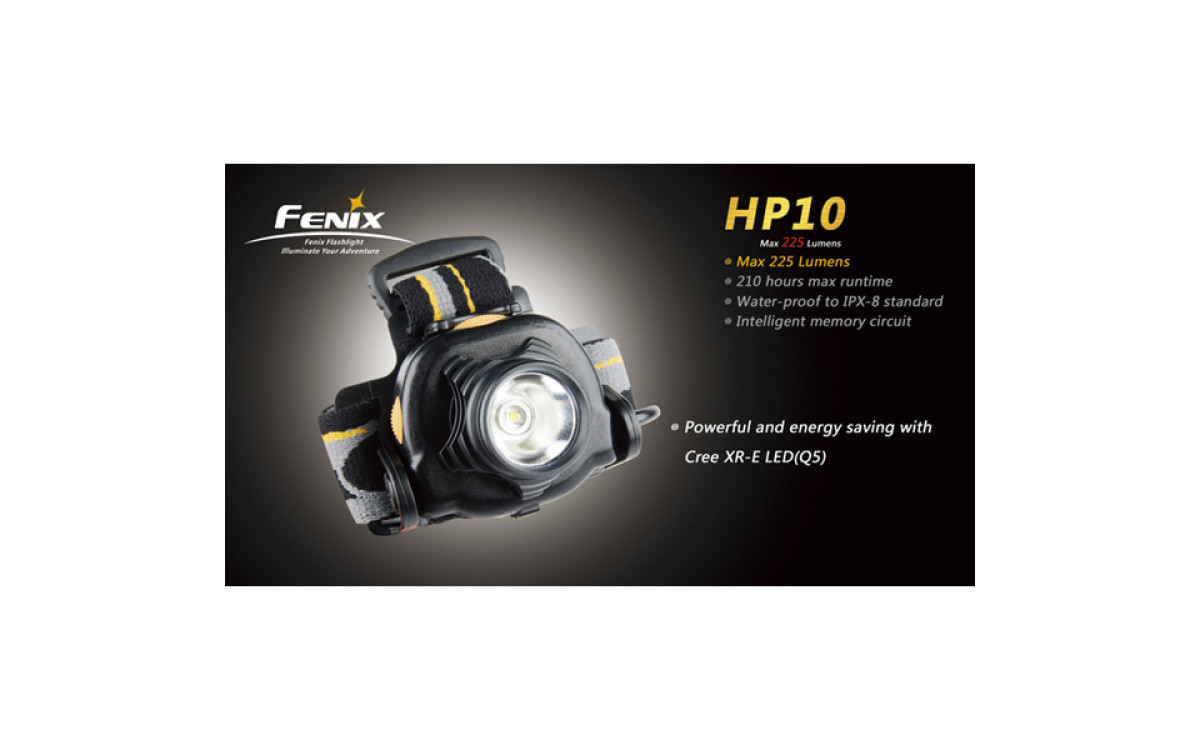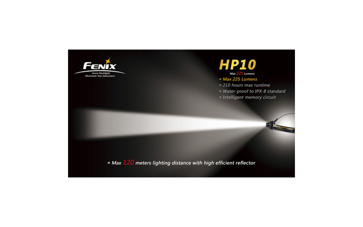Высокая яркость (до 225 люмен), длительное время работы, полная водонепроницаемость и надежность позволяют использовать налобный фонарь Fenix HP10 практически в любых условиях. Светодиод Cree XR-E (Q5), питаемый четырьмя батарейками типа АА, излучает свет на расстояние до 120 метров. Фонарь удобно сидит на голове и сбалансирован батарейным отсеком, расположенным на затылке.