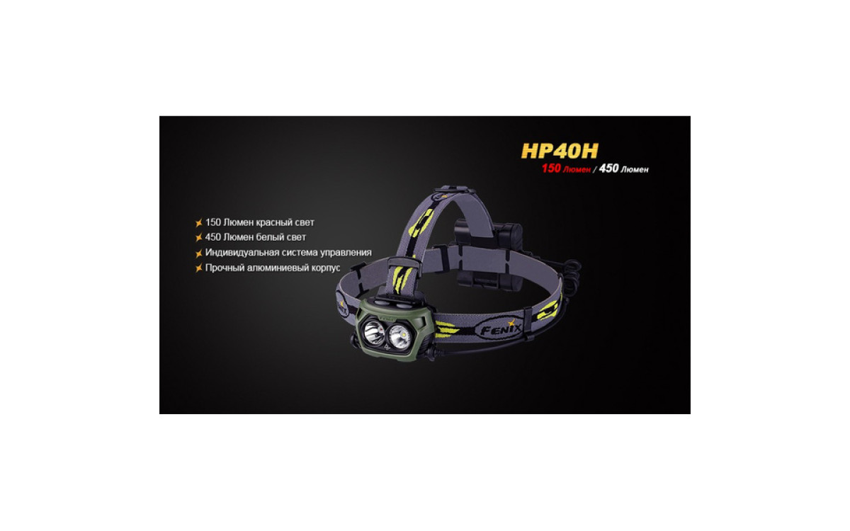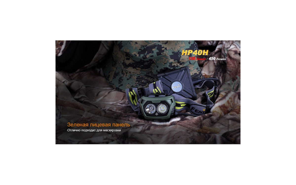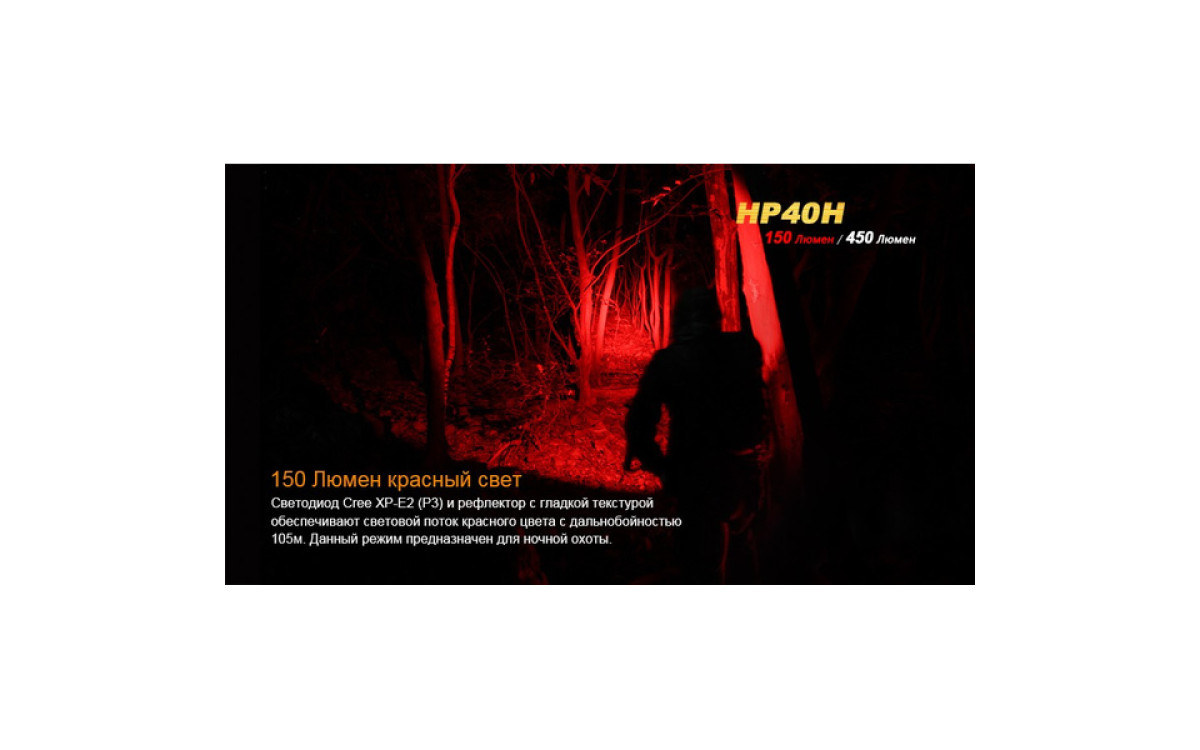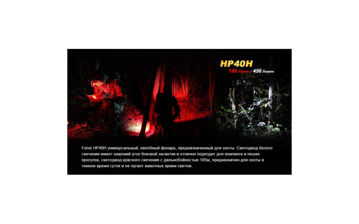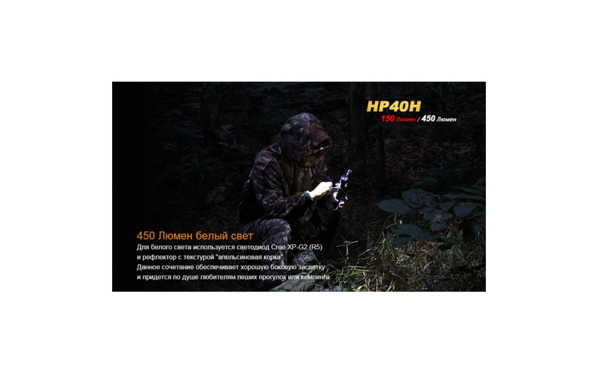 Налобный фонарь Fenix HP40H контролирует меняющуюся ситуацию, имея в своем арсенале подобранные уровни яркости и дополнительный источник сильного красного света. Два независимых светодиода с индивидуальным управлением, питаясь от 4-х батарей АА, обеспечивают сфокусированный луч с боковой засветкой яркостью до 450 люмен. Интенсивный красный свет с дистанцией освещения до 105 метров и временем работы до 9 часов превращает налобный HP40H в необходимый инструмент для охотников - с приходом сумерек и до наступления рассвета.