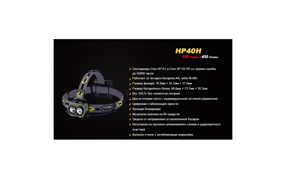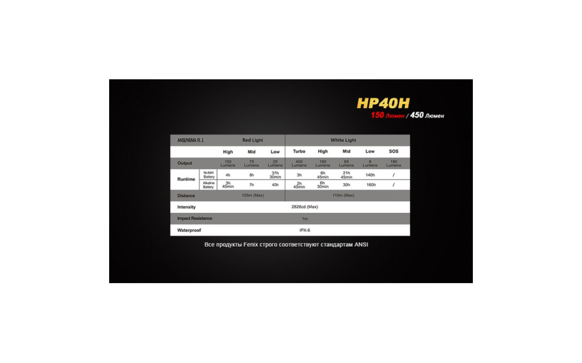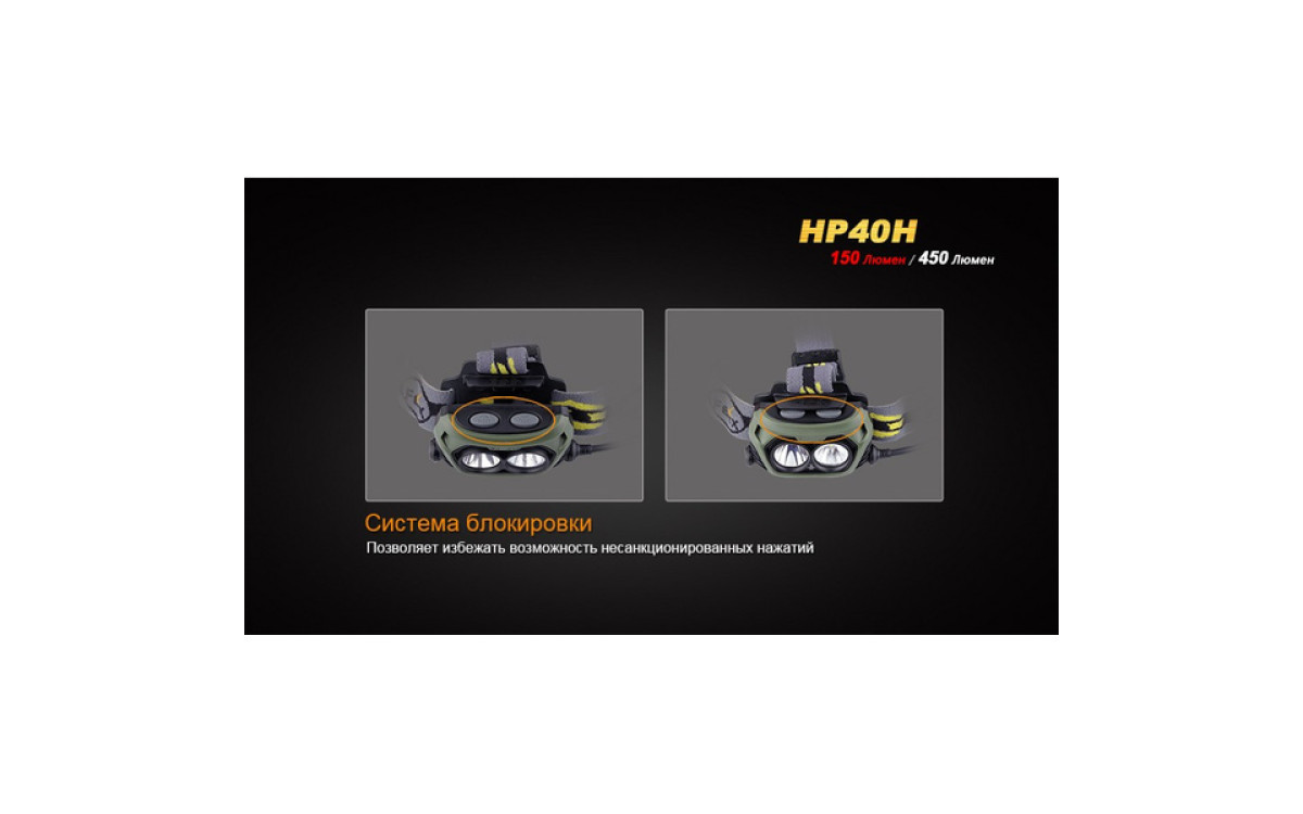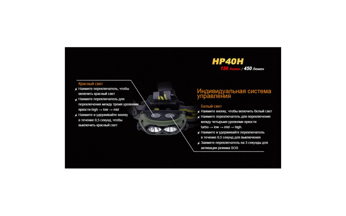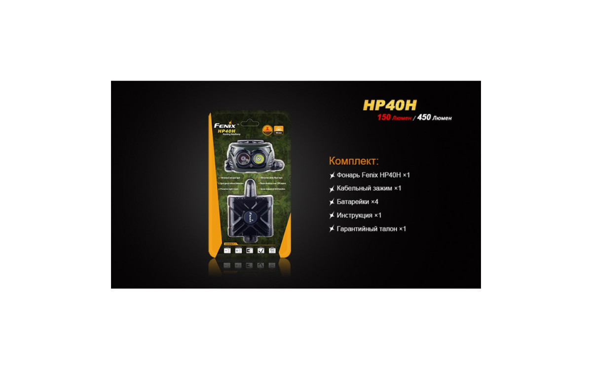 Налобный фонарь Fenix HP40H контролирует меняющуюся ситуацию, имея в своем арсенале подобранные уровни яркости и дополнительный источник сильного красного света. Два независимых светодиода с индивидуальным управлением, питаясь от 4-х батарей АА, обеспечивают сфокусированный луч с боковой засветкой яркостью до 450 люмен. Интенсивный красный свет с дистанцией освещения до 105 метров и временем работы до 9 часов превращает налобный HP40H в необходимый инструмент для охотников - с приходом сумерек и до наступления рассвета.