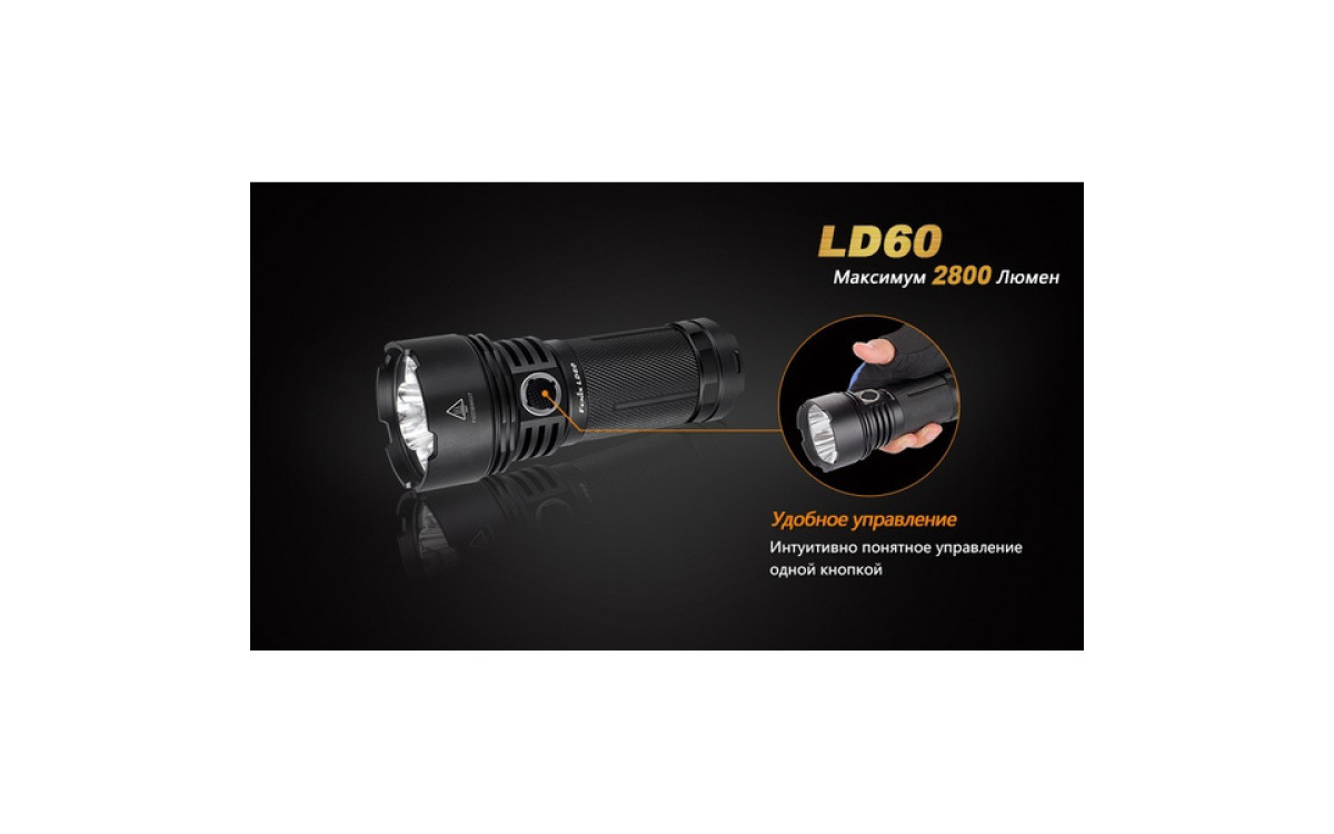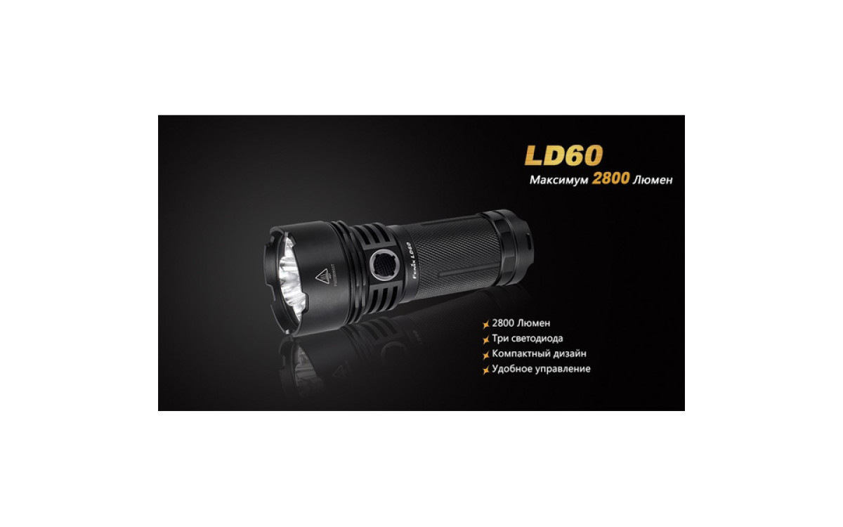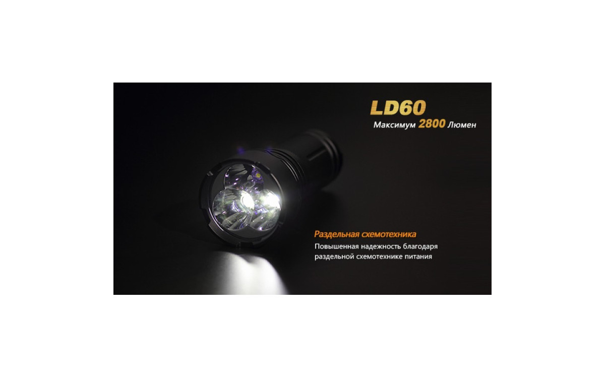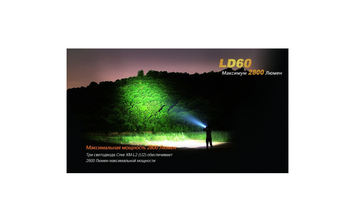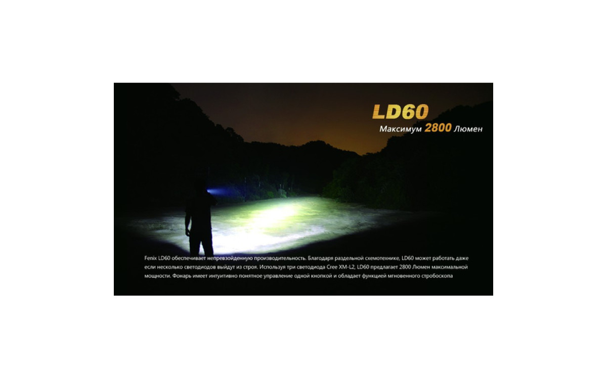 Фонарь LD60 потрясающе ярок и гибок в использовании, он имеет в своем арсенале 3 источника света. Благодаря независимым схемам управления, LD60 будет работать даже тогда, когда один или два светодиода выйдут из строя. Максимальная яркость трех светодиодов составляет 2800 люмен, фонарь полностью управляется одной кнопкой — выбор одного из пяти режимов яркости и строб-сигнала.