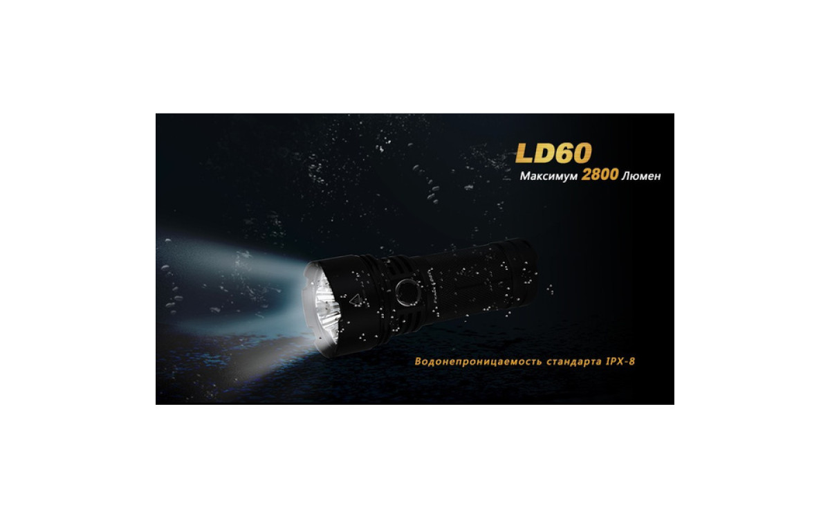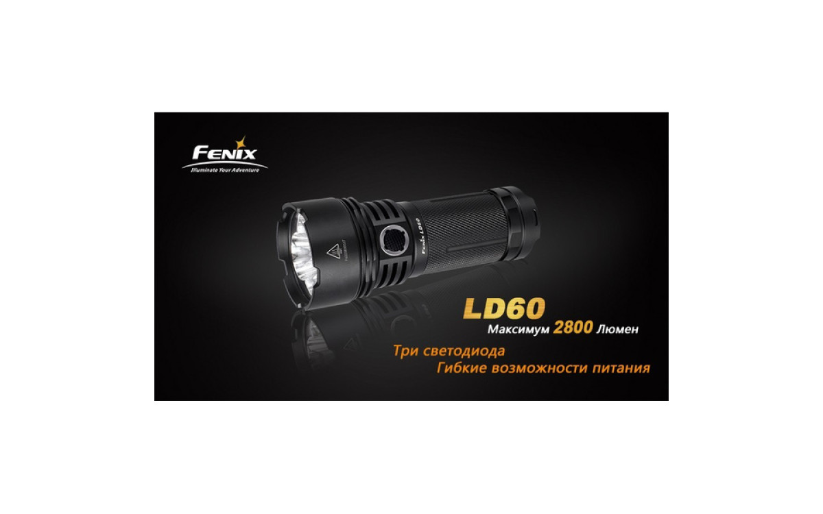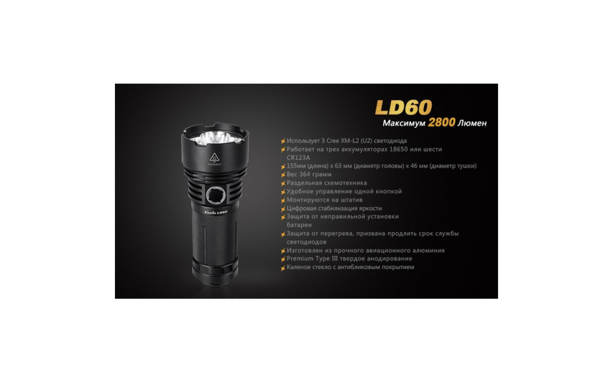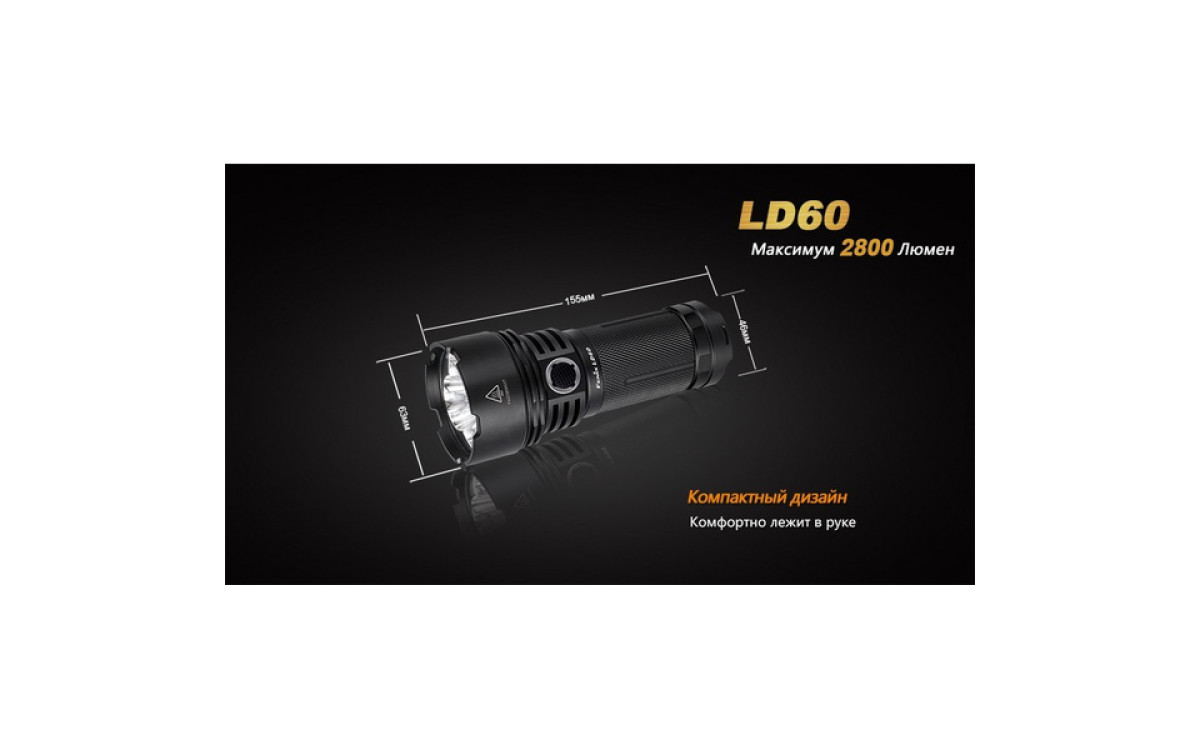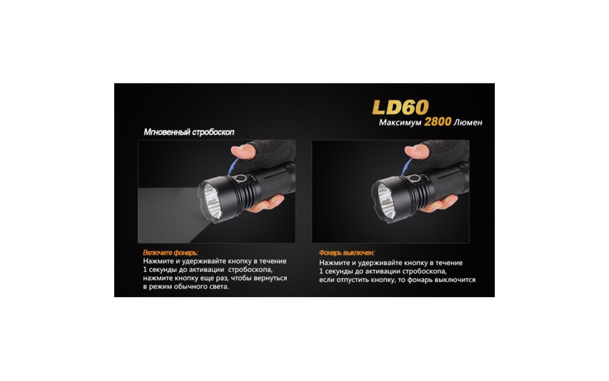 Фонарь LD60 потрясающе ярок и гибок в использовании, он имеет в своем арсенале 3 источника света. Благодаря независимым схемам управления, LD60 будет работать даже тогда, когда один или два светодиода выйдут из строя. Максимальная яркость трех светодиодов составляет 2800 люмен, фонарь полностью управляется одной кнопкой — выбор одного из пяти режимов яркости и строб-сигнала.