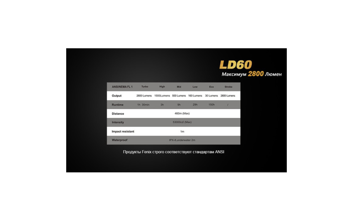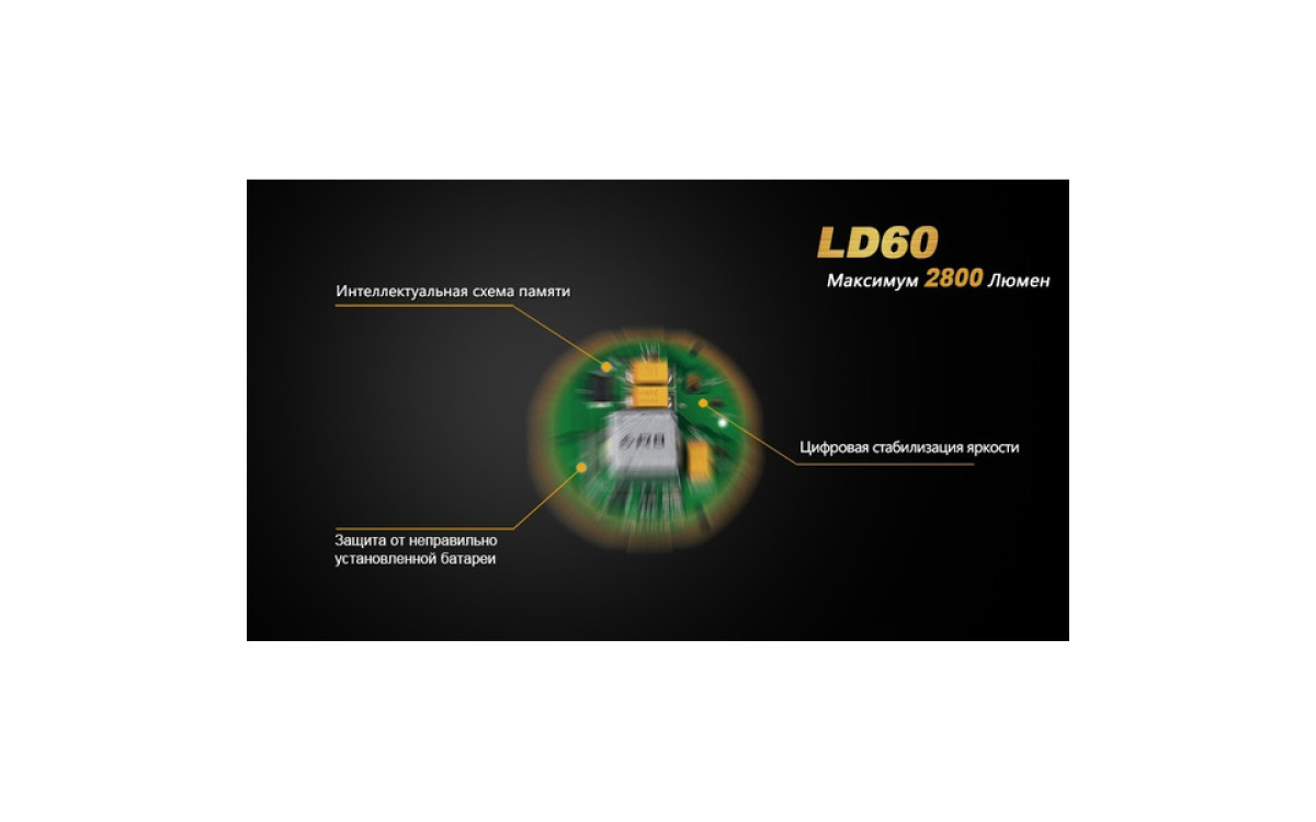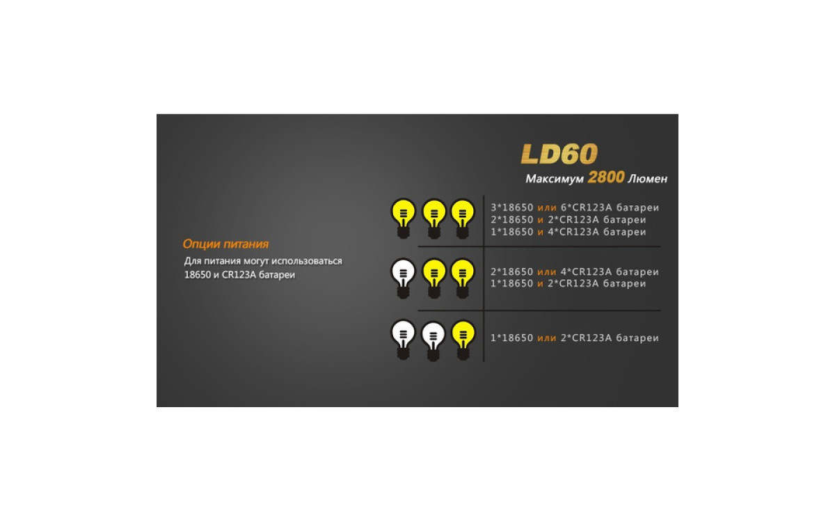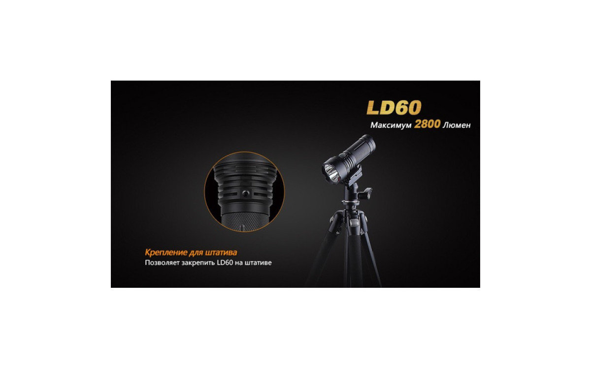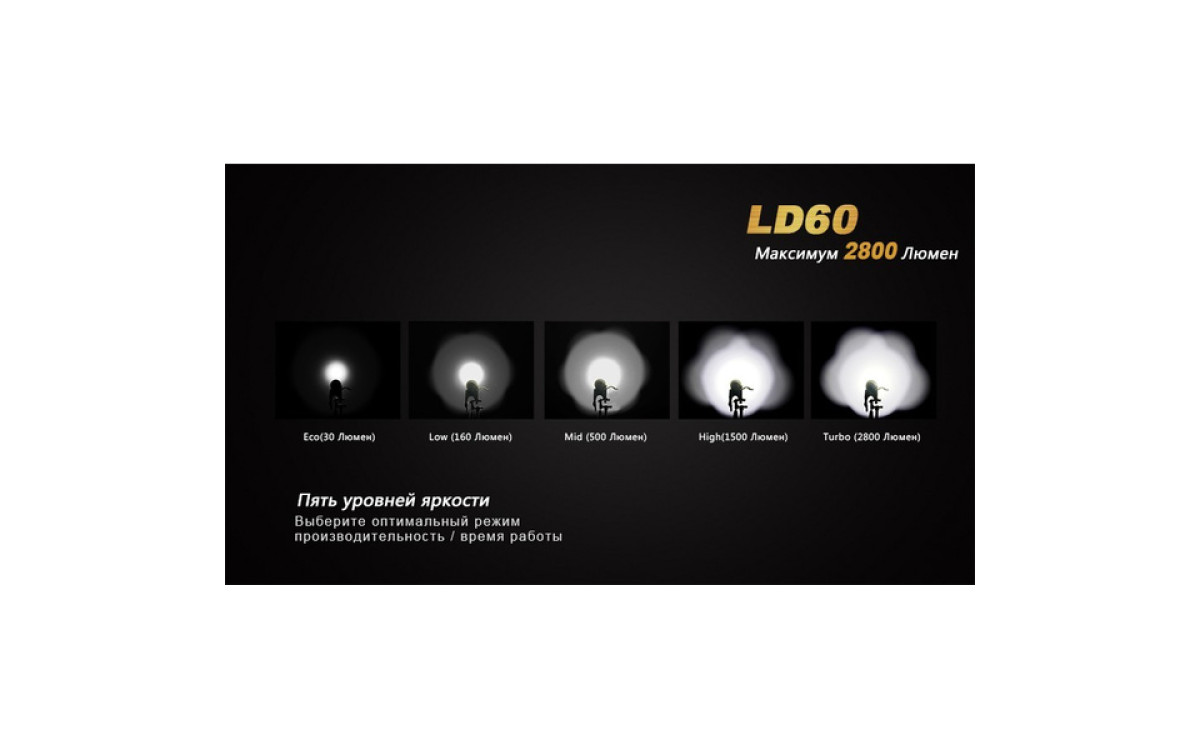 Фонарь LD60 потрясающе ярок и гибок в использовании, он имеет в своем арсенале 3 источника света. Благодаря независимым схемам управления, LD60 будет работать даже тогда, когда один или два светодиода выйдут из строя. Максимальная яркость трех светодиодов составляет 2800 люмен, фонарь полностью управляется одной кнопкой — выбор одного из пяти режимов яркости и строб-сигнала.