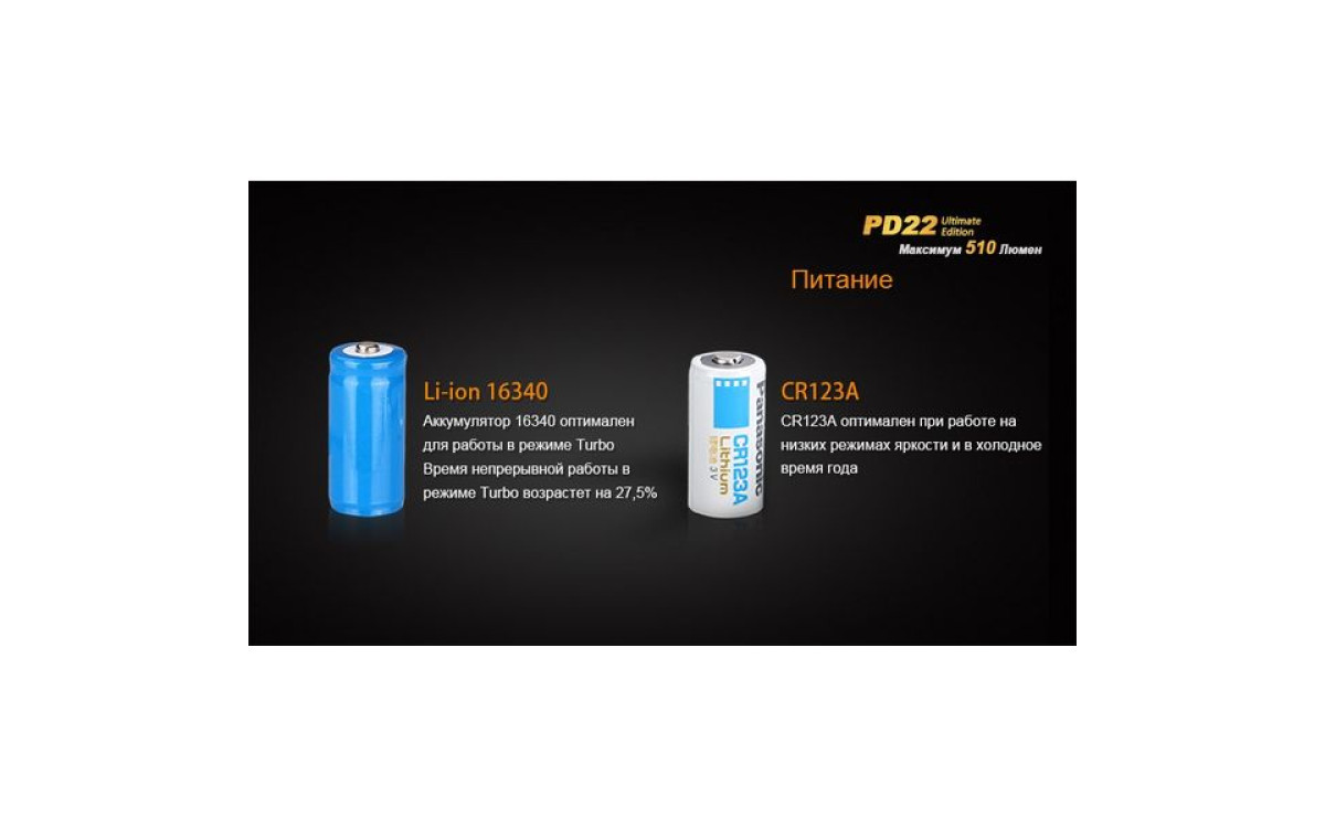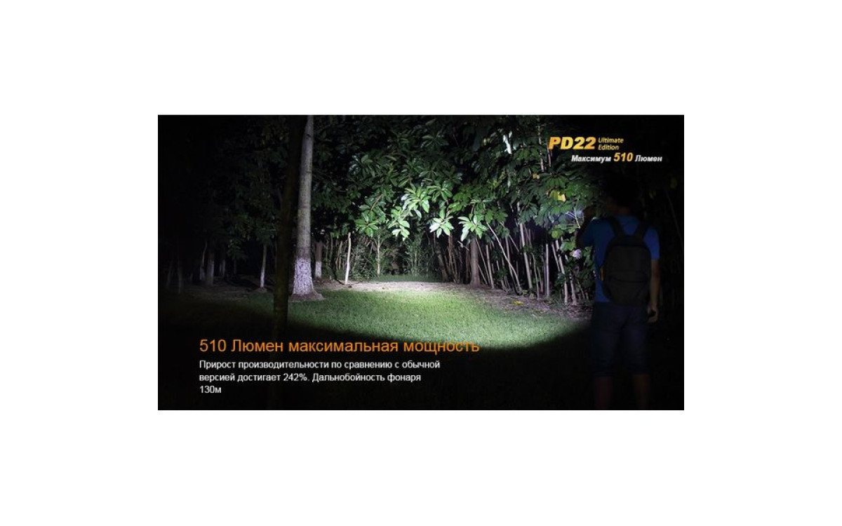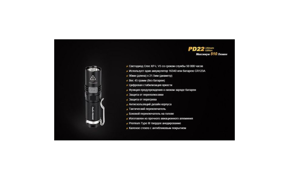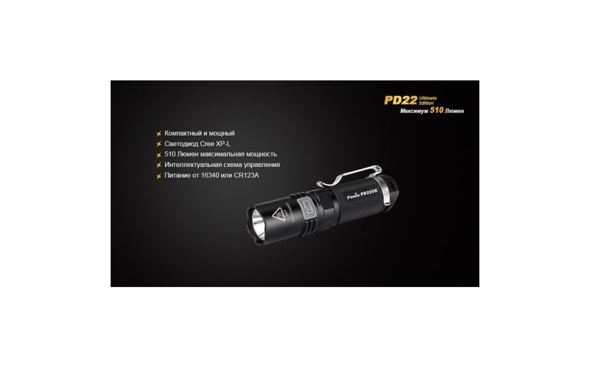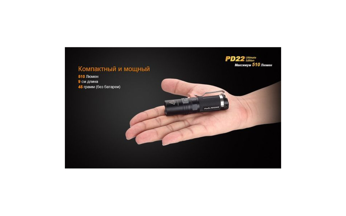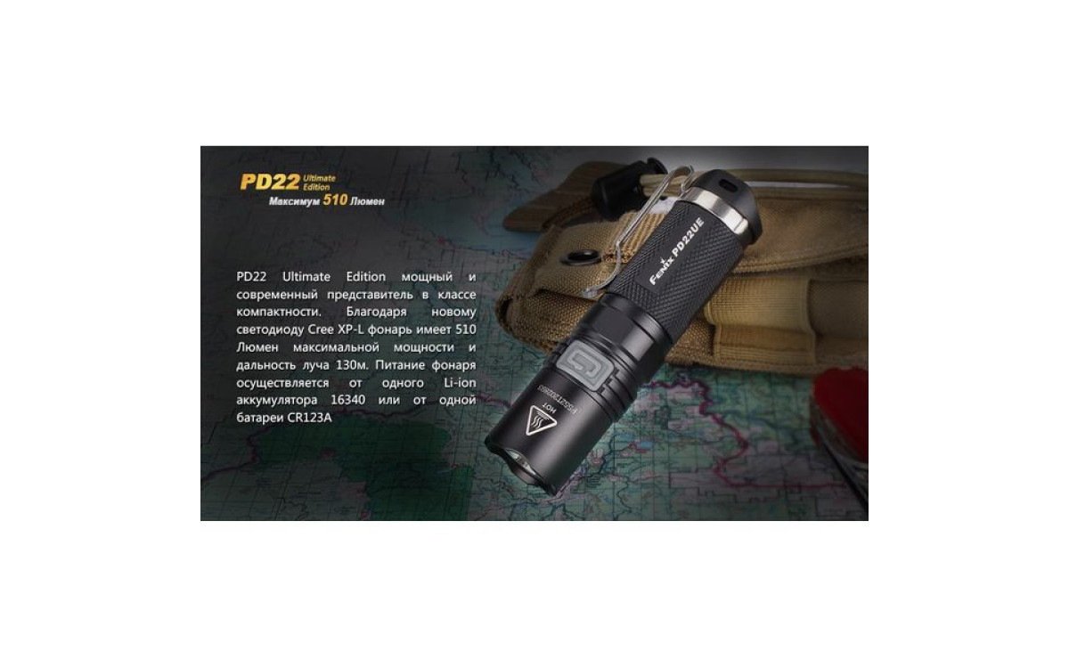 Fenix PD22 UE - это фонарь, который должен быть у каждого любителя люменов. В нем используется новейший светодиод Cree XP-L – однокристальный светодиод с высочайшей эффективностью. PD22 UE поддерживает литиевые батареи CR123A и аккумуляторы 16340 Li-ion. Ослепительная яркость фонаря составляет 510 люмен, а дистанция освещения - 130 метров.