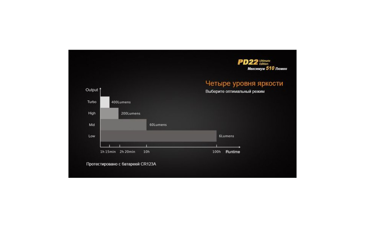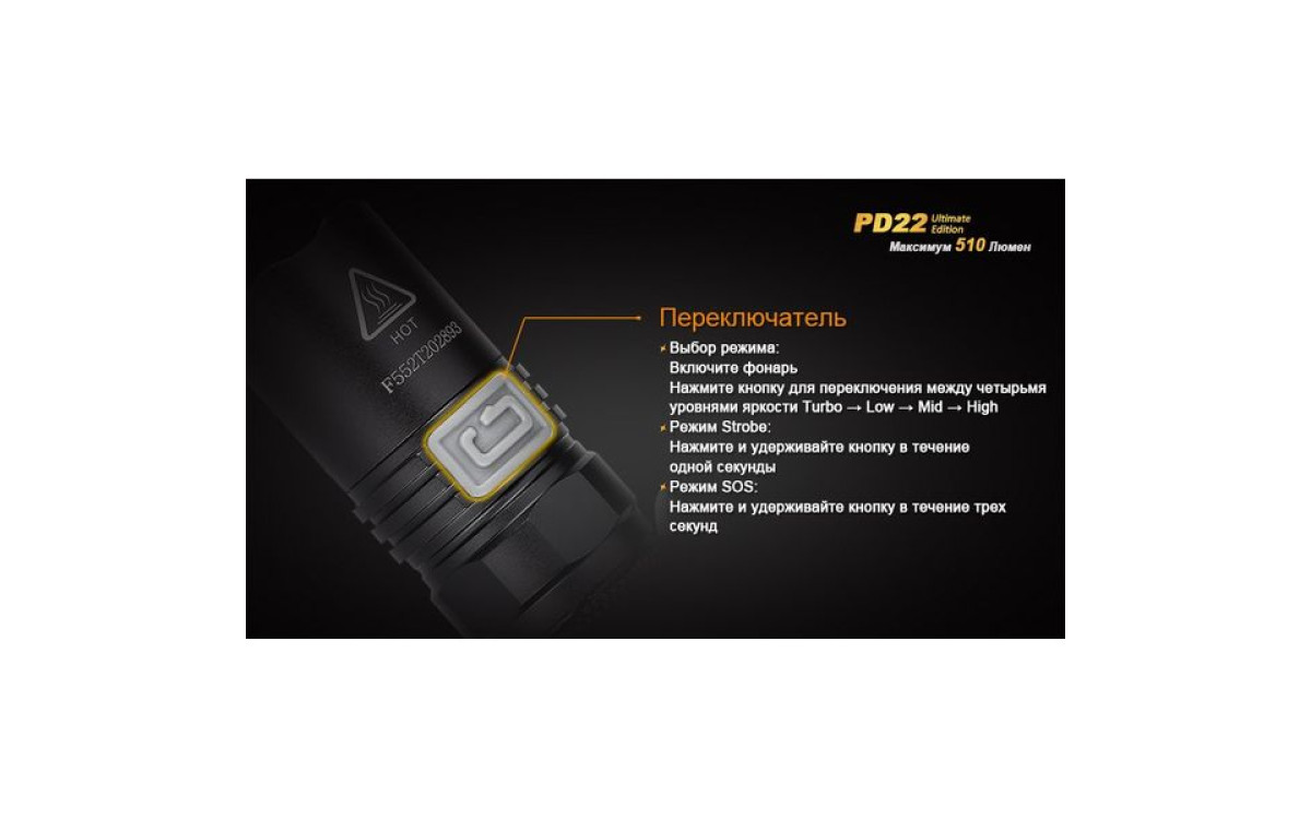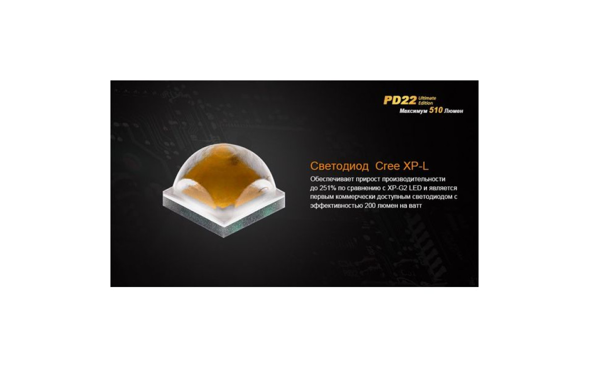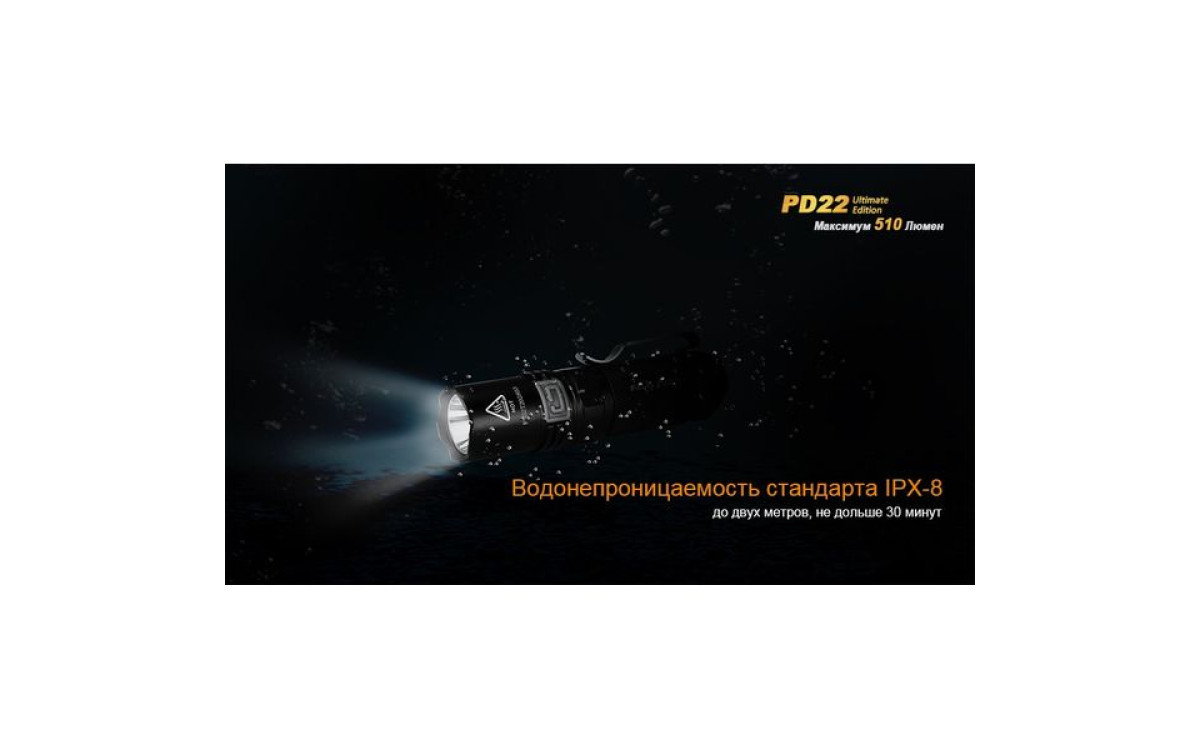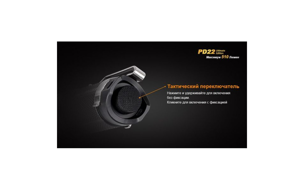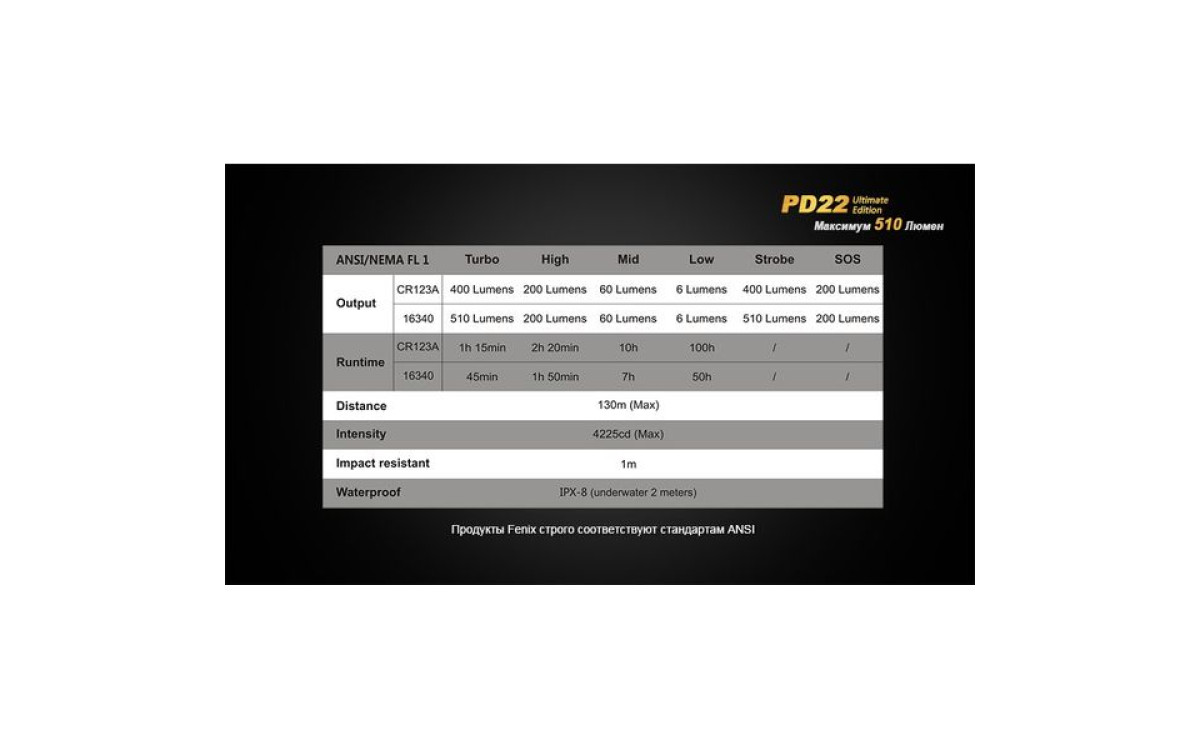 Fenix PD22 UE - это фонарь, который должен быть у каждого любителя люменов. В нем используется новейший светодиод Cree XP-L – однокристальный светодиод с высочайшей эффективностью. PD22 UE поддерживает литиевые батареи CR123A и аккумуляторы 16340 Li-ion. Ослепительная яркость фонаря составляет 510 люмен, а дистанция освещения - 130 метров.