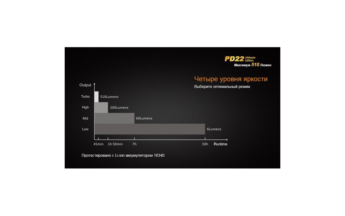 | Режимы и время работы: | турбо максимальный средний минимальный SOS стробоскоп | 510 люмен 200 люмен 60 люмен 6 люмен 200 люмен 510 люмен | 45 минут 1 ч 50 мин 7 часов 50 часов - - |