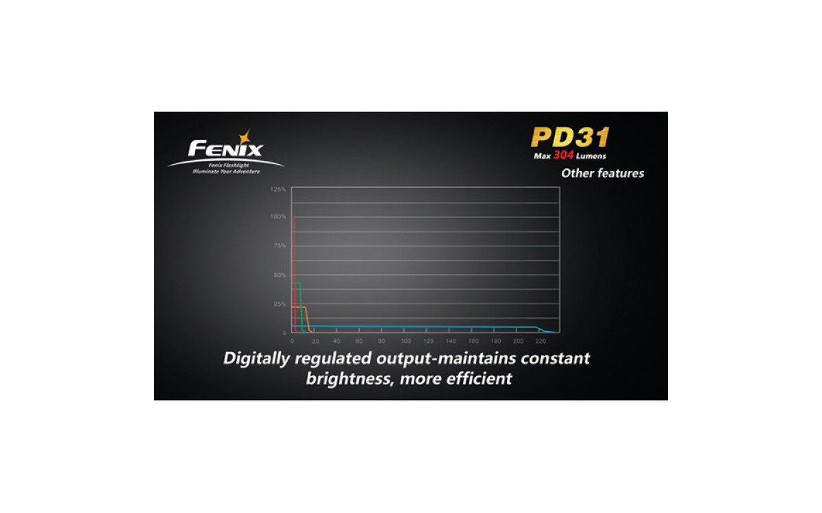 Турбо группа - 2 режима (безель закручен): 304 люмен (2 часа 15 минут) -> Строб сигнал - 304 люмен - Цифровая регулировка для постоянной яркости