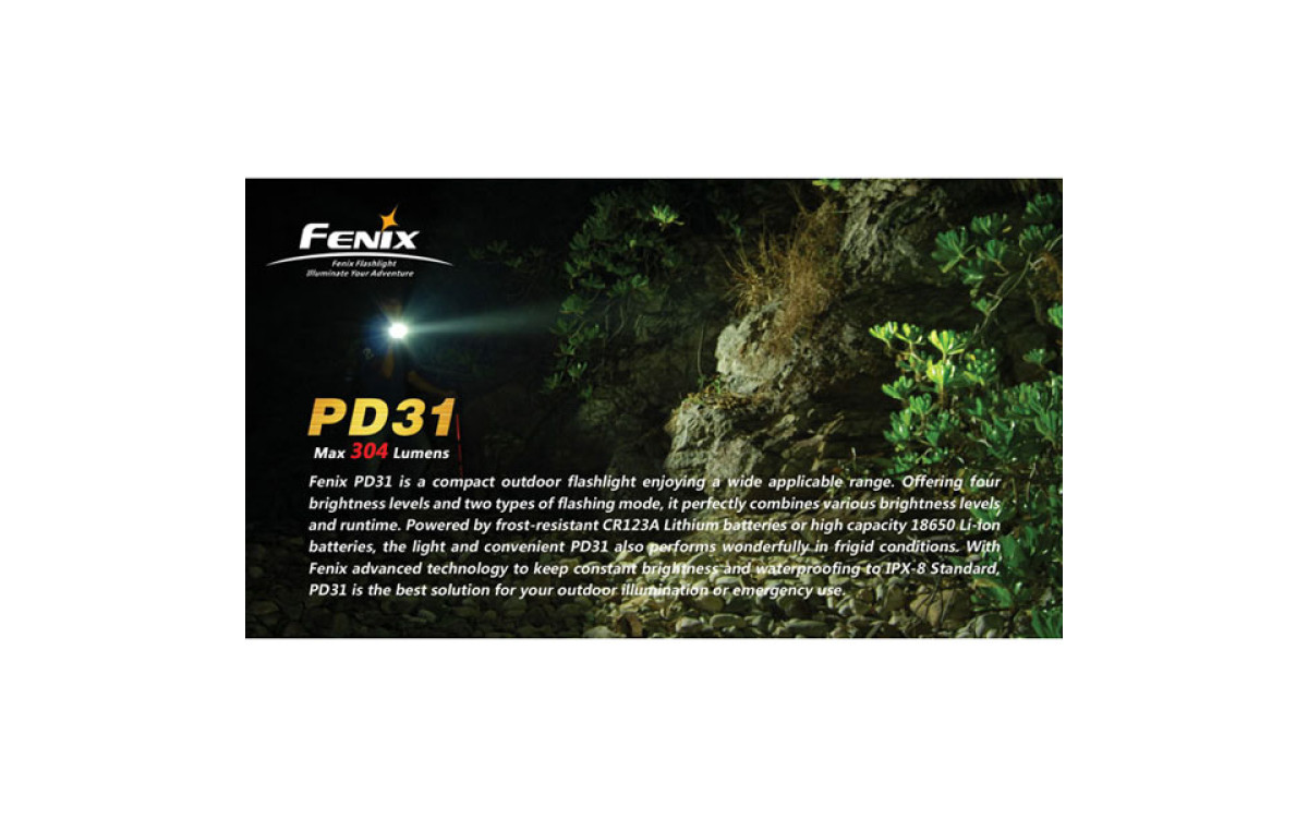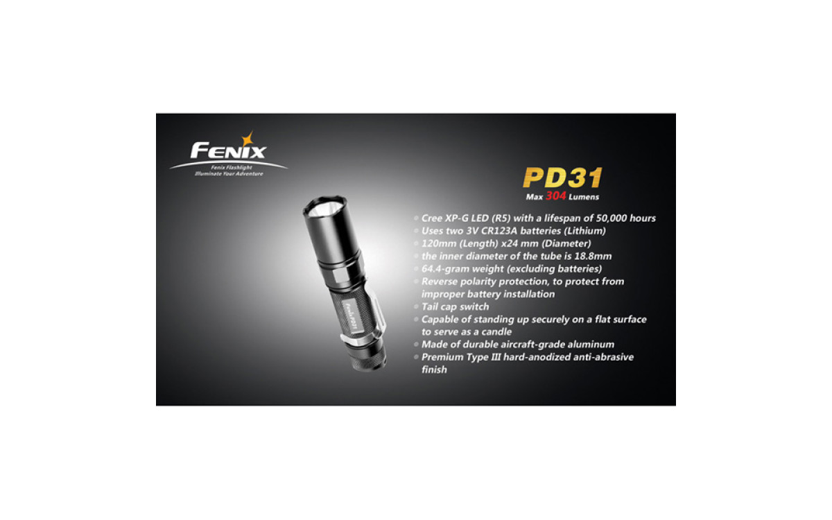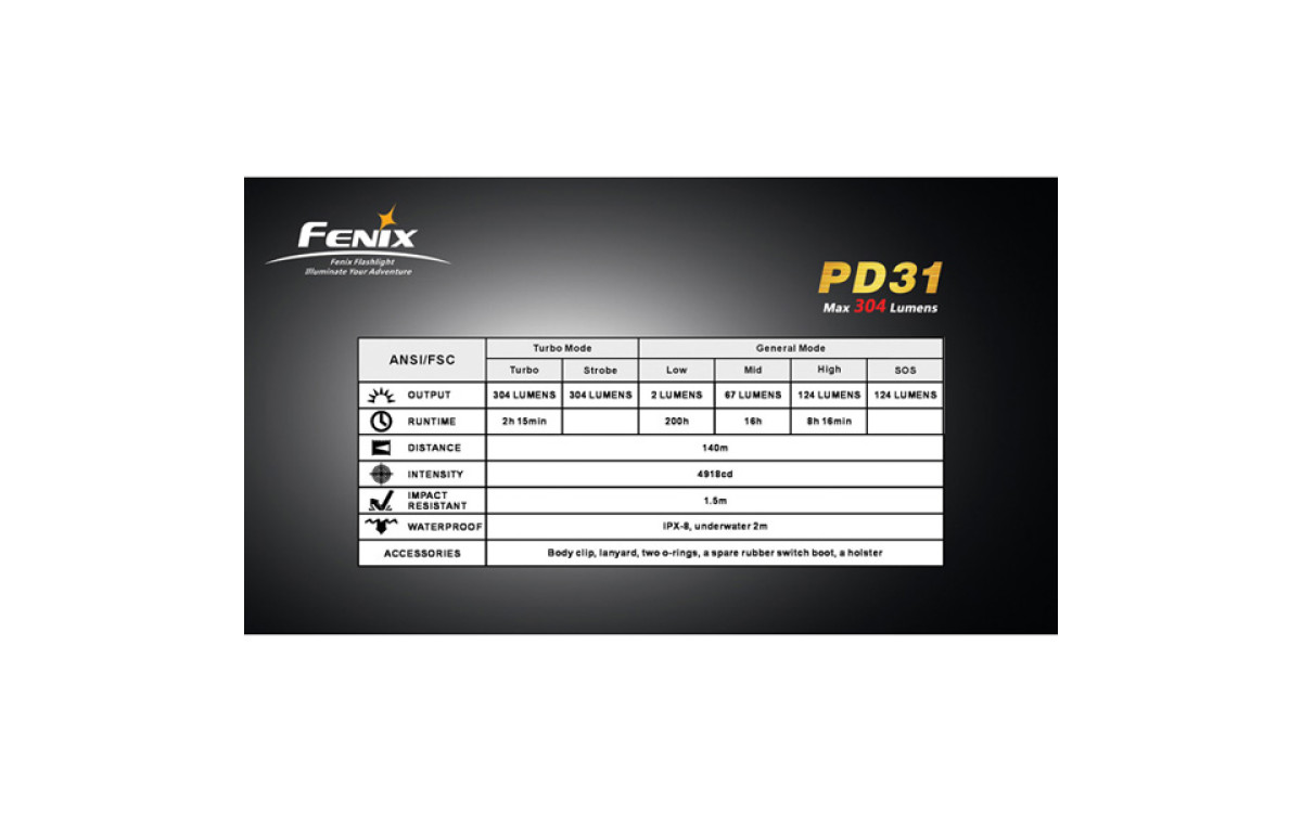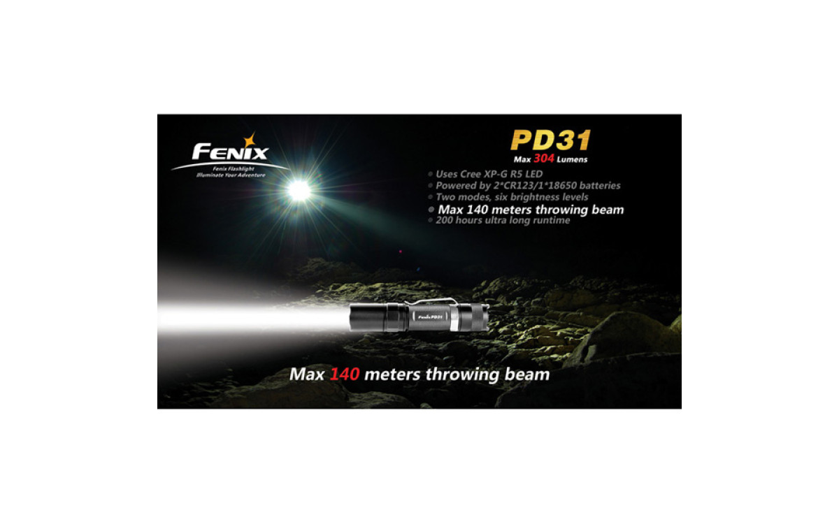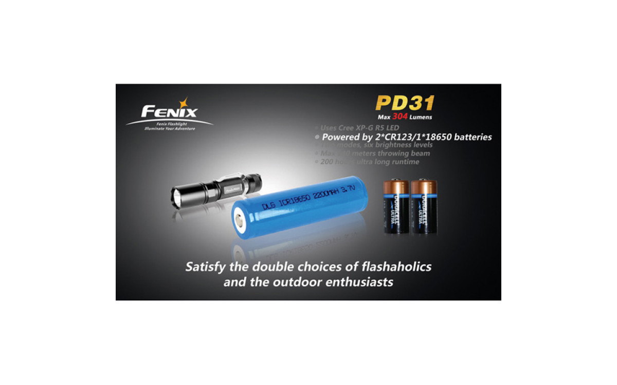 Основные отличия от модели PD30 Premium R5 - максимальная яркость 304 люмена по стандарту ANSI, габаритные размеры, возможность работы от АКБ 18650. Дальность луча - 140 метров. Стандартные аксессуары НЕ подходят. Выпуск модели ограниченный.