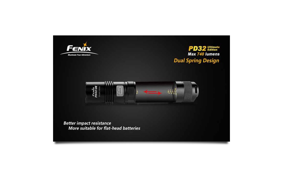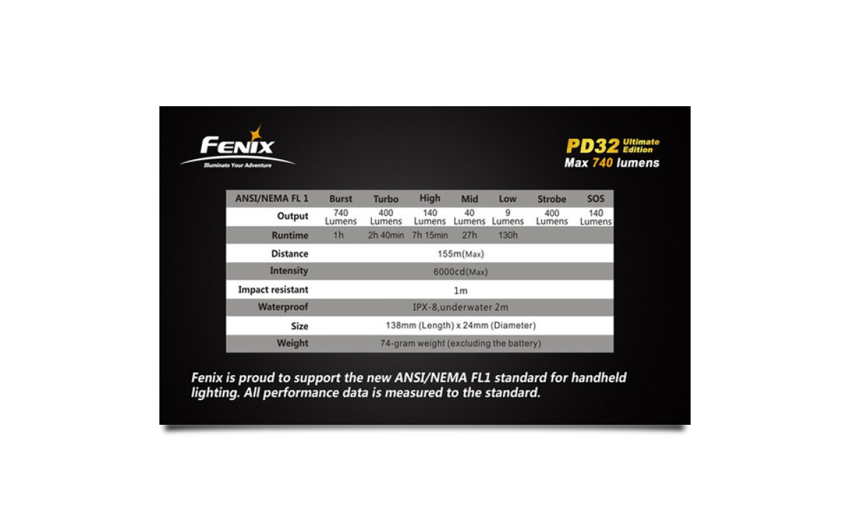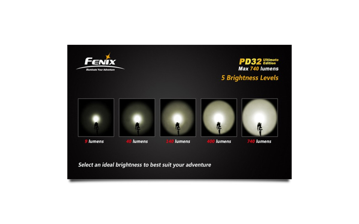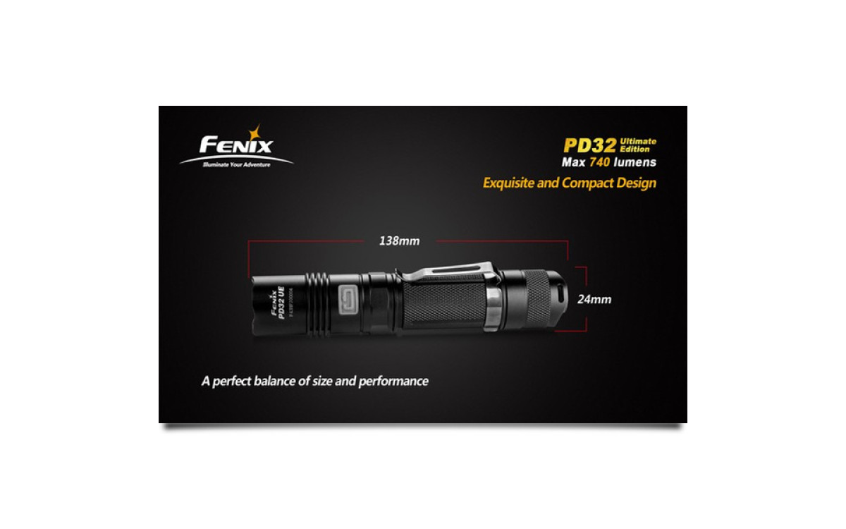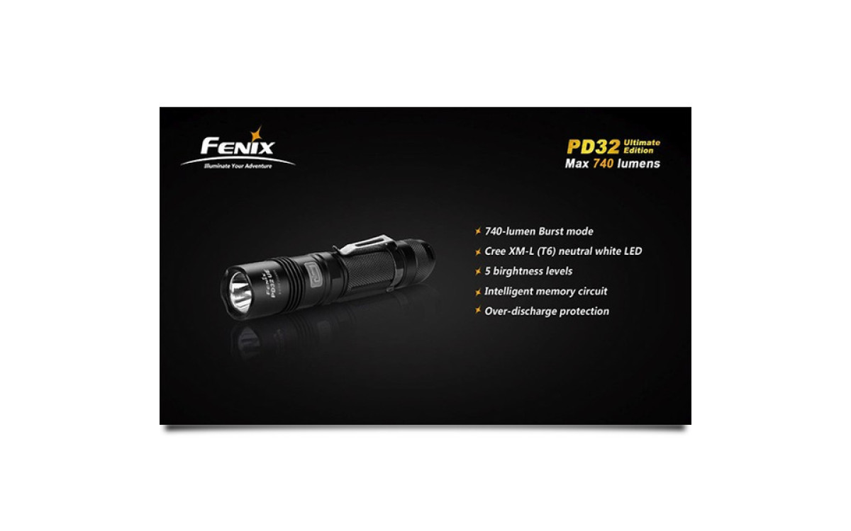 Модель фонаря Fenix PD32 Ultimate Edition при небольших размерах корпуса, обладает серьезной яркостью и функциональностью. В этот осветительный прибор интегрирован современный светодиод Cree XM-L (T6), что и стало залогом его производительности. Этот диод дает свет нейтрально белого цвета, который обеспечивает оптимальную цветопередачу, наиболее достоверно передает объем предмета и позволяет верно оценить расстояние до него. Заявленный производителями рабочий потенциал в 50 000 говорит о способности диода работать порядка 5,7 лет без перерыва. Яркость света, которую он воспроизводит, можно выбрать в диапазоне от 9 до 740 люмен. Фонарь работает в 7 разных режимах постоянного и мигающего света.