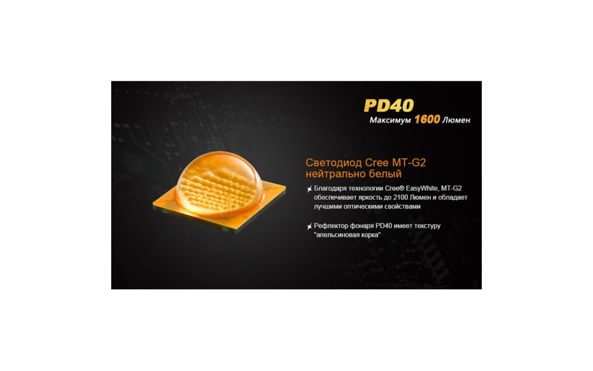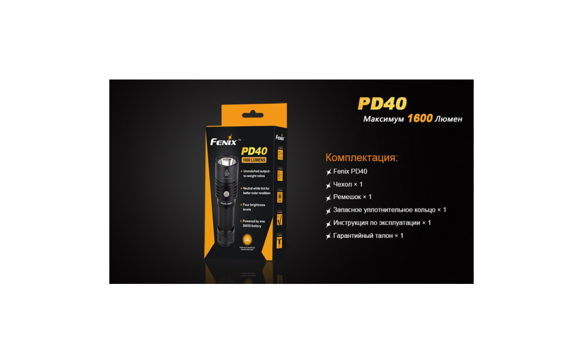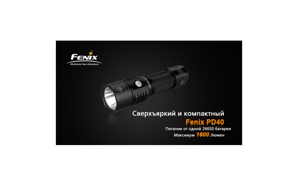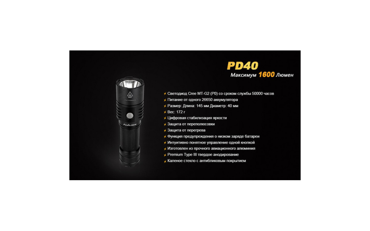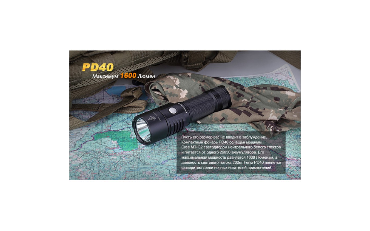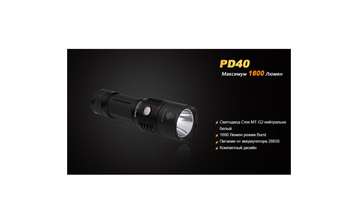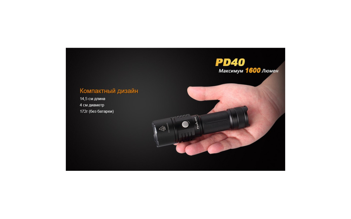 PD40 — это ручной фонарь, который может похвастаться наилучшим соотношением яркости и веса среди фонарей Fenix. Оснащенный мощным светодиодом Cree MT-G2, при работе от одного емкого аккумулятора 26650 Li-ion, PD40 обладает яркостью 1600 люмен и дальностью луча 200 метров. Этот фонарь в 14.5 сантиметровом корпусе — новый фаворит среди поклонников фонарей и искателей ночных приключений.