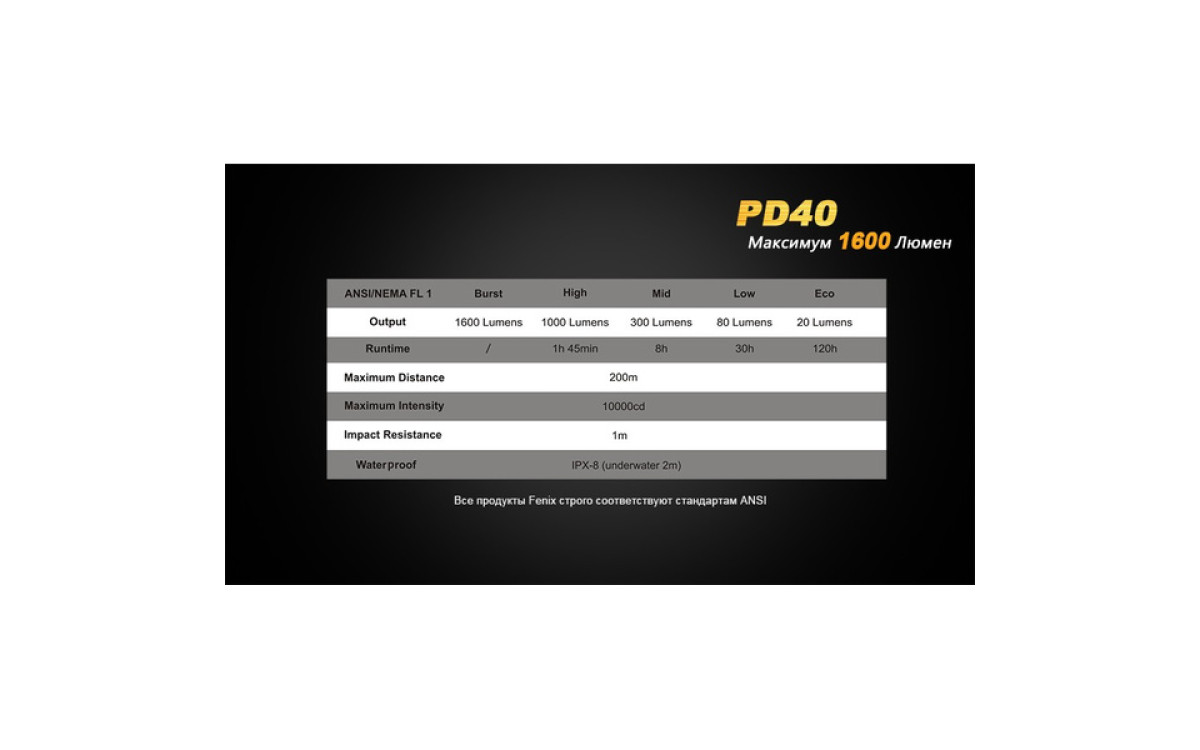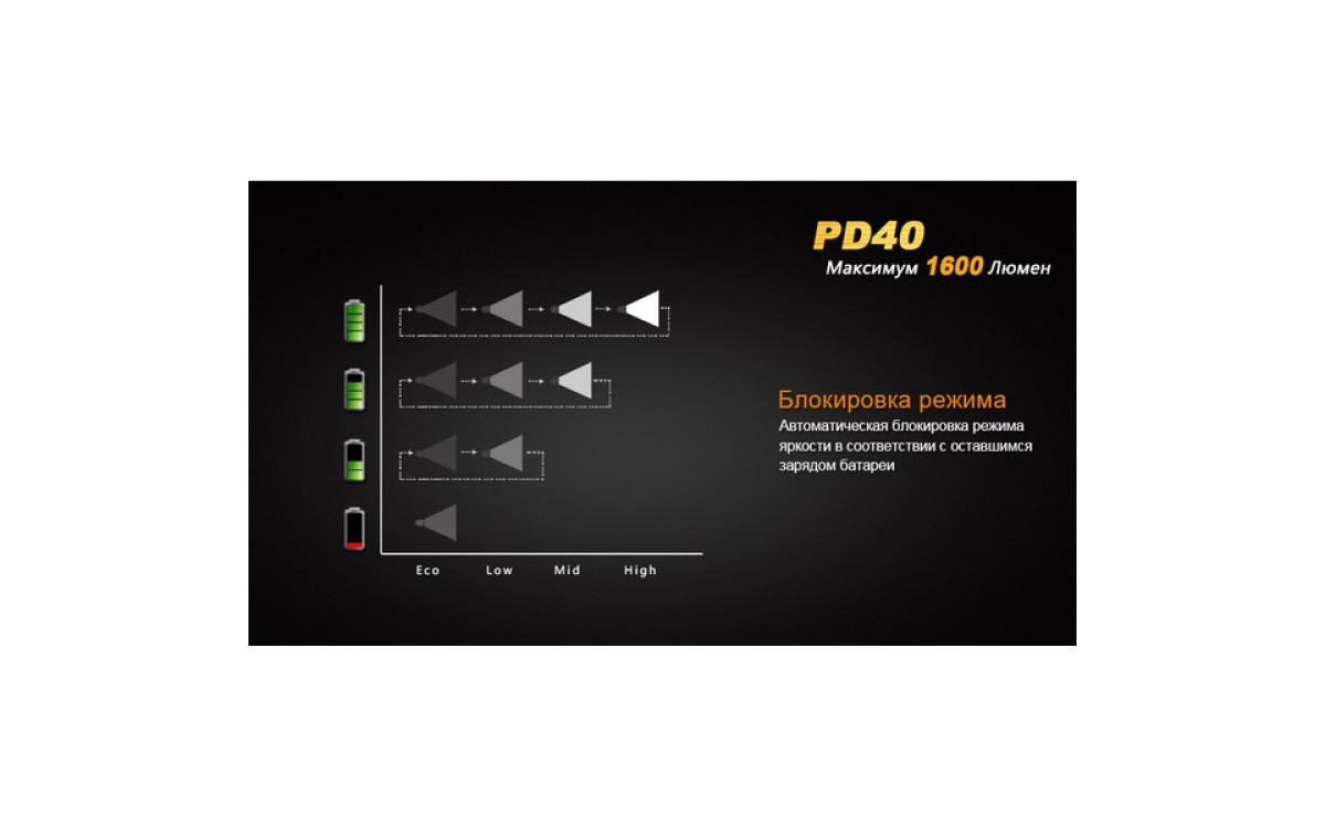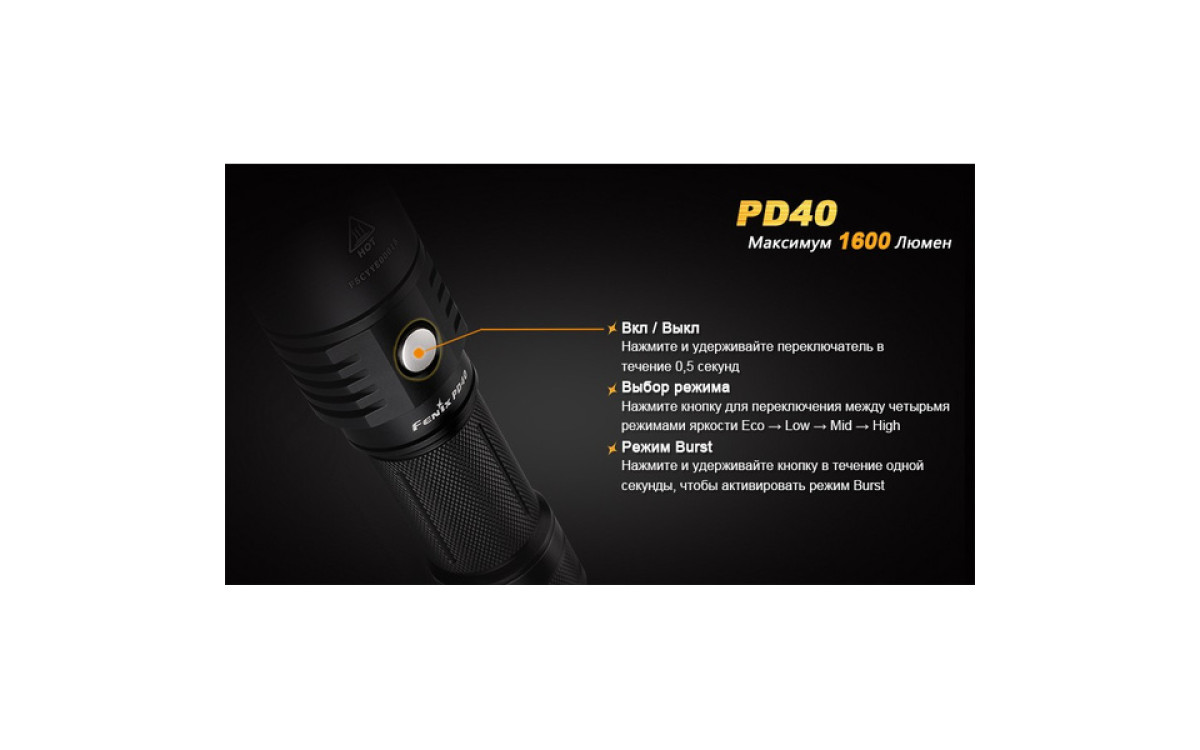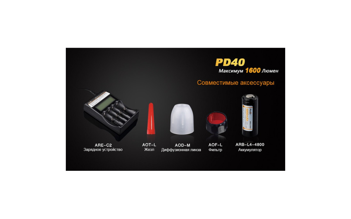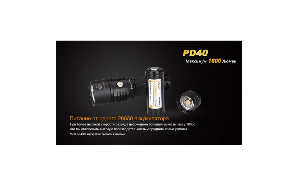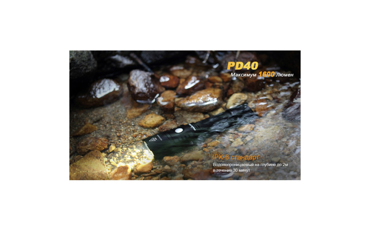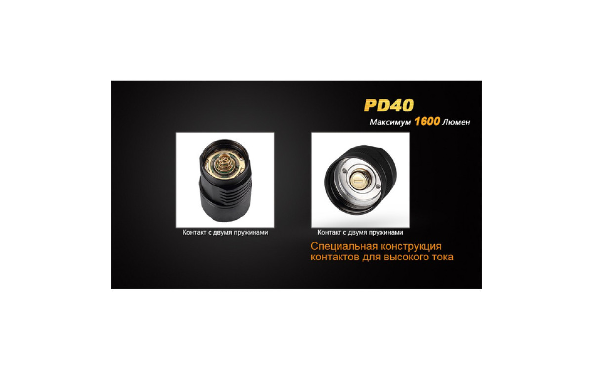 PD40 — это ручной фонарь, который может похвастаться наилучшим соотношением яркости и веса среди фонарей Fenix. Оснащенный мощным светодиодом Cree MT-G2, при работе от одного емкого аккумулятора 26650 Li-ion, PD40 обладает яркостью 1600 люмен и дальностью луча 200 метров. Этот фонарь в 14.5 сантиметровом корпусе — новый фаворит среди поклонников фонарей и искателей ночных приключений.
