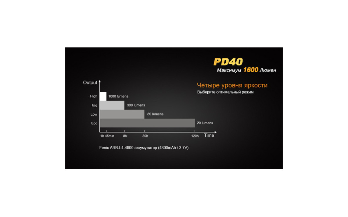 | Режимы и время работы: | burst максимальный средний минимальный экономичный | 1600 люмен 1000 люмен 300 люмен 80 люмен 20 люмен | - 1 ч 45 мин 8 часов 30 часов 120 часов |