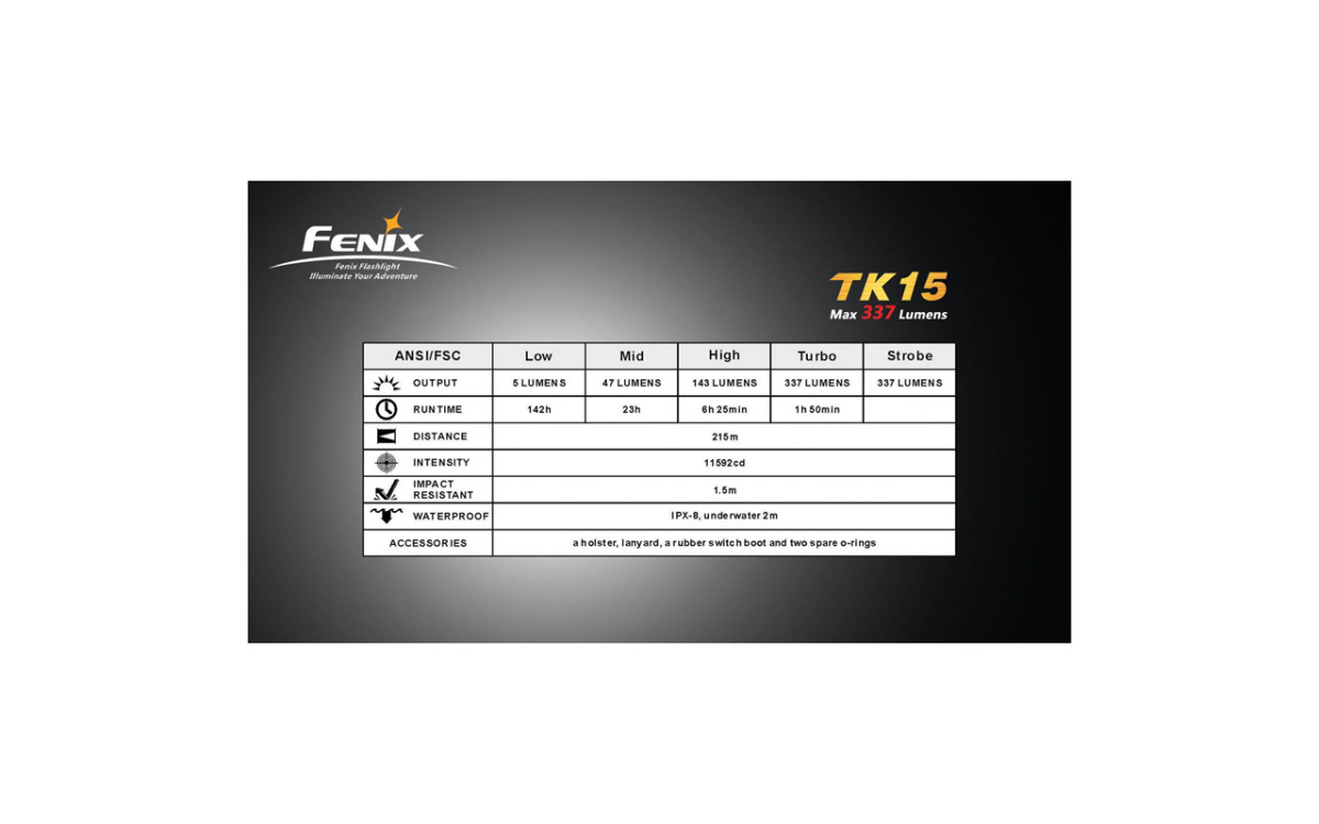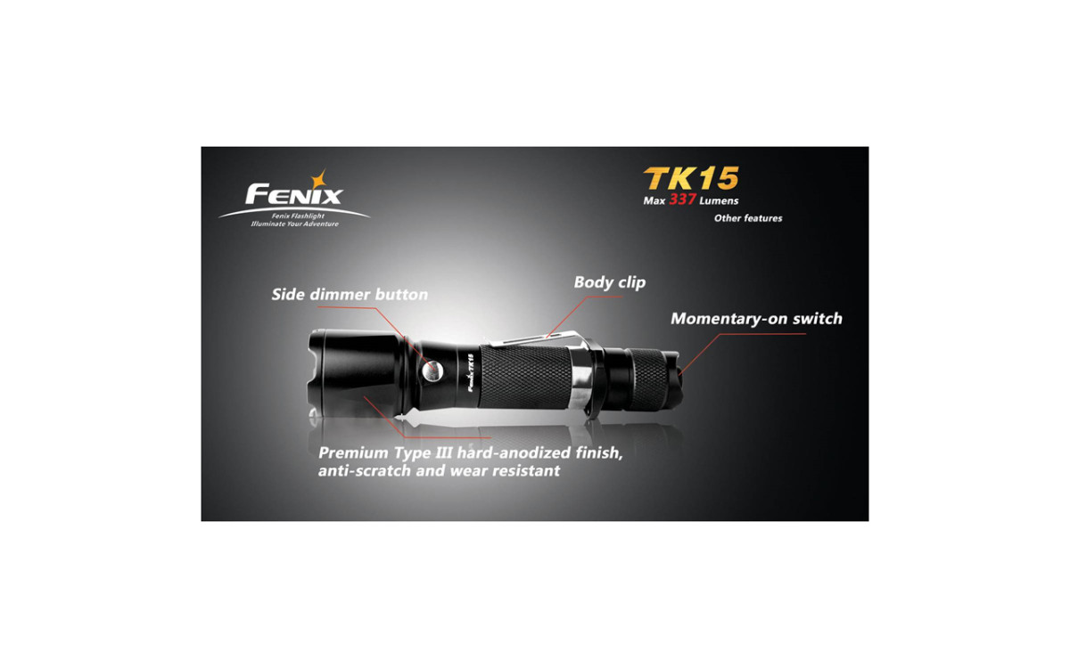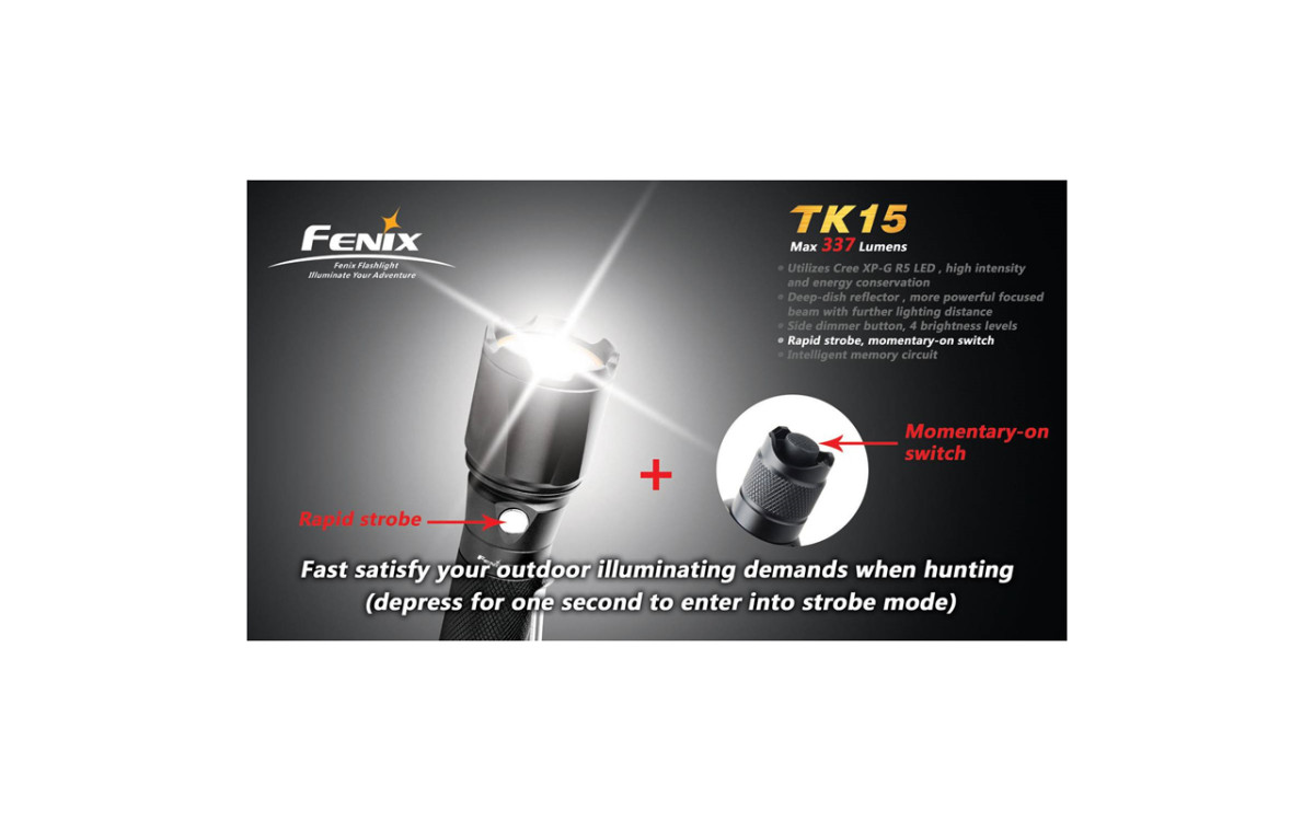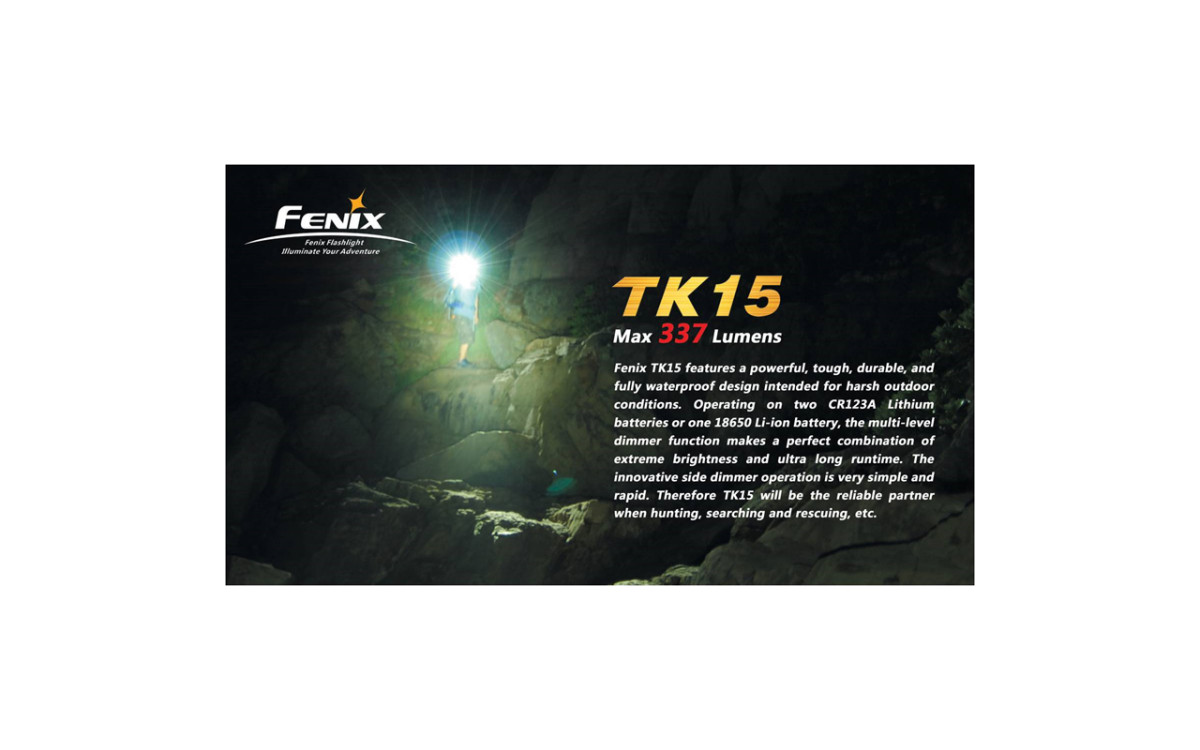 Надежный, мощный, практичный и водонепроницаемый тактический фонарь Fenix TK15 лучше всего оценят охотники. Его можно установить на оружие (отдача не страшна) и подсоединить выносную кнопку. Фонарь работает от двух литиевых батареек типа CR123A или от аккумуляторов.