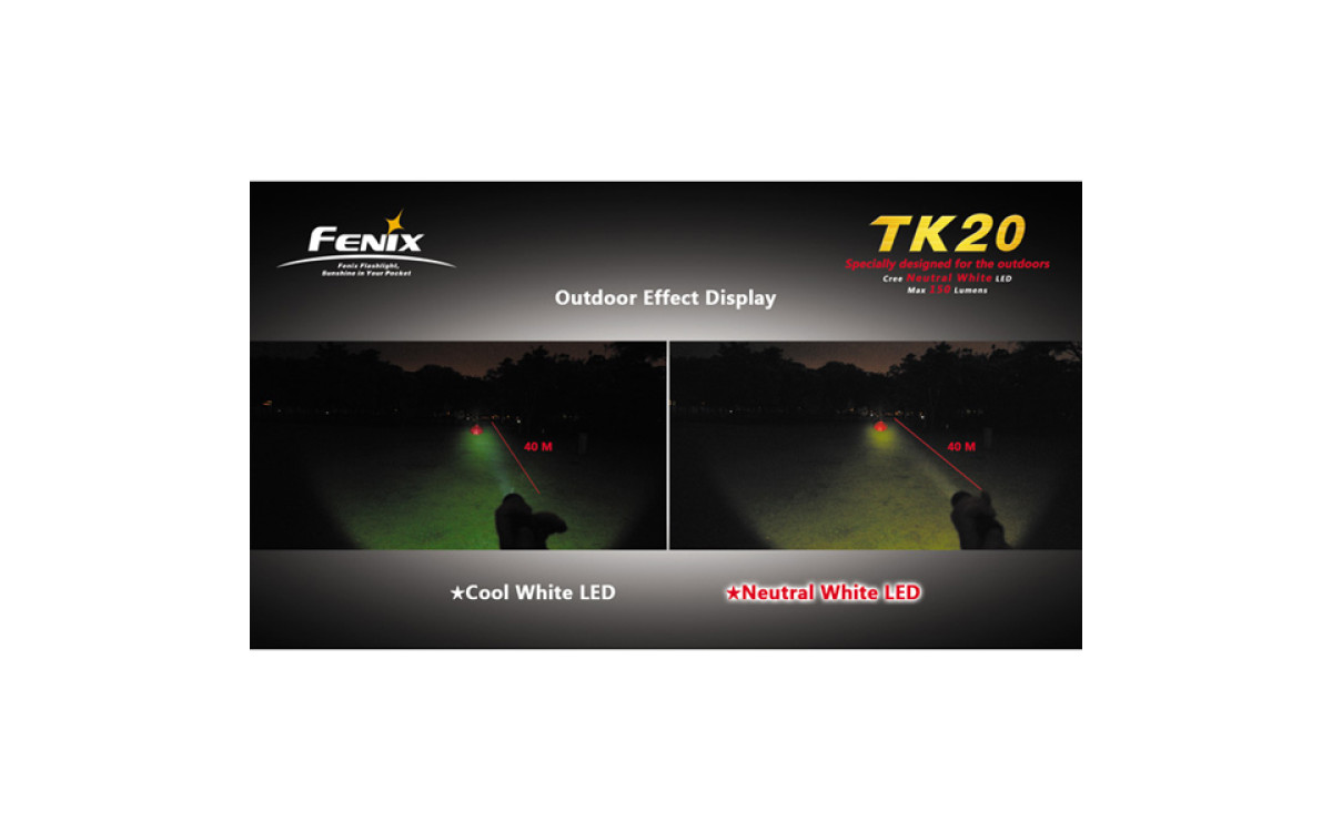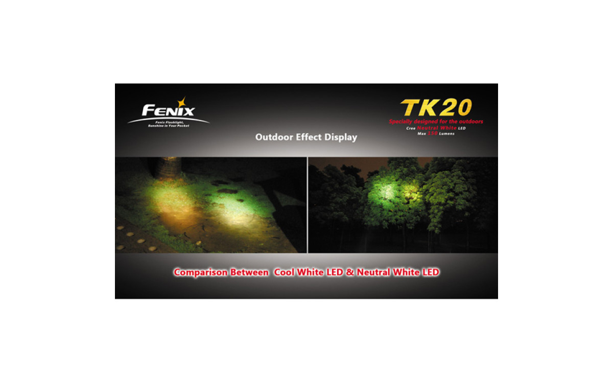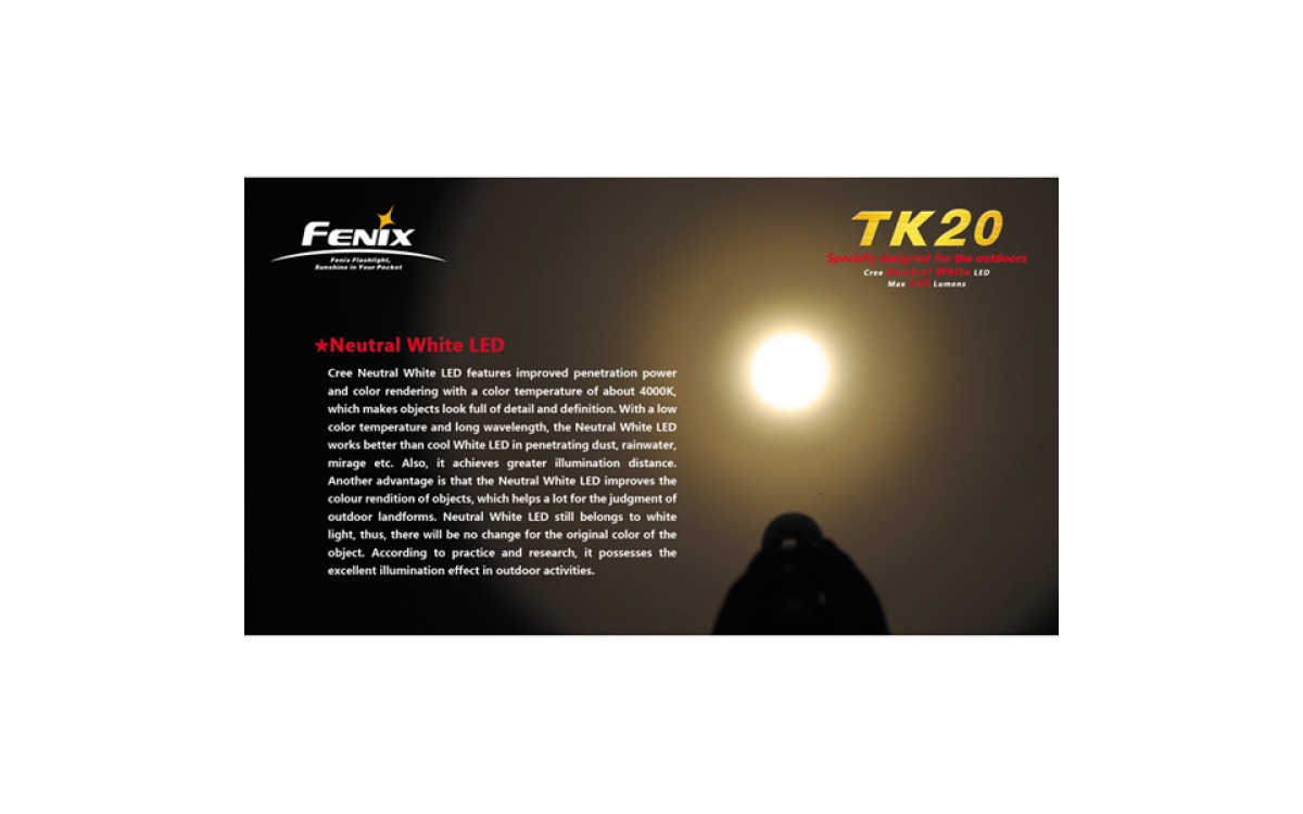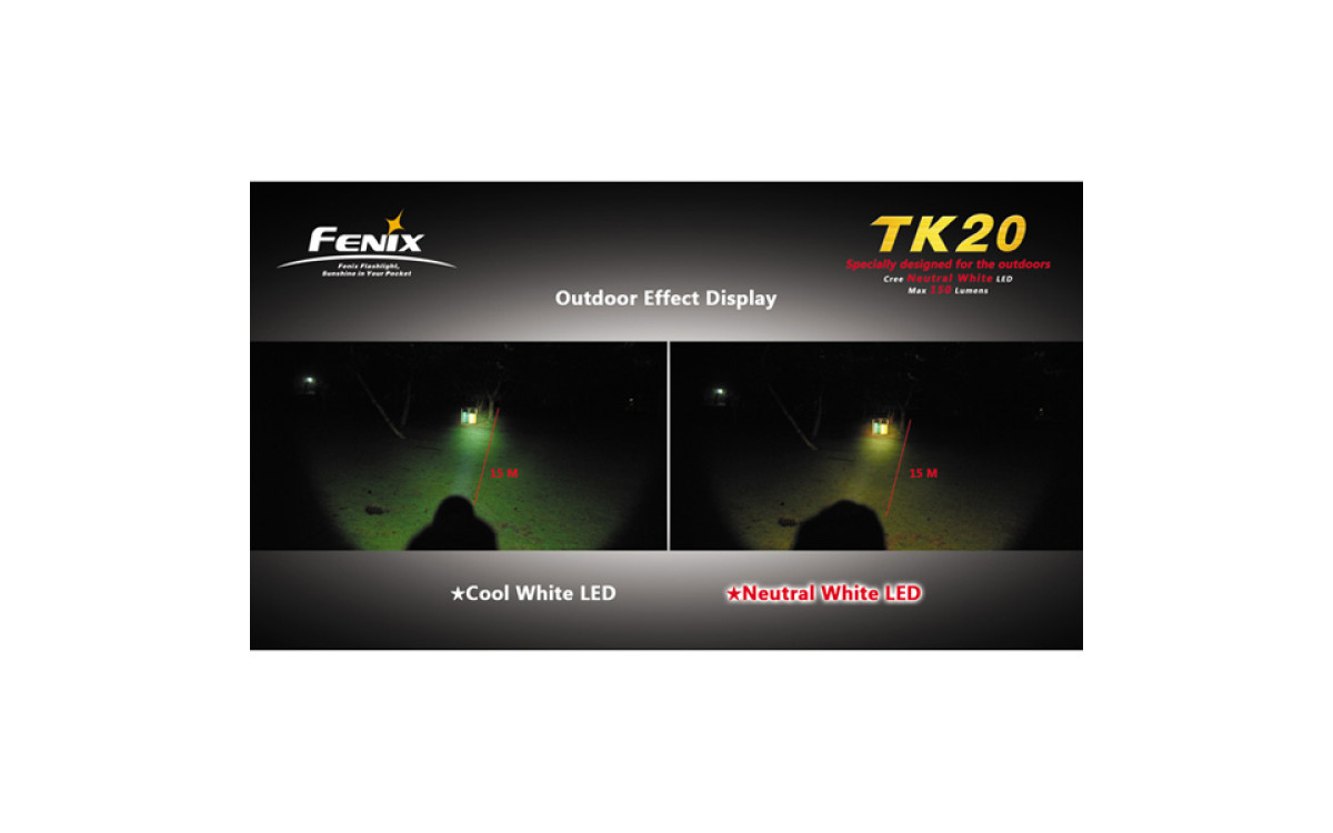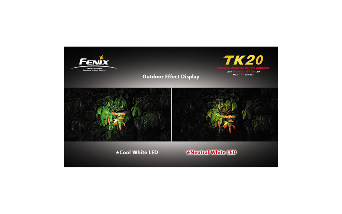 Нейтральный белый свет (цветовая температура около 4000К) фонаря Fenix TK20 не искажает естественные цвета объектов, поскольку он ближе к естественному дневному. Фонарь будет лучше освещать в условиях дождя , тумана или в пыли. Кроме того увеличивается дальность освещения - 150 метров при яркости в 150 люмен.