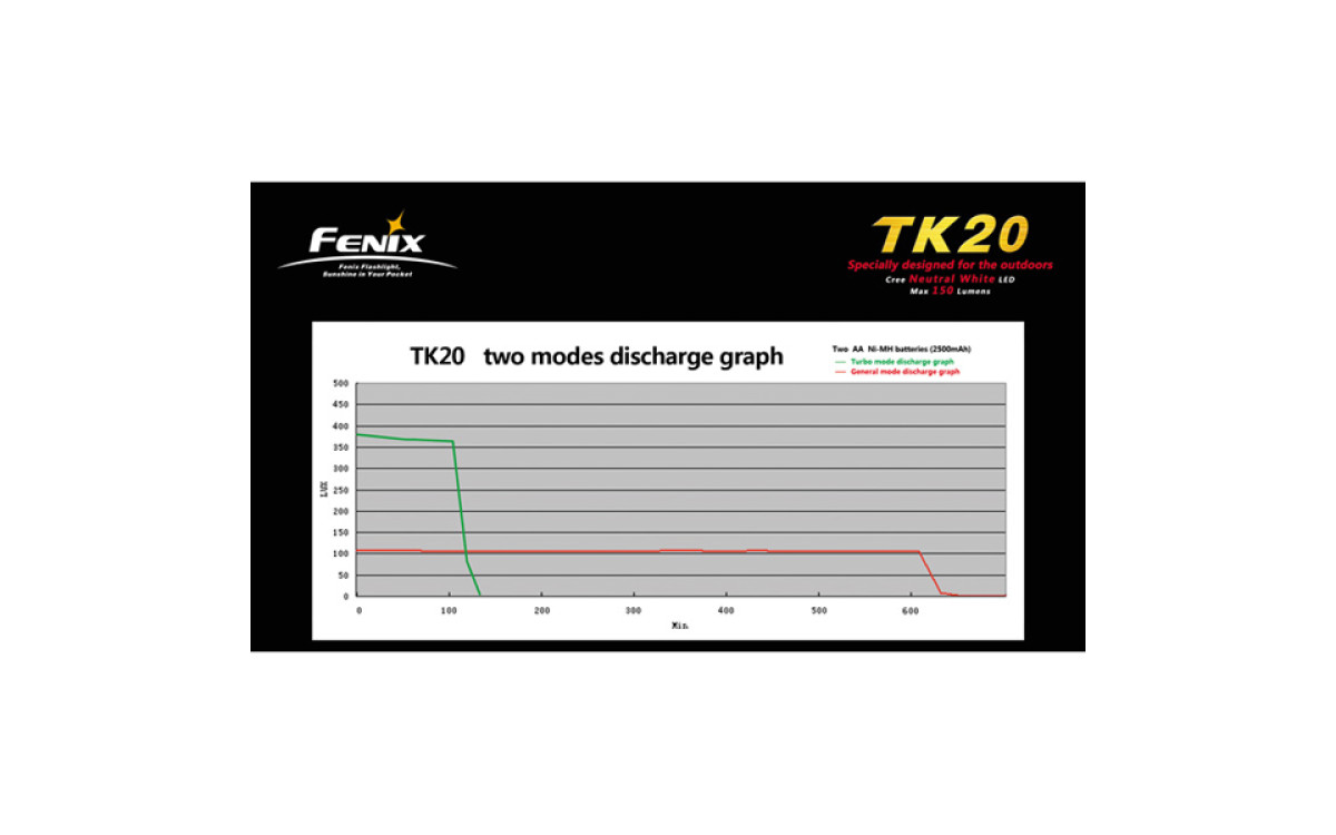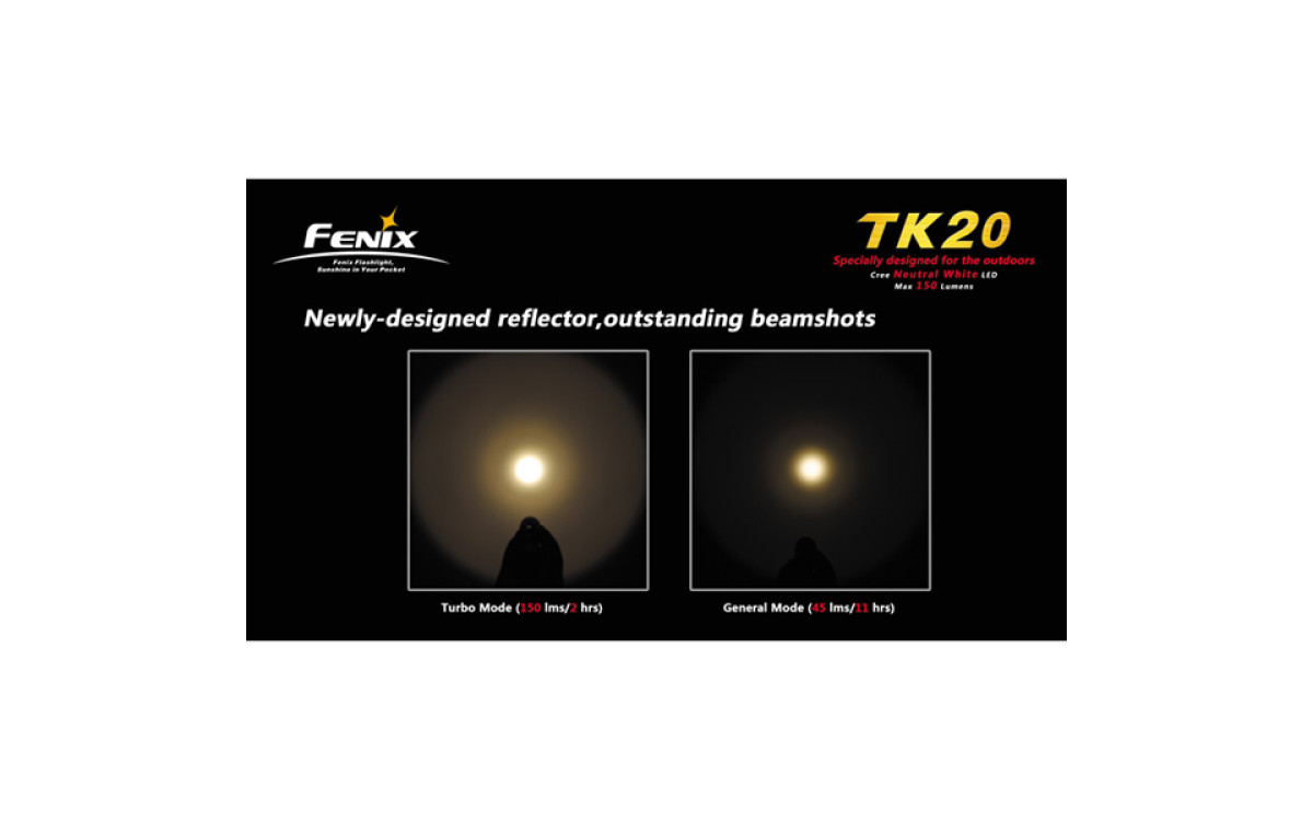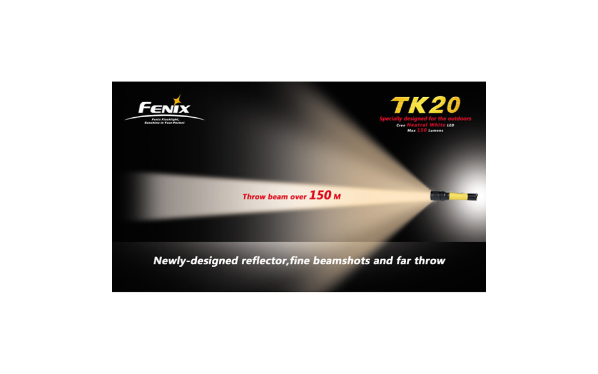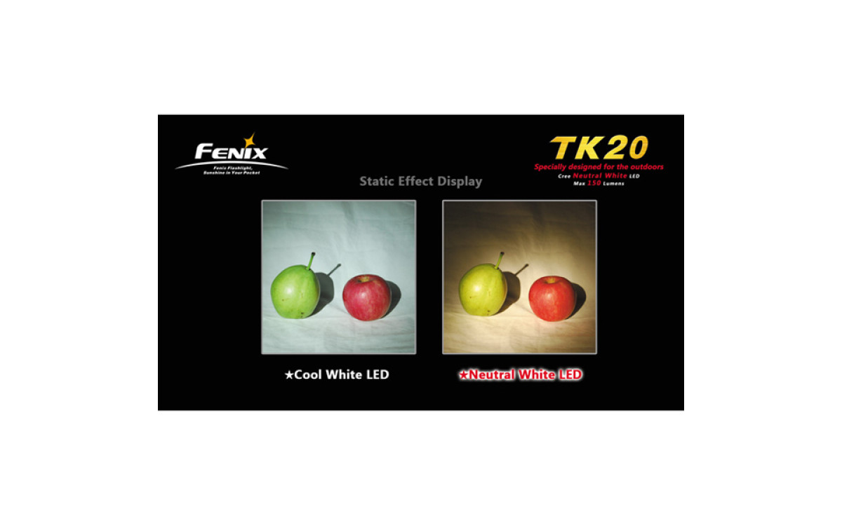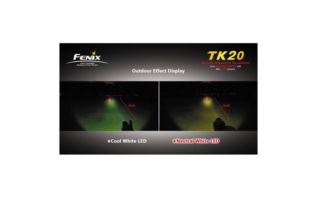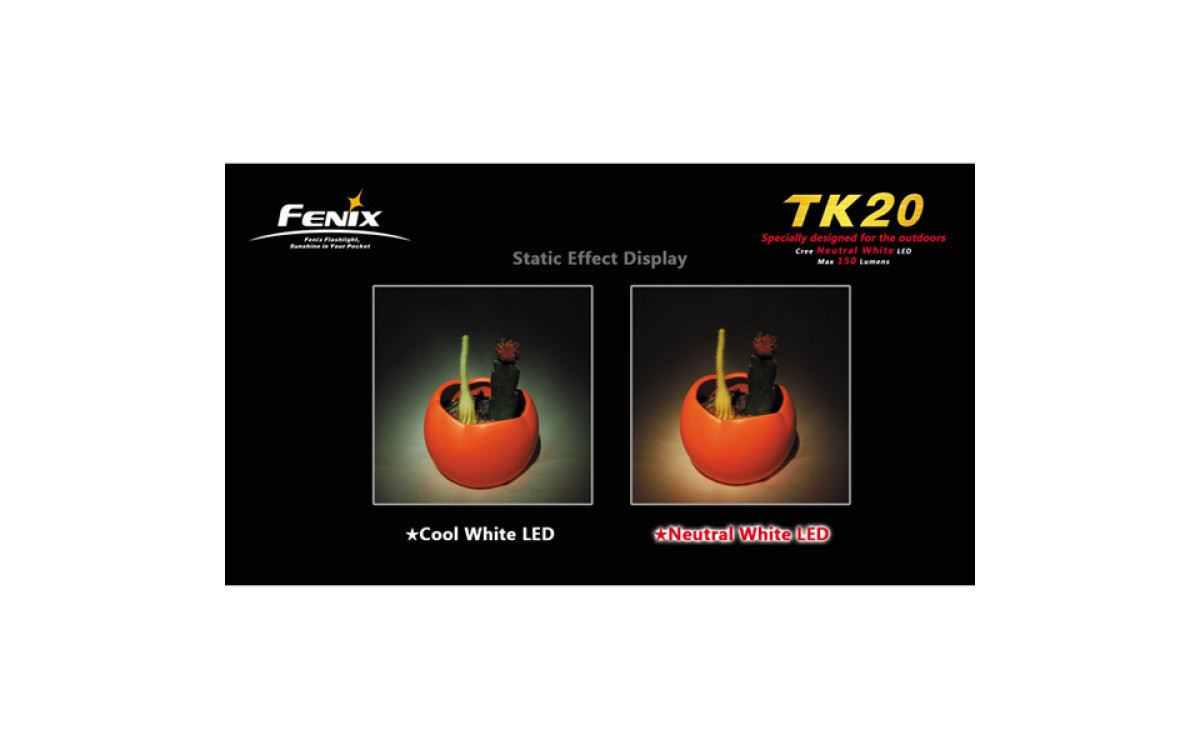 Нейтральный белый свет (цветовая температура около 4000К) фонаря Fenix TK20 не искажает естественные цвета объектов, поскольку он ближе к естественному дневному. Фонарь будет лучше освещать в условиях дождя , тумана или в пыли. Кроме того увеличивается дальность освещения - 150 метров при яркости в 150 люмен.