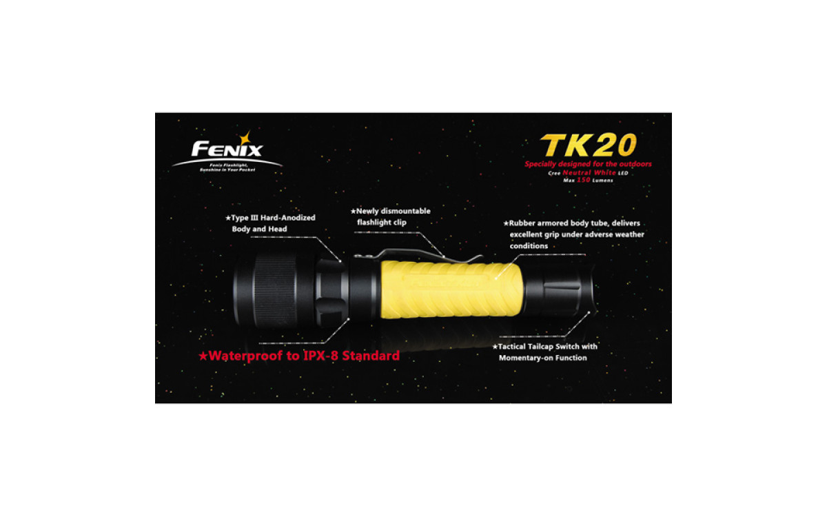 Водонепроницаемый и противоударный корпус TK20 сделан из анодированного алюминия и имеет резиновую накладку на рукоятке. Он лучше всего подойдет для любителей активного отдыха на природе.