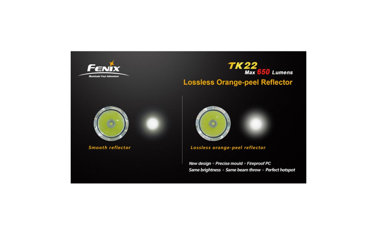 Фонарь с уникальной оптической системой, в которой не происходит потери мощности светового потока из-за текстуры отражателя, при этом качество луча сопоставимо с текстурированным отражателем, а дальнобойность с гладким.