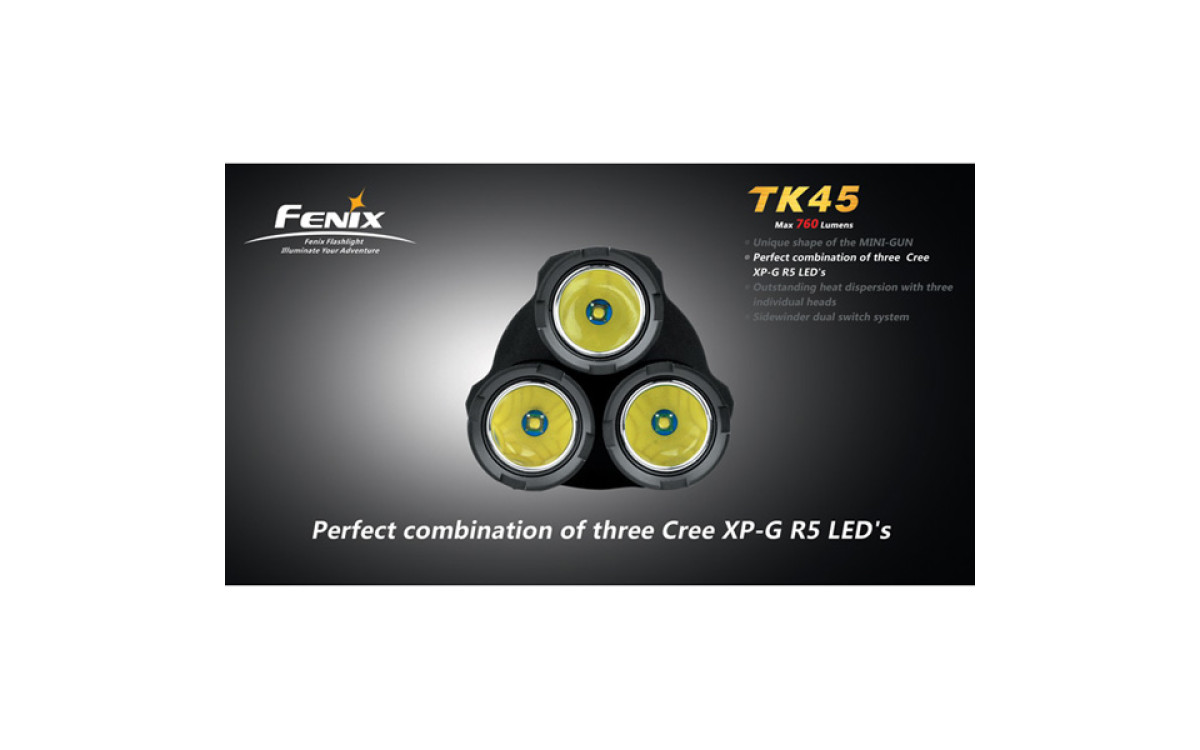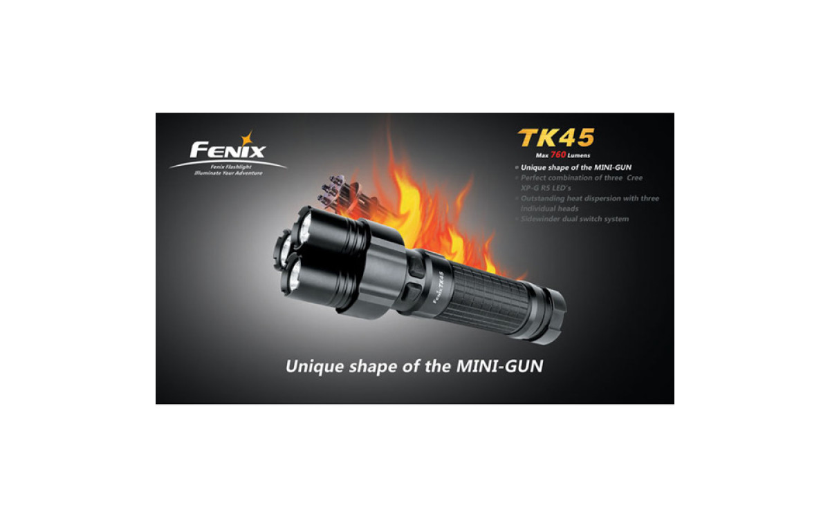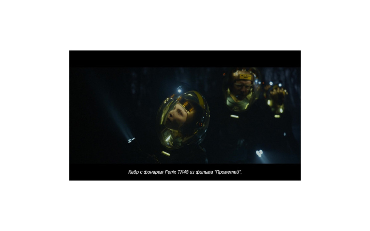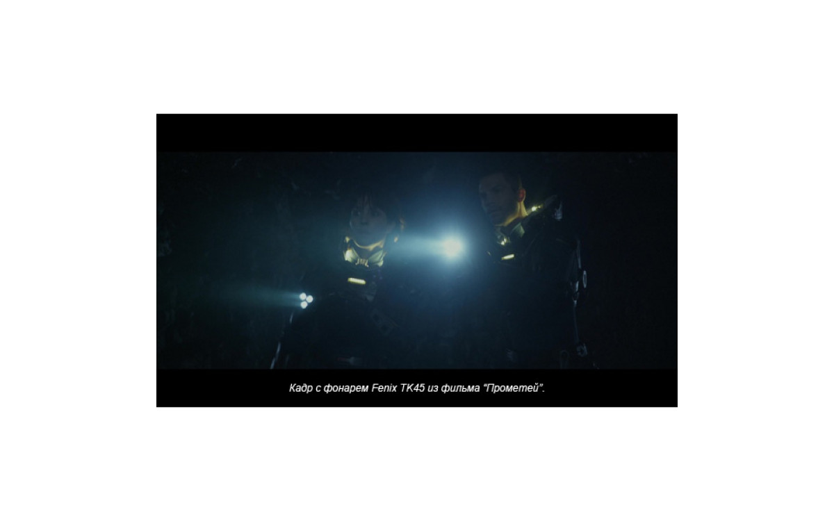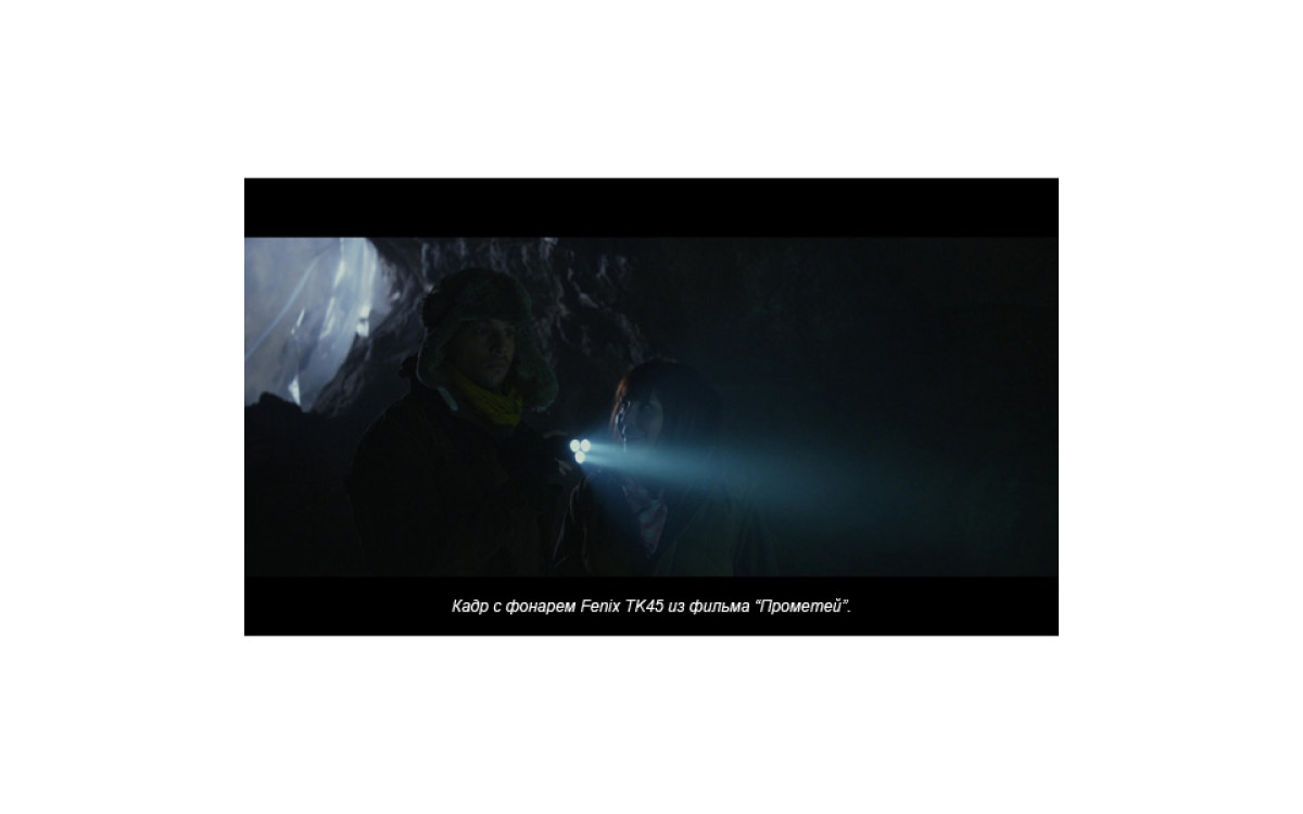 Fenix TК45 — необычный фонарь с тремя светодиодными «стволами» и исключительной яркости 760 люмен, сравнимой с автомобильной фарой. Вероятно, именно за счет своей необычной формы, он был выбран режиссером Ридли Скоттом для съемок фильма «Прометей».