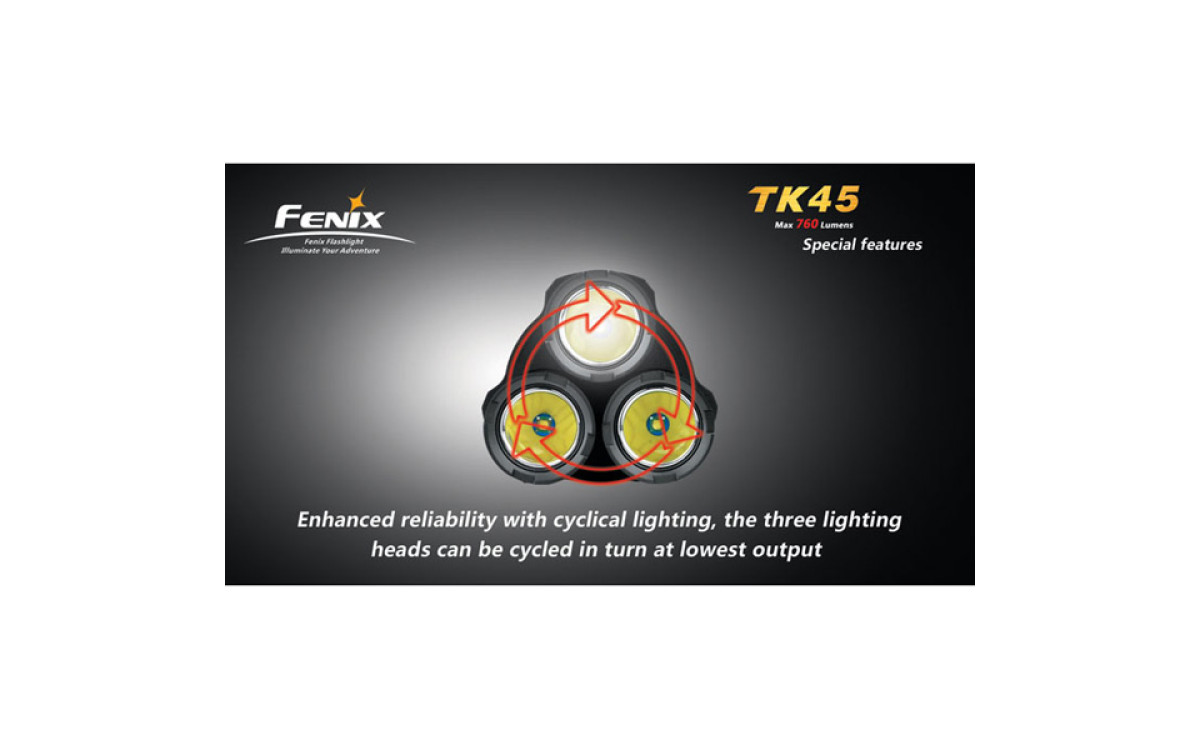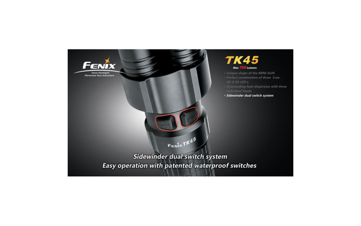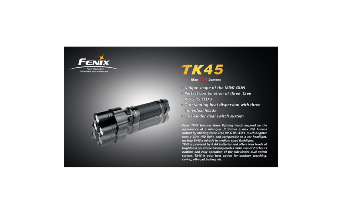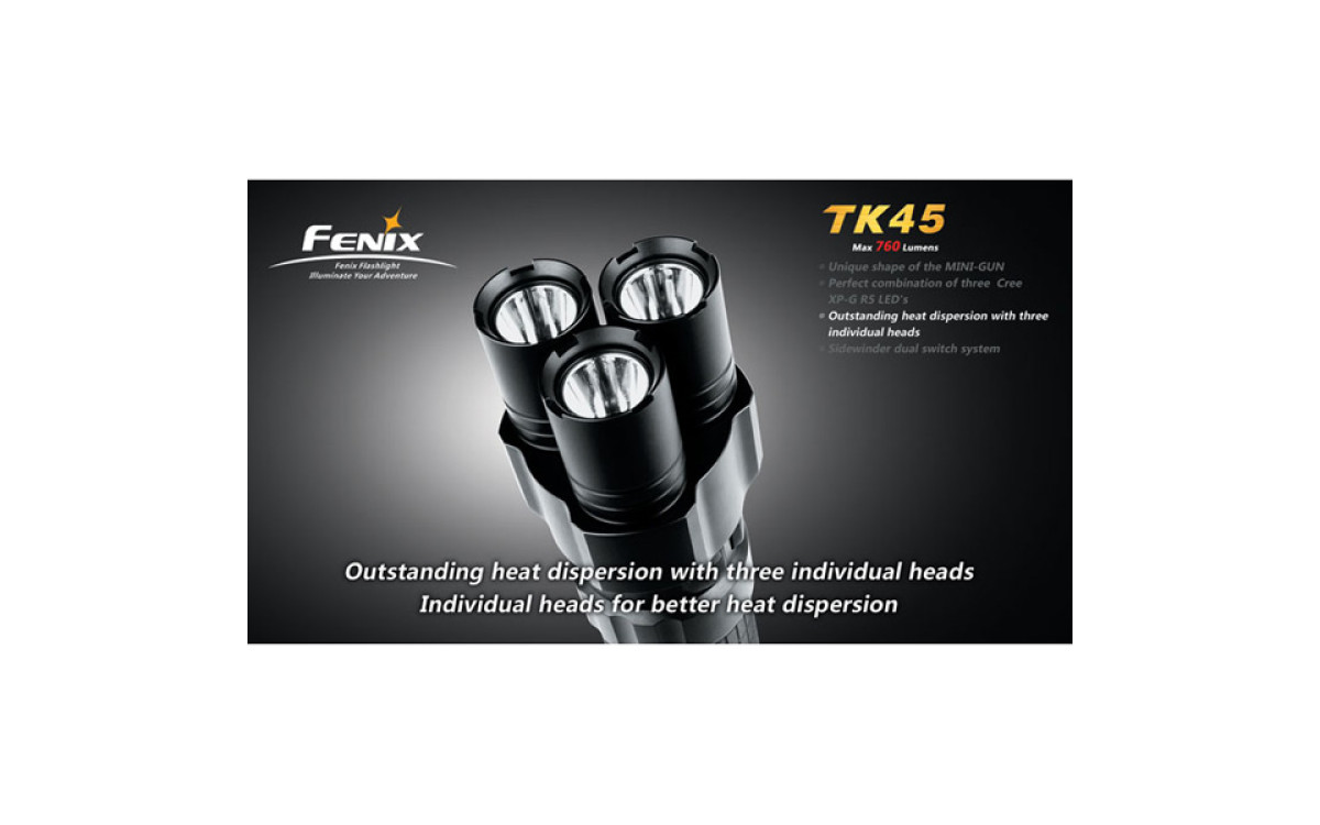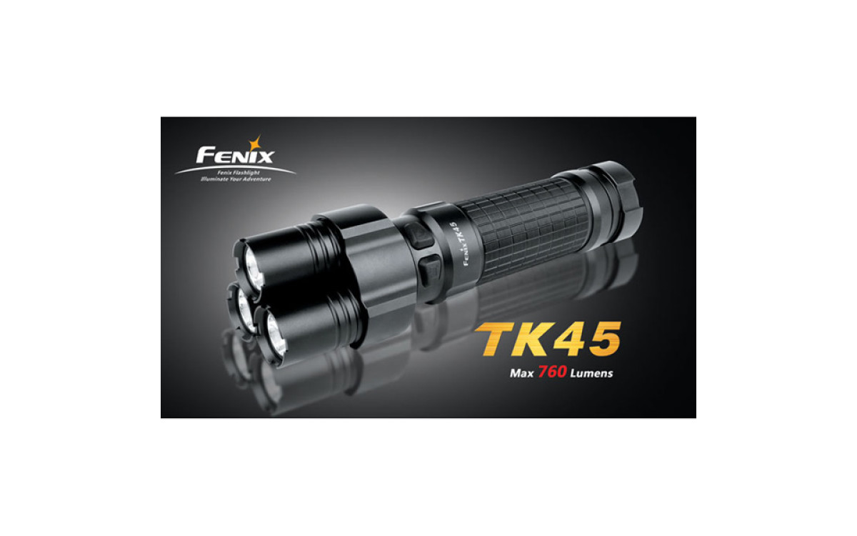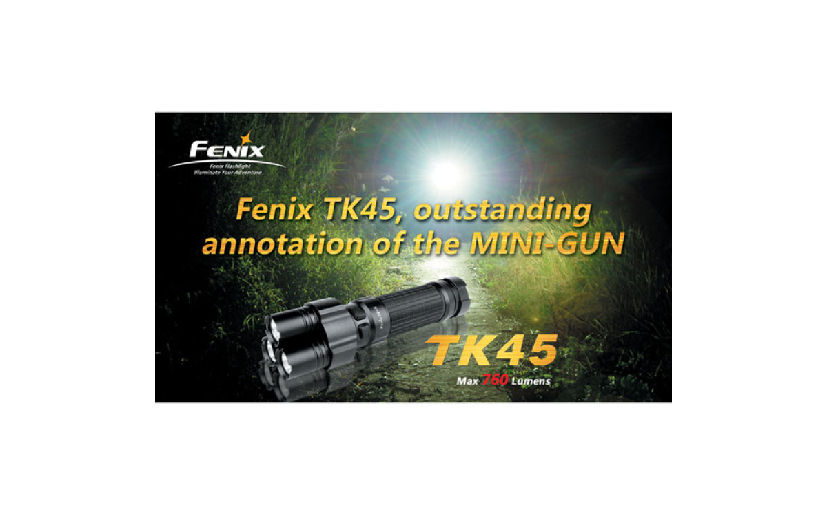 Fenix TК45 — необычный фонарь с тремя светодиодными «стволами» и исключительной яркости 760 люмен, сравнимой с автомобильной фарой. Вероятно, именно за счет своей необычной формы, он был выбран режиссером Ридли Скоттом для съемок фильма «Прометей».