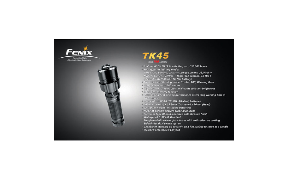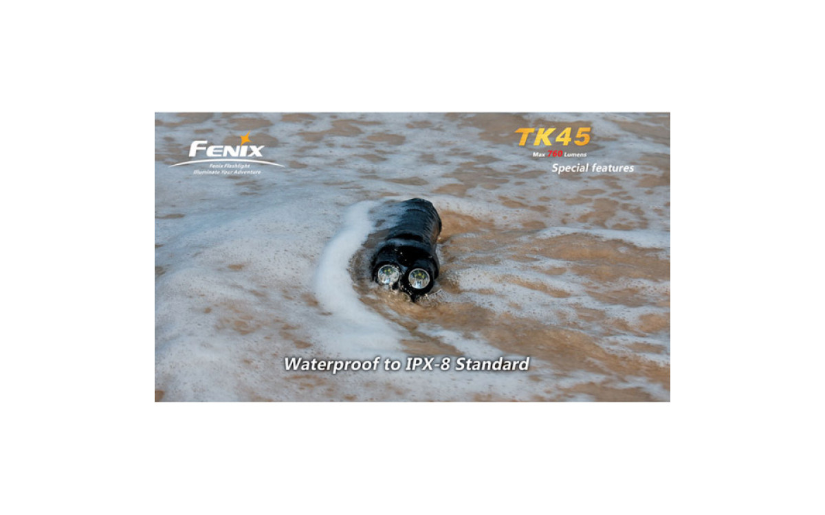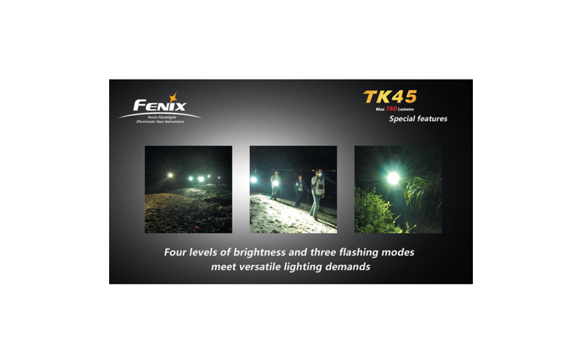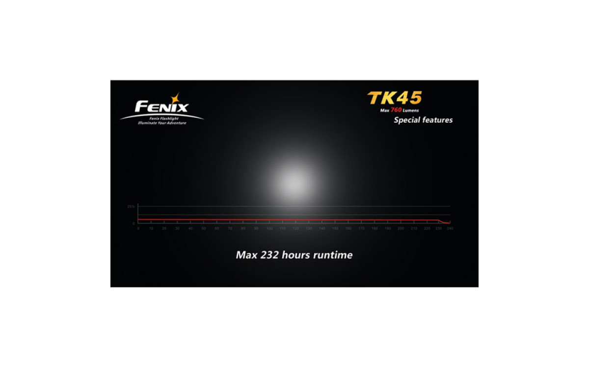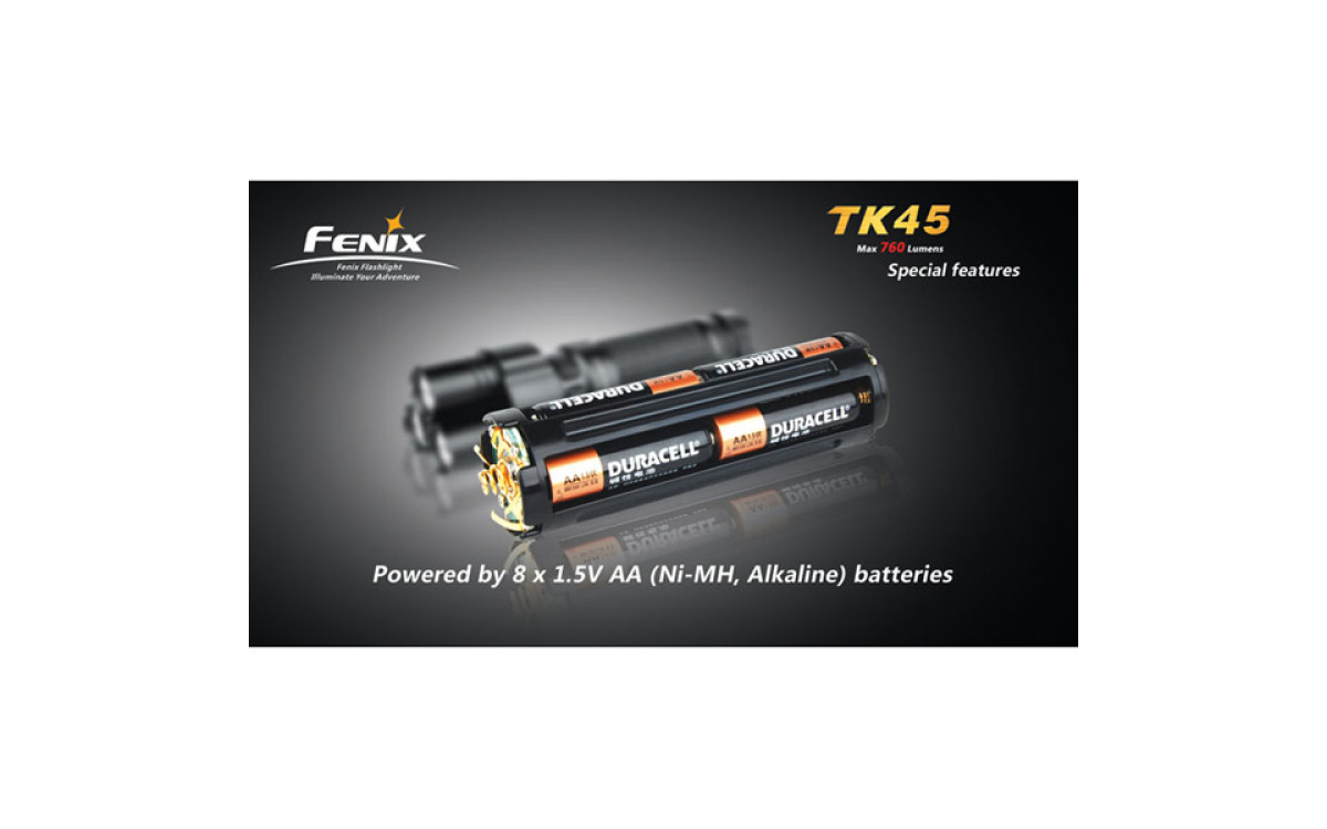 Fenix TК45 имеет цифровую регулировку яркости (процессор поддерживает яркость постоянной по мере разряда батарей), предупреждение о низком заряде батарей и запоминает последний выбранный режим работы. Защищен от переполюсовки элементами питания.