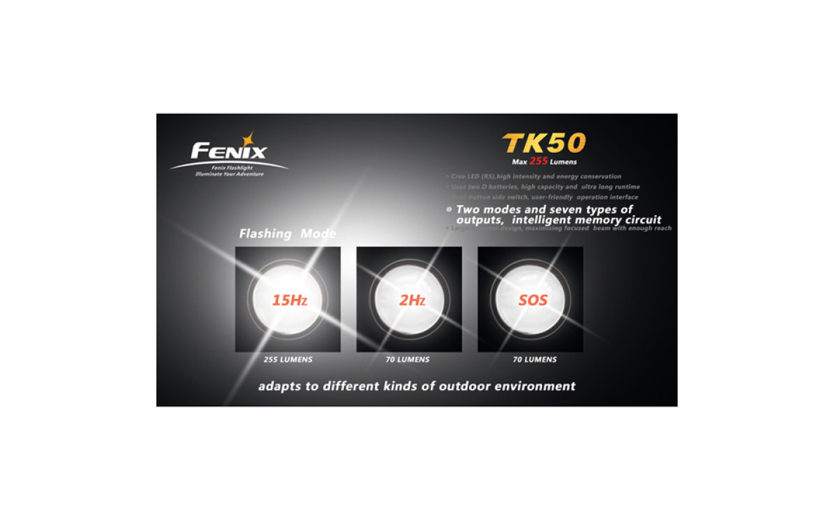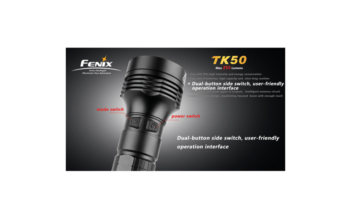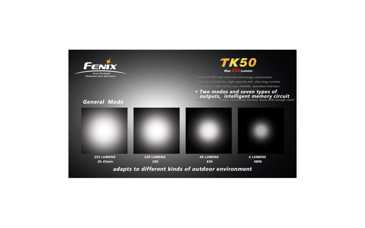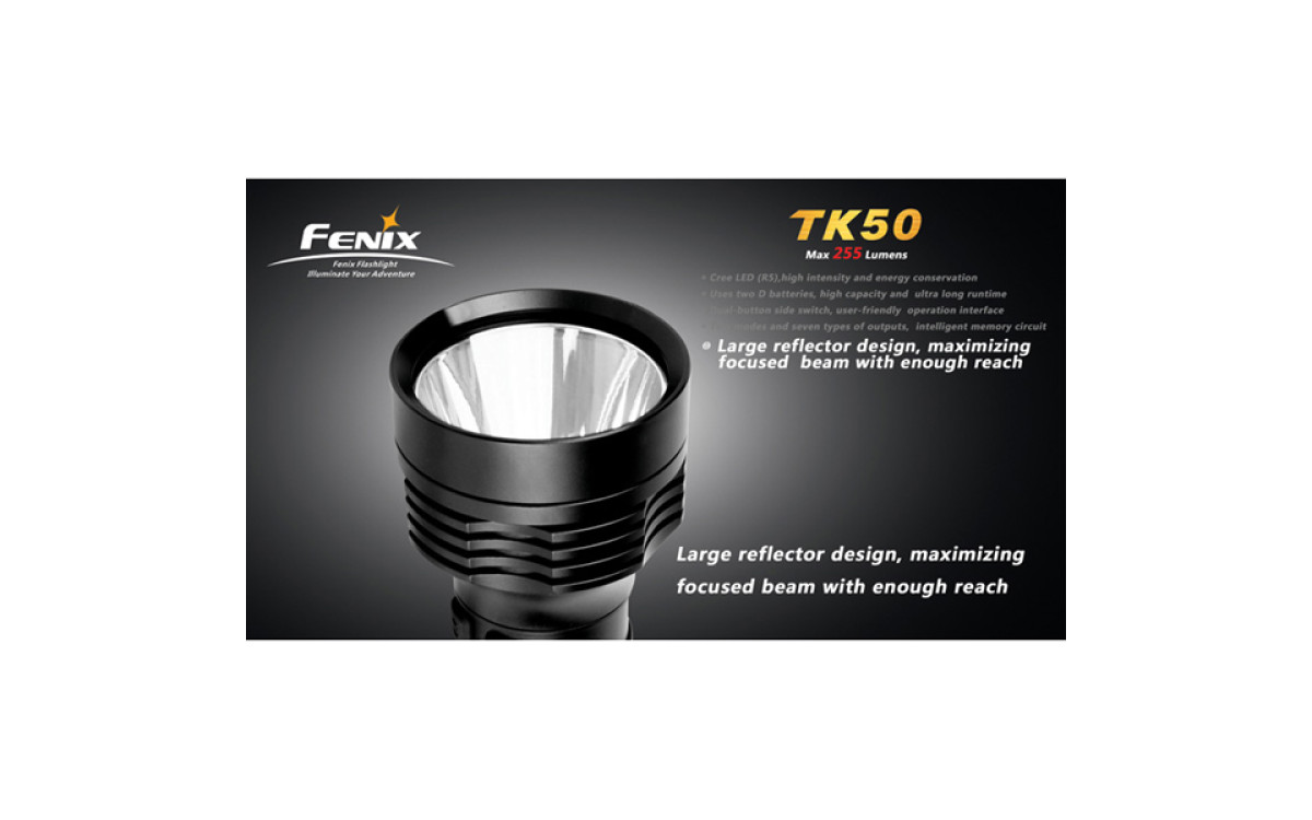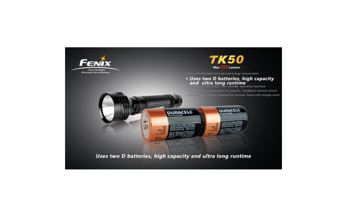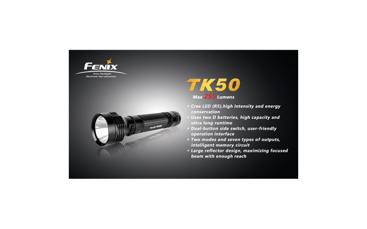 Fenix TК50 — это универсальный фонарь, который работает на 2-хэлементах питания типа «D». Имеет 4 уровня яркости и 2 сигнальных режима, максимальный режим 255 люмен. Благодаря узкой фокусировке дальность луча составляет 353 метра.