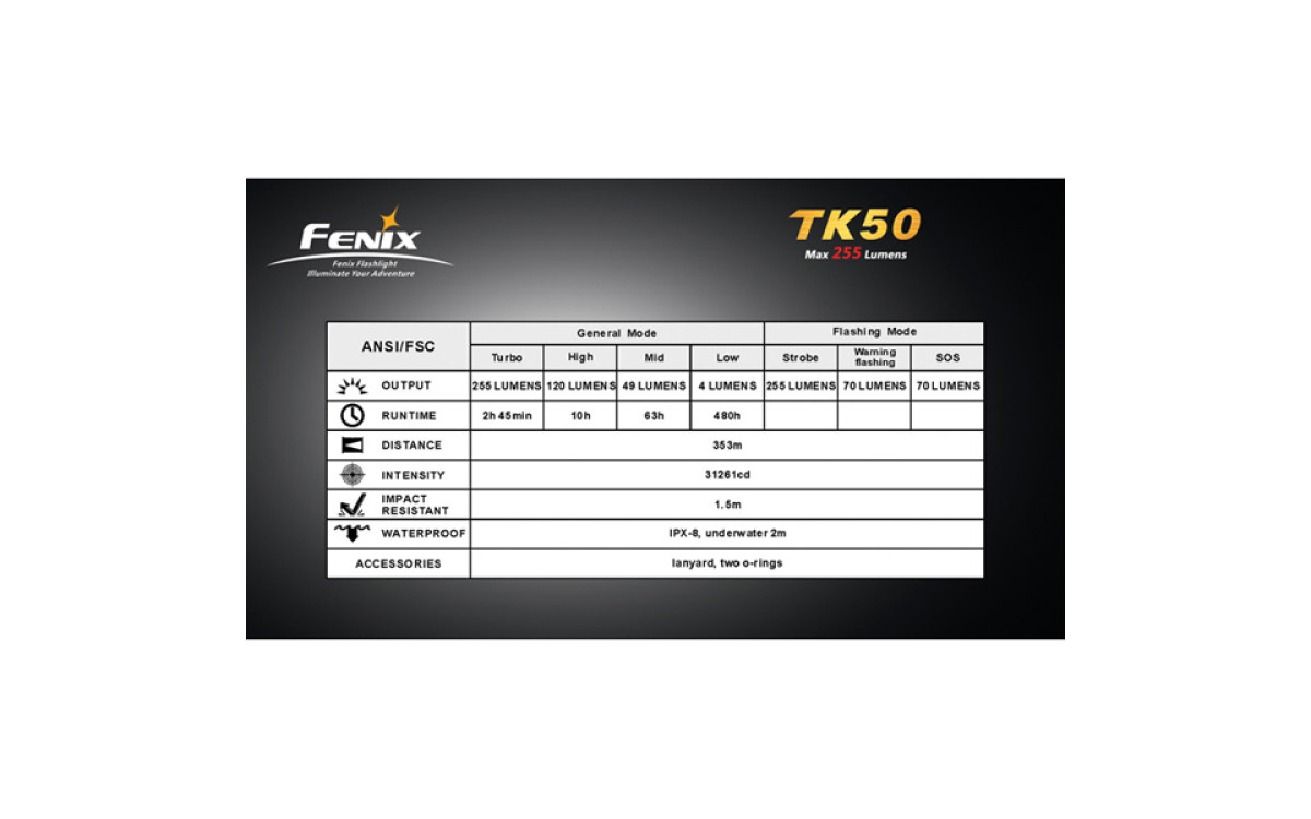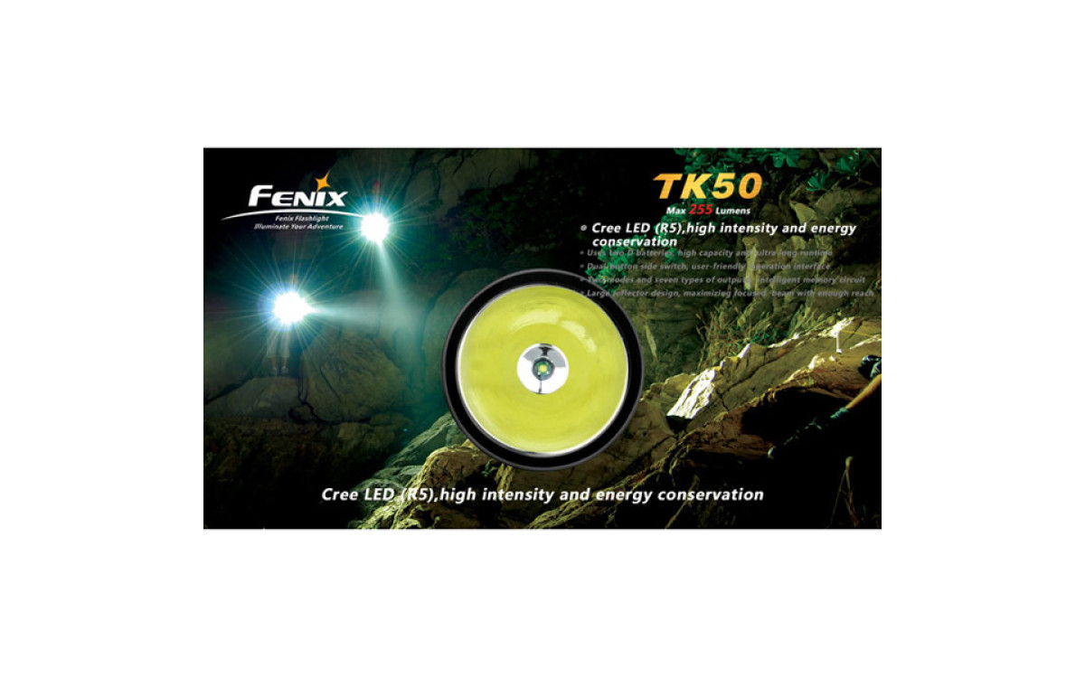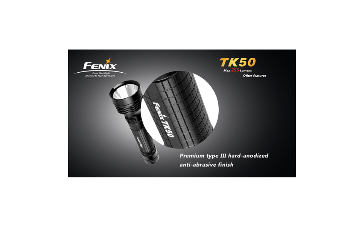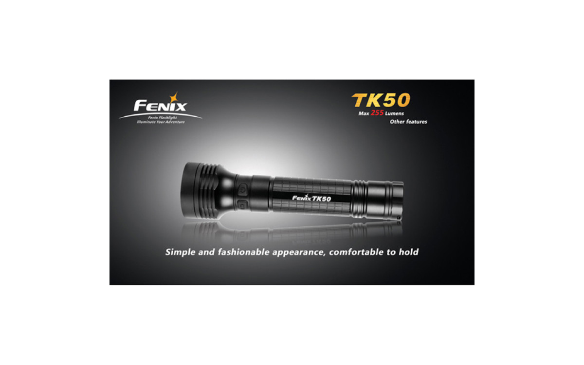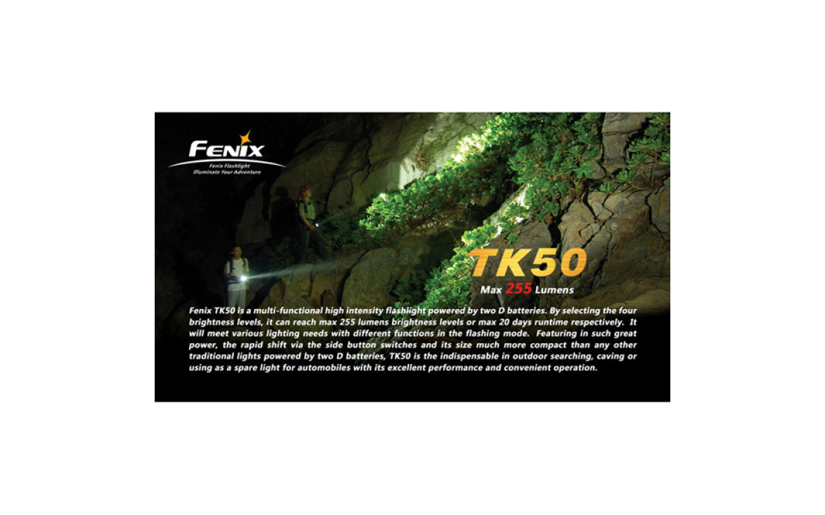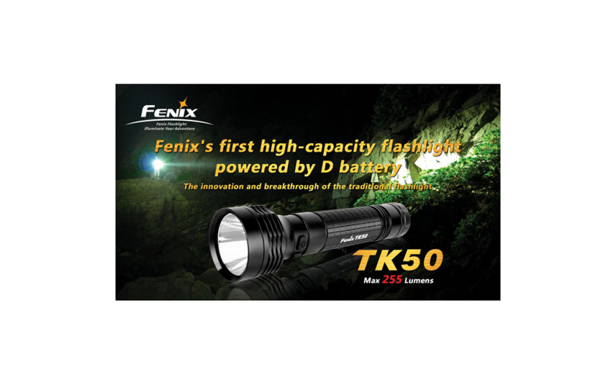 Fenix TК50 — это универсальный фонарь, который работает на 2-хэлементах питания типа «D». Имеет 4 уровня яркости и 2 сигнальных режима, максимальный режим 255 люмен. Благодаря узкой фокусировке дальность луча составляет 353 метра.