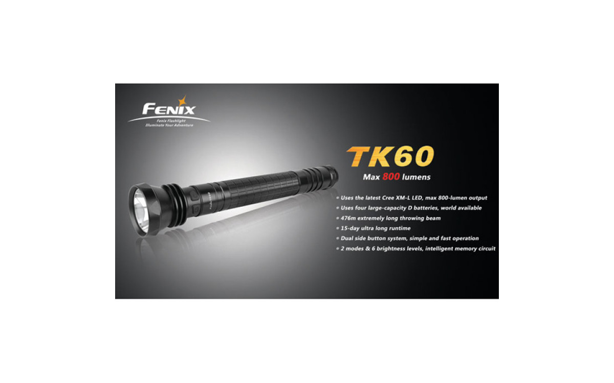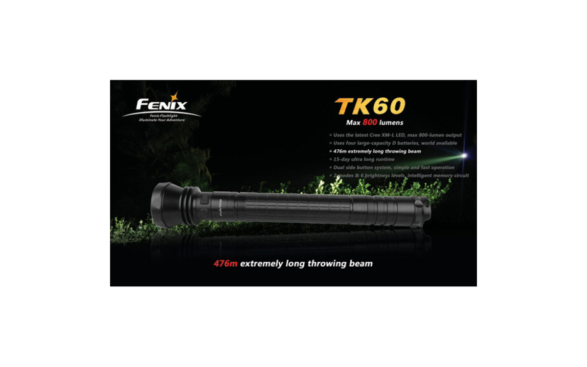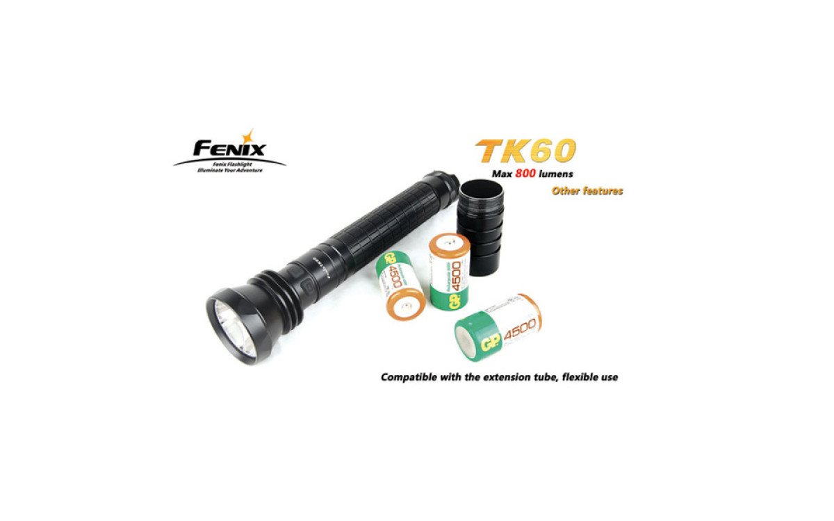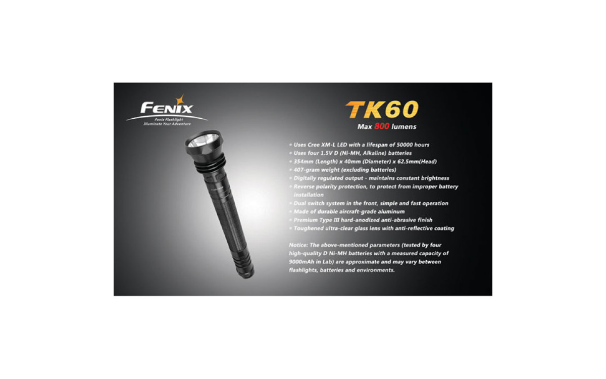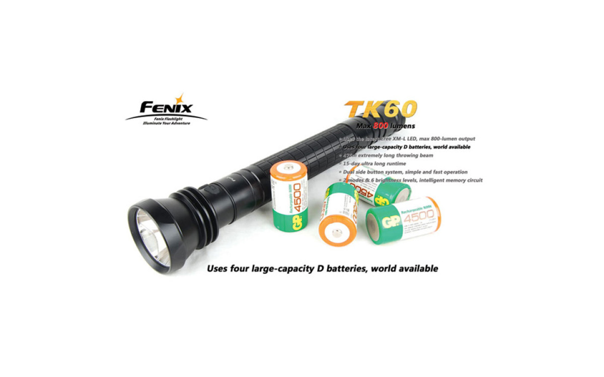 За счет использования батареек типа D (4 штуки), фонарь Fenix TK60 даже в турбо-режиме работает дольше других аналогичных фонарей.