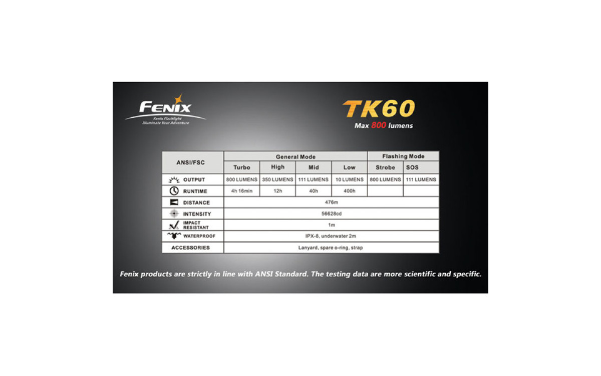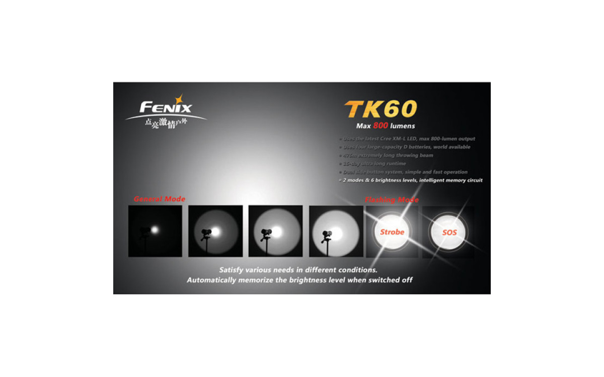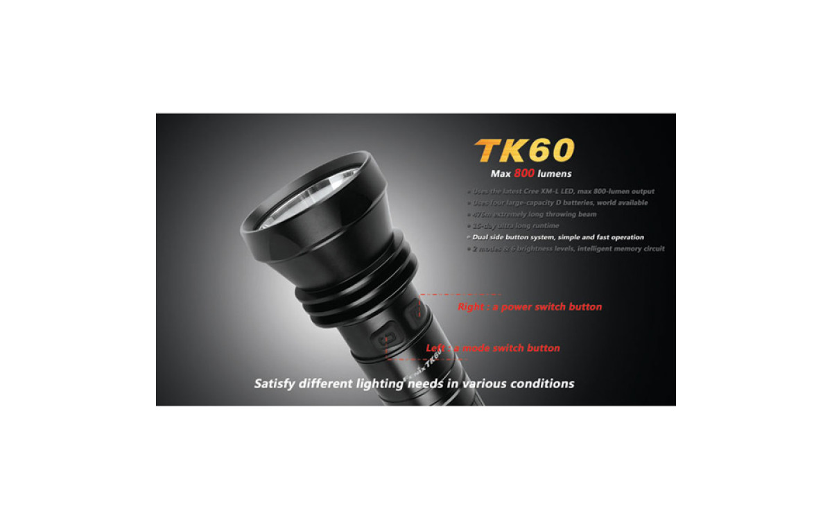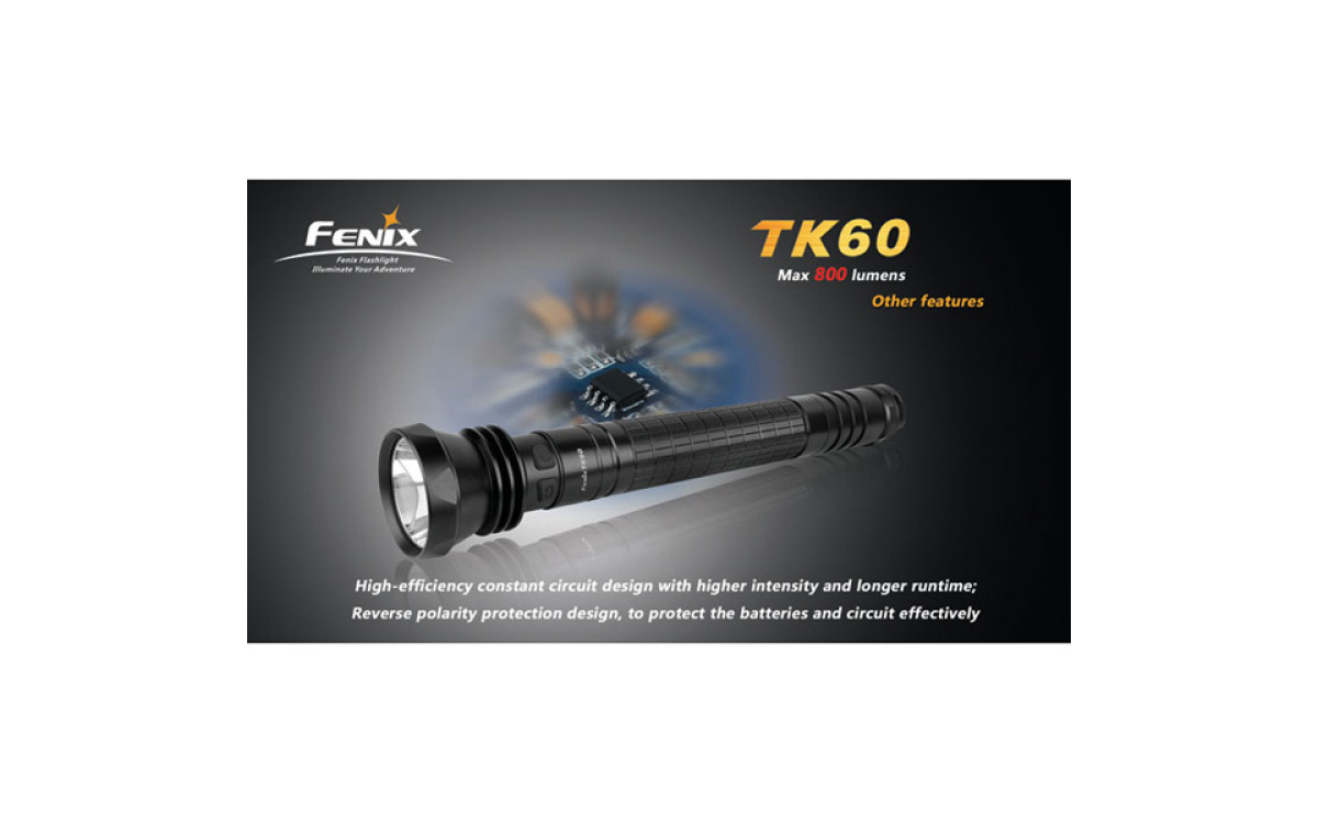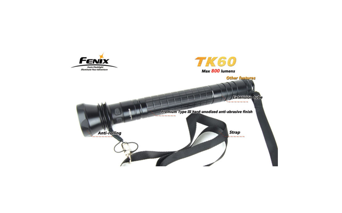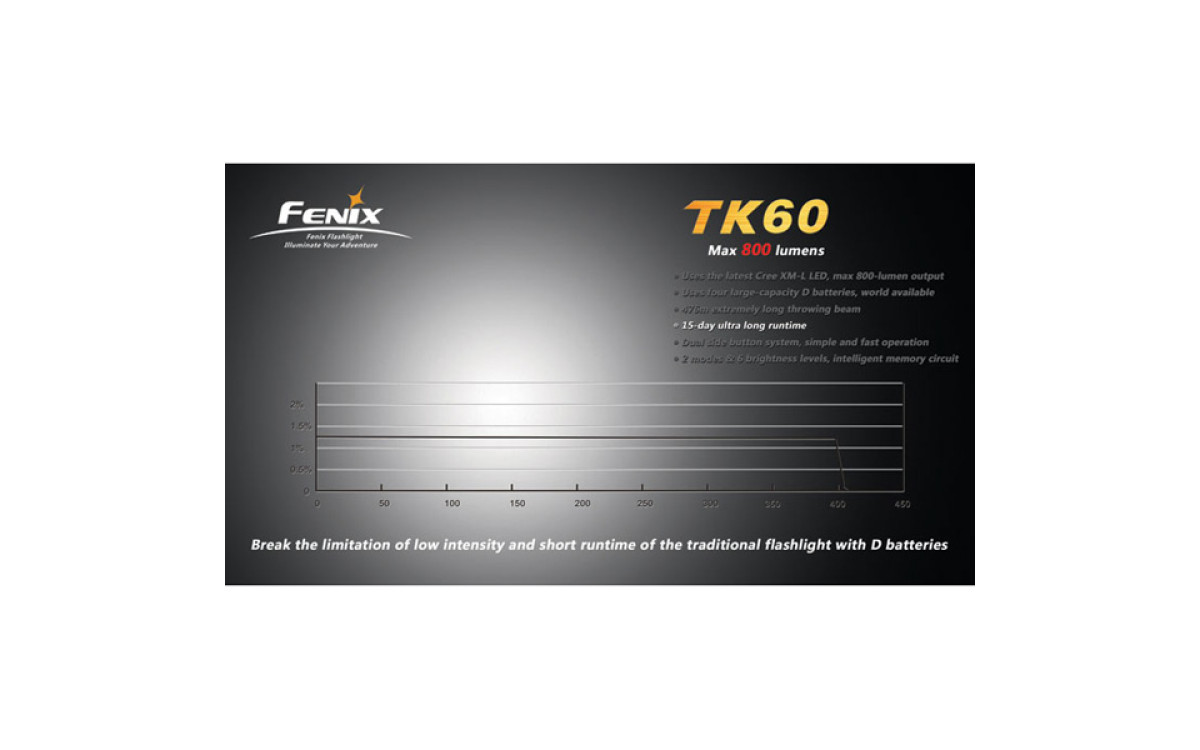 За счет использования батареек типа D (4 штуки), фонарь Fenix TK60 даже в турбо-режиме работает дольше других аналогичных фонарей.