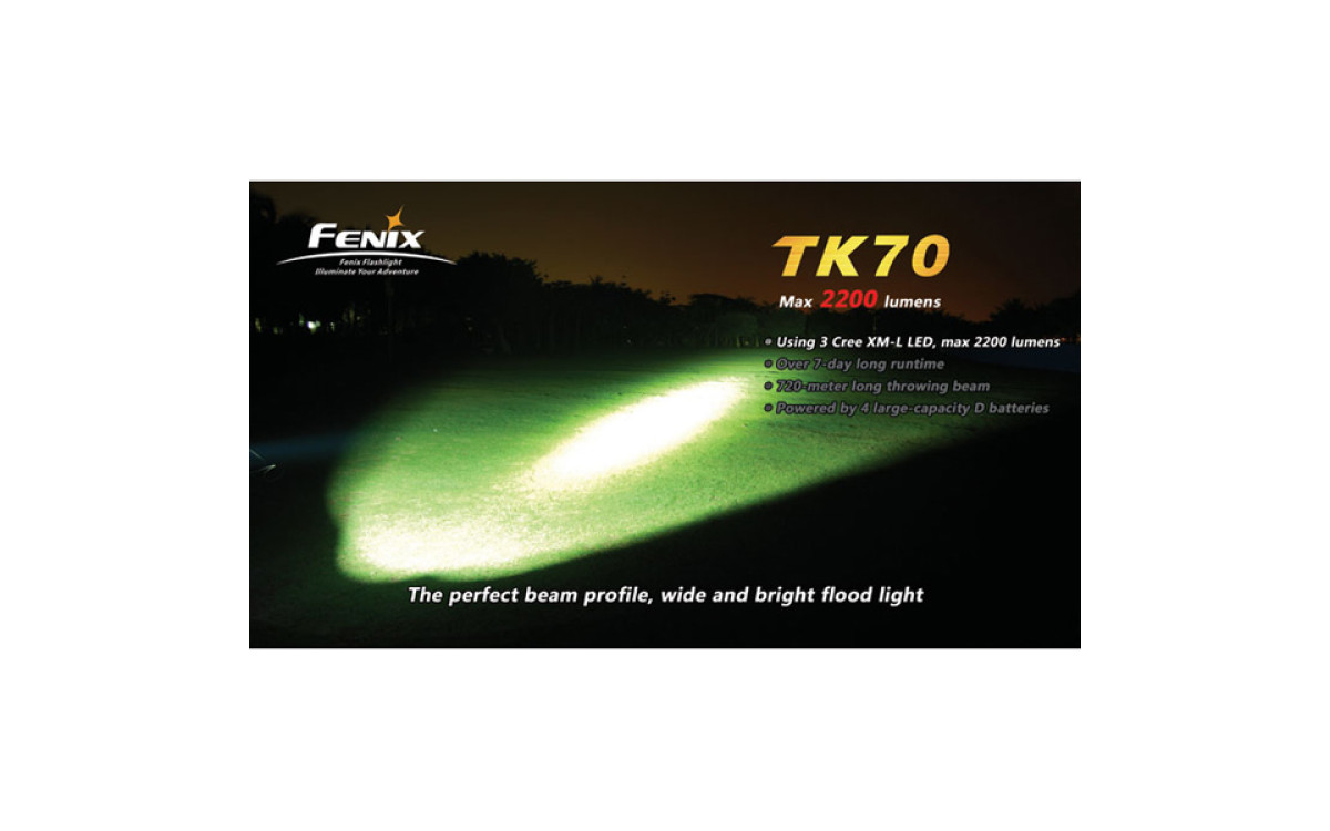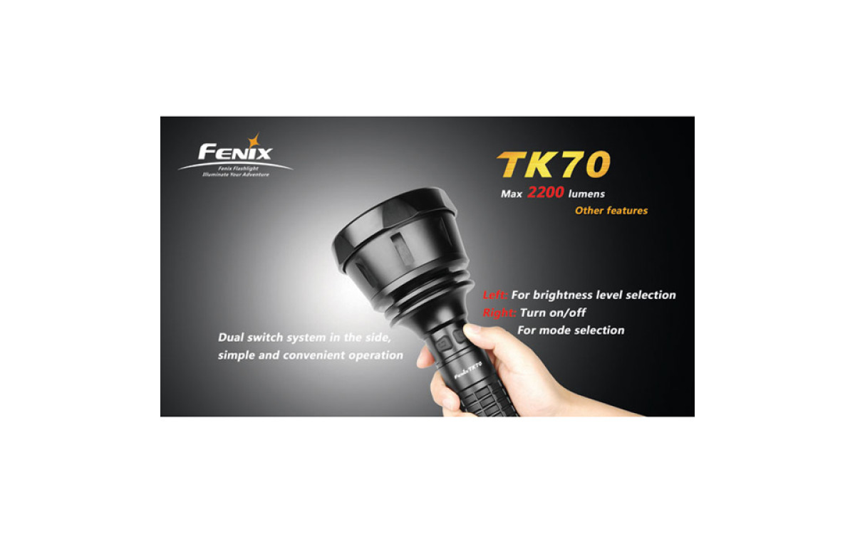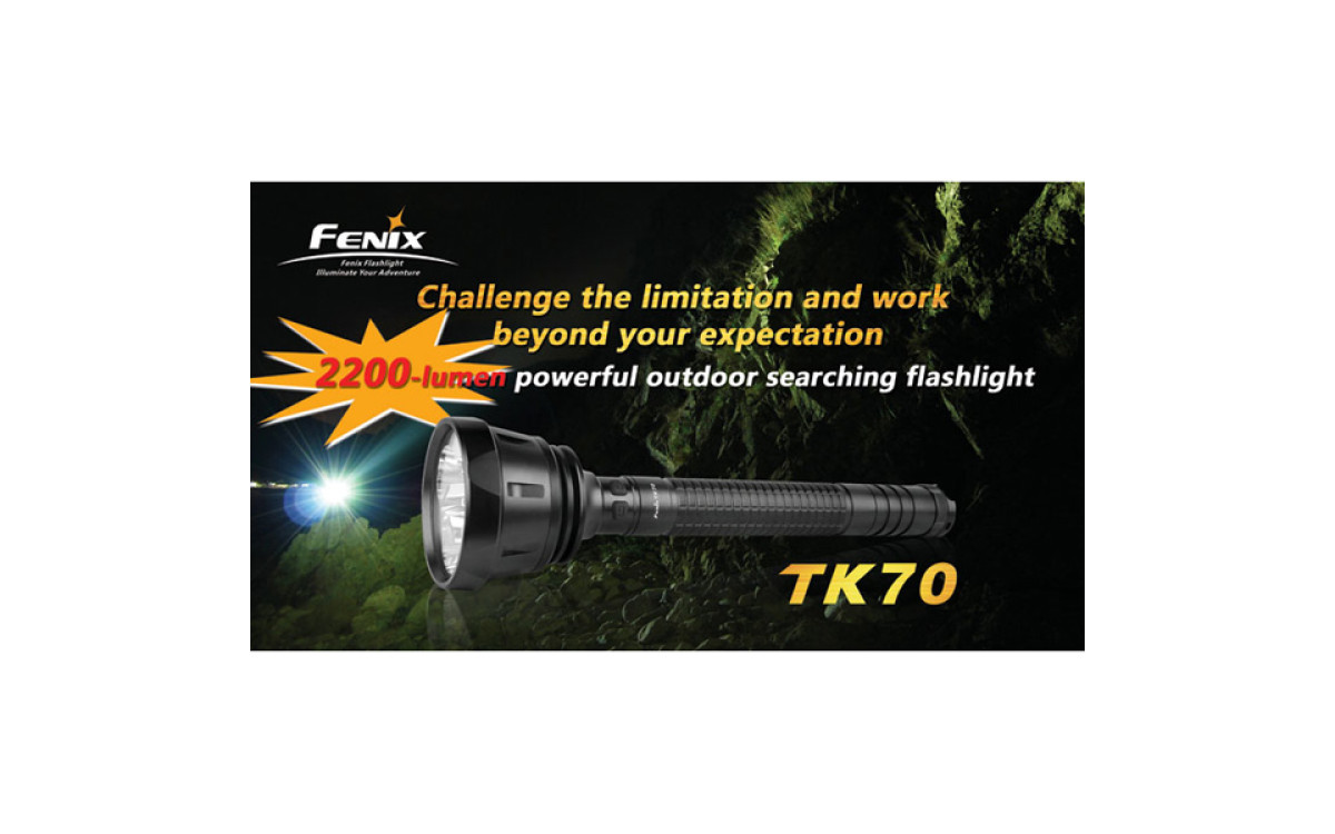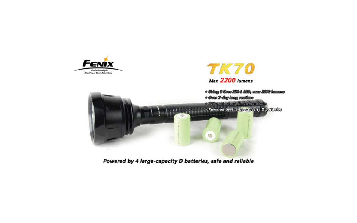 Fenix TК70 — самый мощный фонарь, работающий на элементах питания типа «D». Фонарь имеет 4 уровня яркости и 2 сигнальных режима, выбор режима осуществляется легко и быстро с помощью2-хкнопок в головной части фонаря. В арсенале мощность светового потока 2200 люмен и экстремально длительное7-дневноевремя работы. Большой запас по яркости и внушительный размер отличают ТК70 от массы остальных фонарей. Идеален для поисковых работ в любых условиях.
