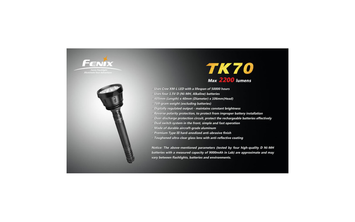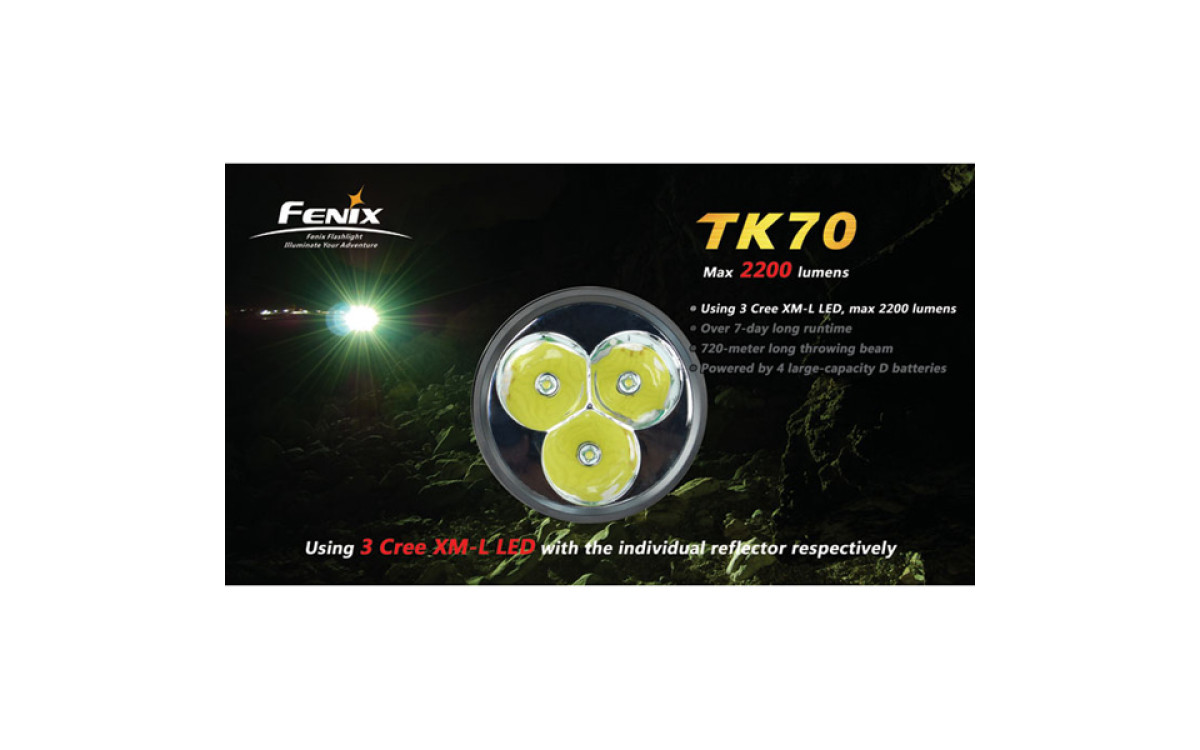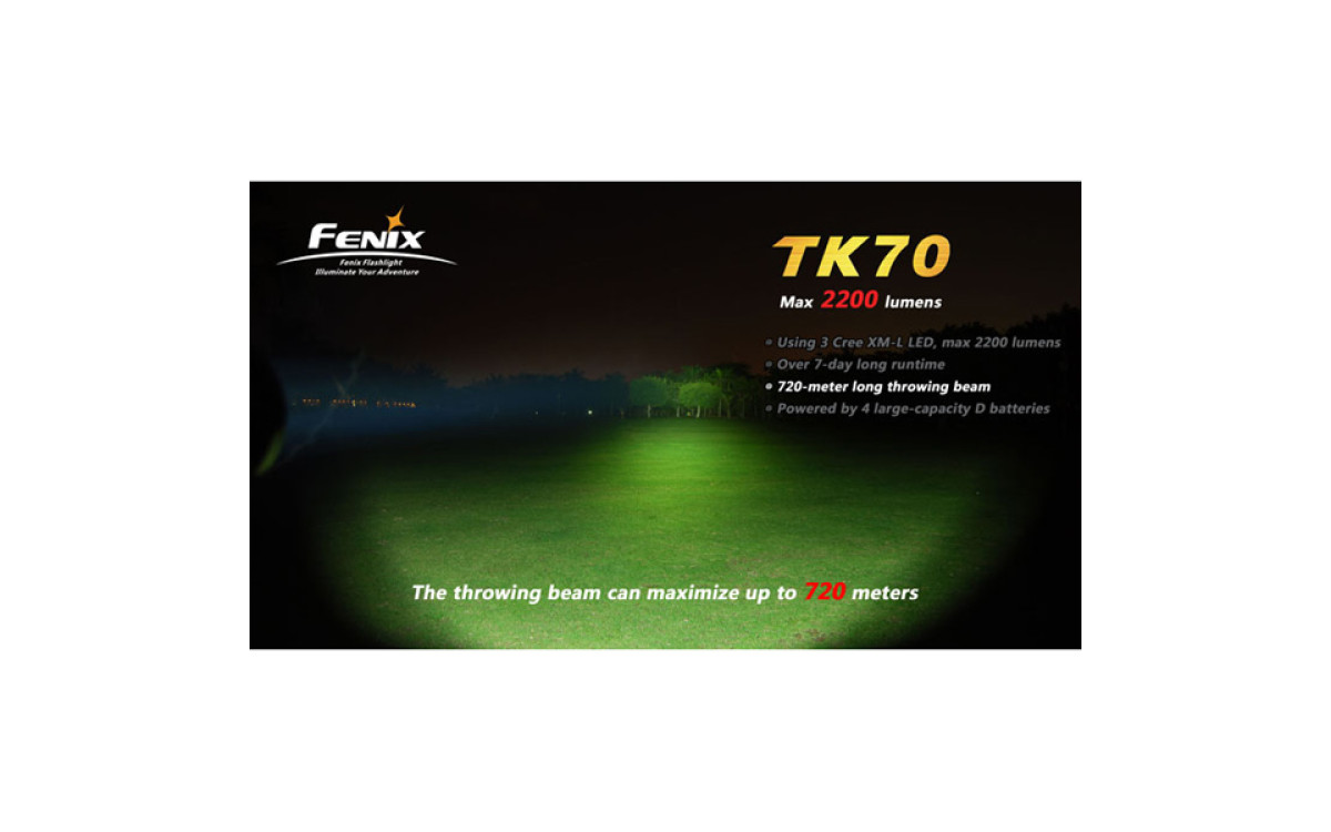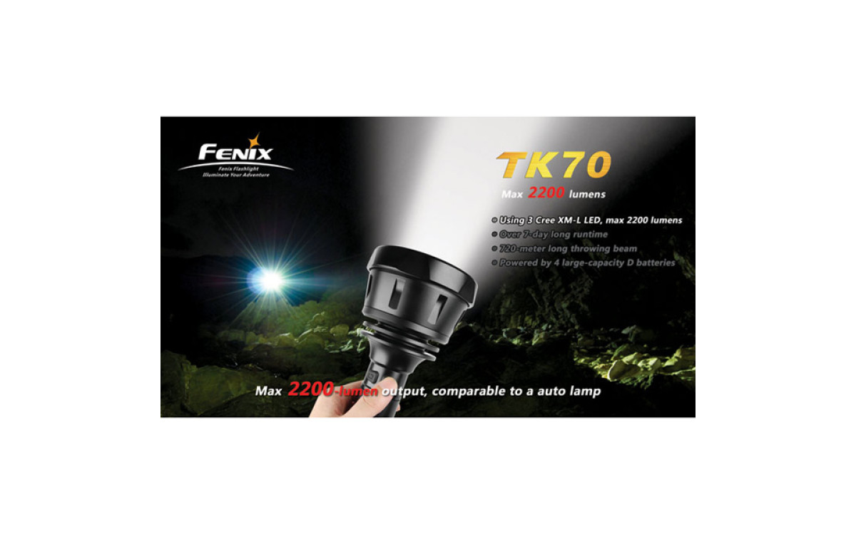 Fenix TК70 — самый мощный фонарь, работающий на элементах питания типа «D». Фонарь имеет 4 уровня яркости и 2 сигнальных режима, выбор режима осуществляется легко и быстро с помощью2-хкнопок в головной части фонаря. В арсенале мощность светового потока 2200 люмен и экстремально длительное7-дневноевремя работы. Большой запас по яркости и внушительный размер отличают ТК70 от массы остальных фонарей. Идеален для поисковых работ в любых условиях.