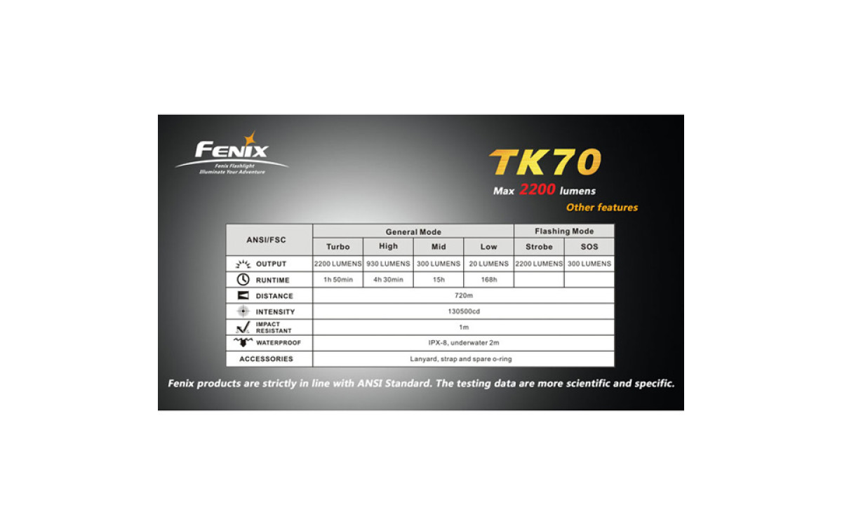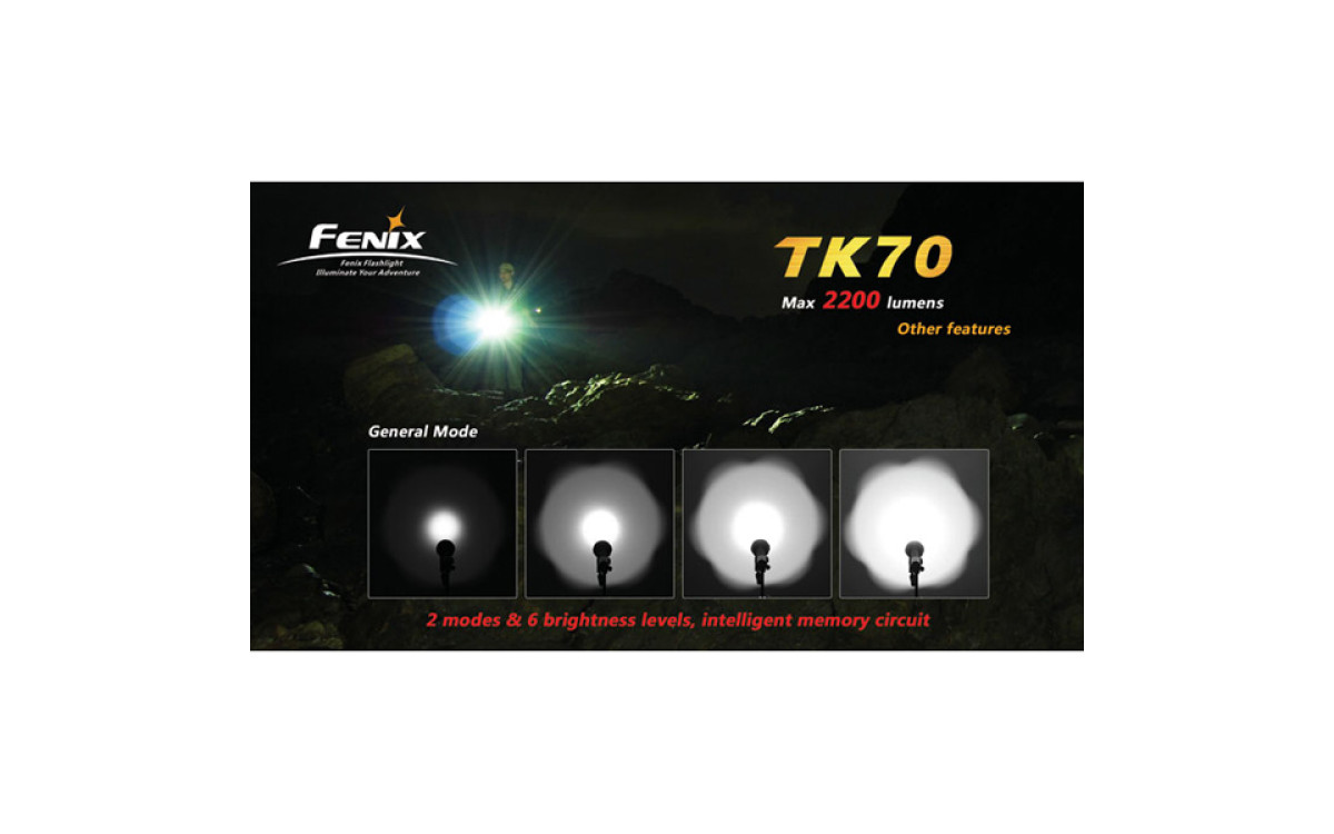 Fenix TК70 имеет цифровую регулировку яркости (процессор поддерживает яркость постоянной по мере разряда батарей) и запоминает последний выбранный режим работы. Защищен от переполюсовки элементами питания.