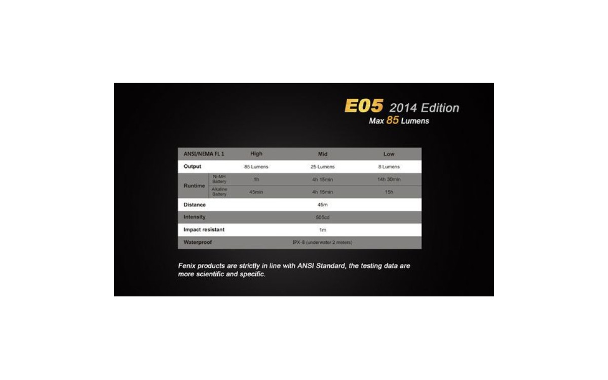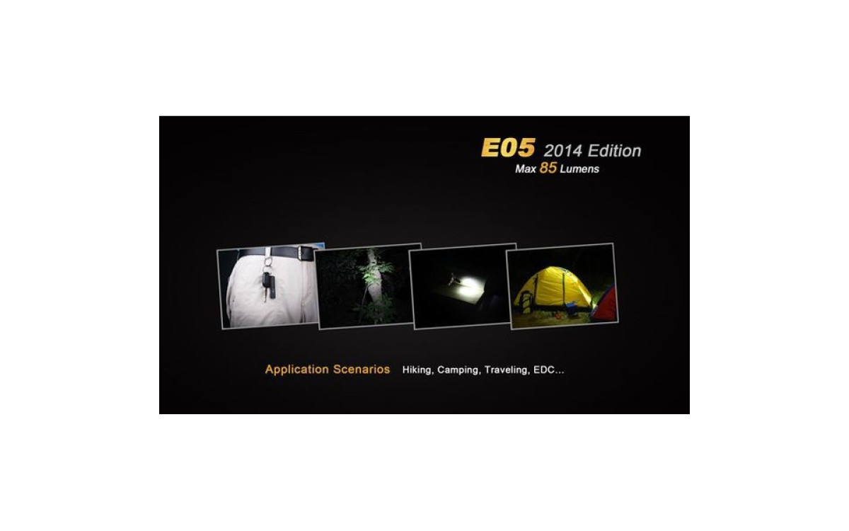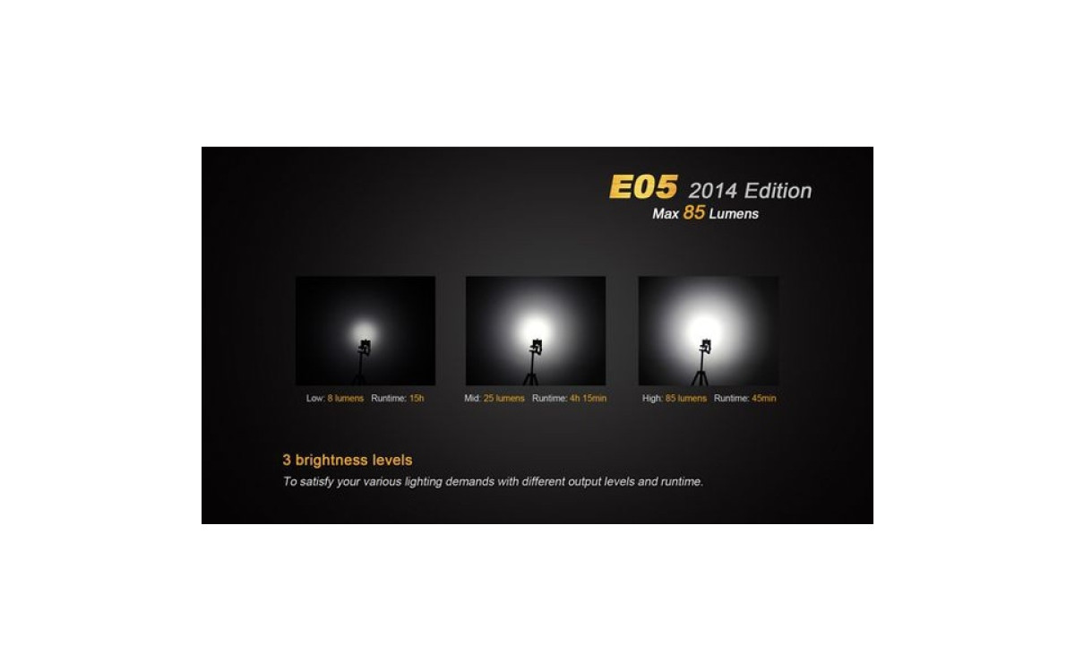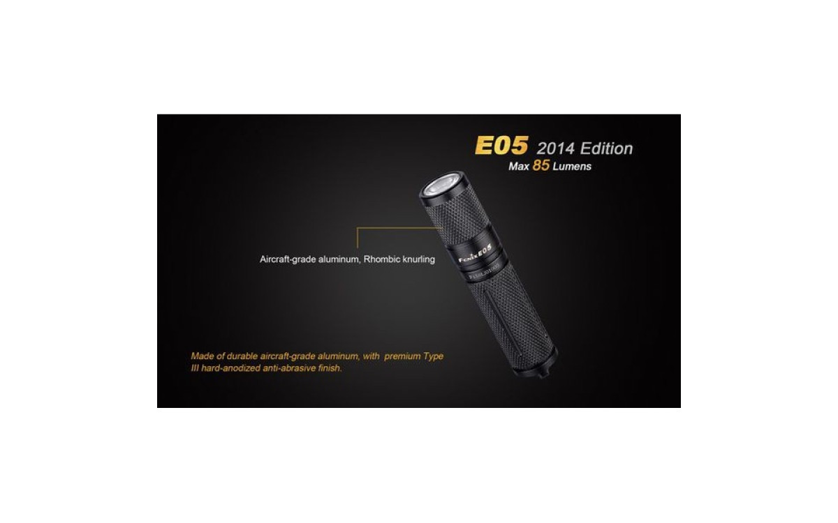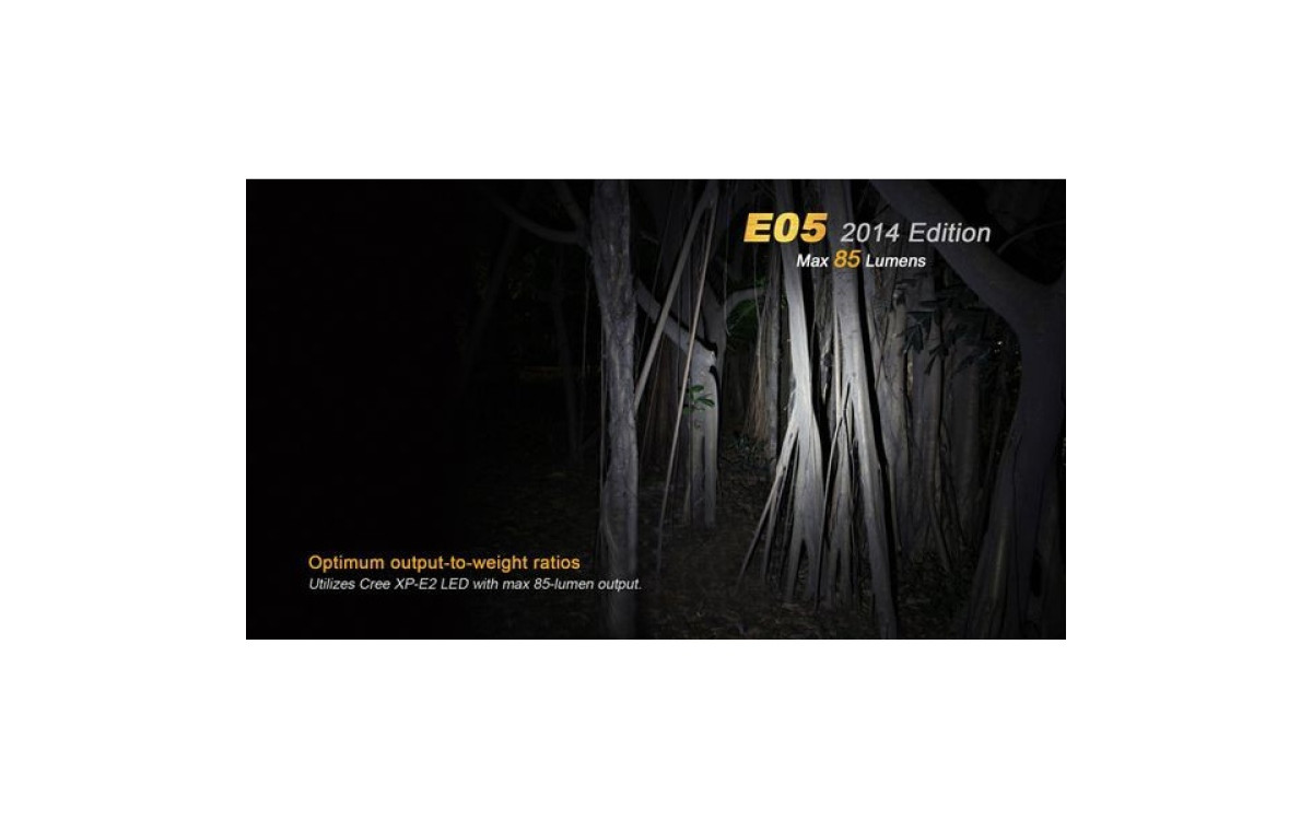 Fenix E05 2014 года поражает своими скромными размерами и легкостью. Но не думайте, что он испускает столь же слабый свет. E05 может похвастаться уникальной линзой, которая усиливает силу света и создает обширное равномерное ближнее освещение. Яркость этого малыша достигает серьезных 85 люмен. Легкий корпус из авиационного алюминия с прочным анодированием и удобное управление довершают характеристики идеального фонаря—брелока.
