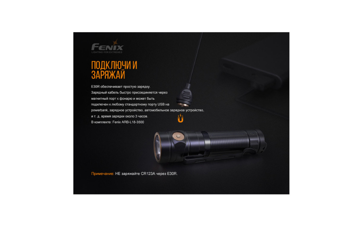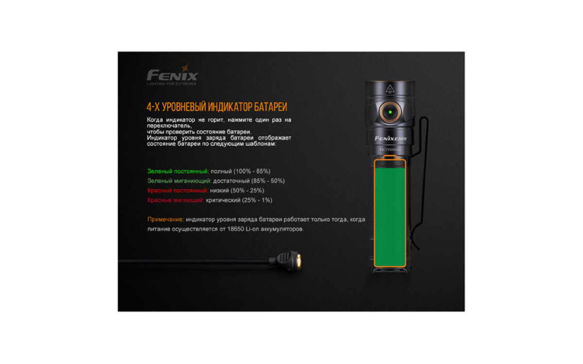 - Fenix E30R работает как от одного литий-ионного аккумулятора 18650 (в комплекте), так и от двух морозоустойчивых литиевых батарейки CR123A.