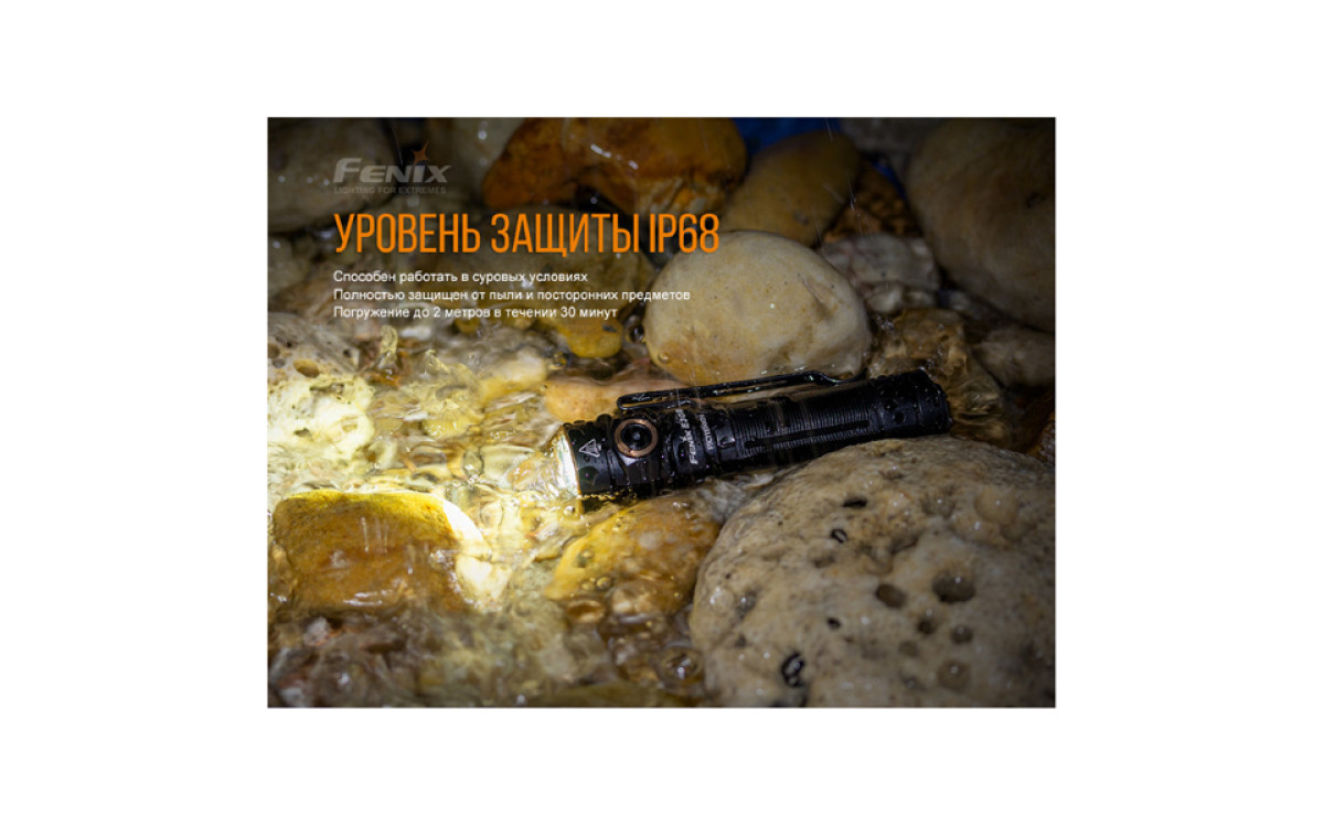 - Корпус фонаря выполнен из высокопрочного алюминия с покрытием премиальным анодированием, предупреждающим окисление и износ. E30R полностью водонепроницаем и выдерживает погружение до 2 метров.