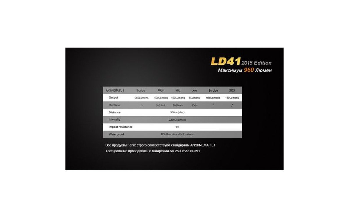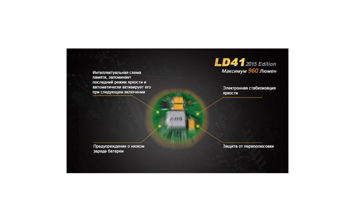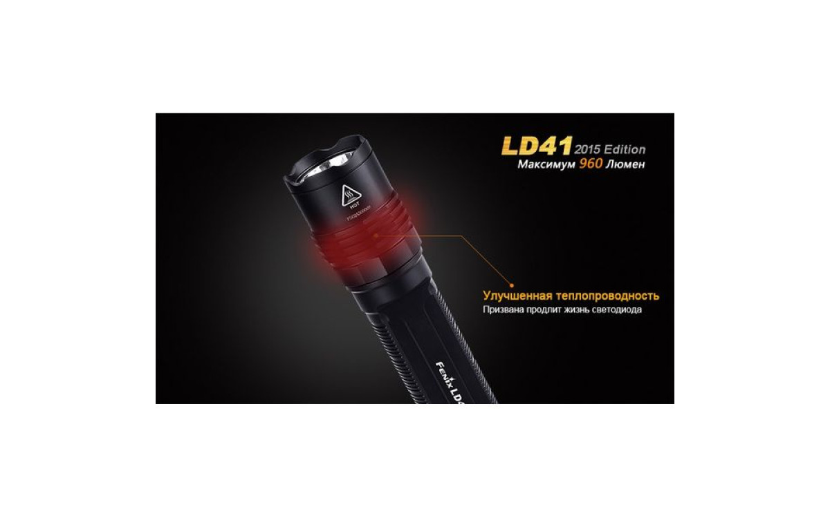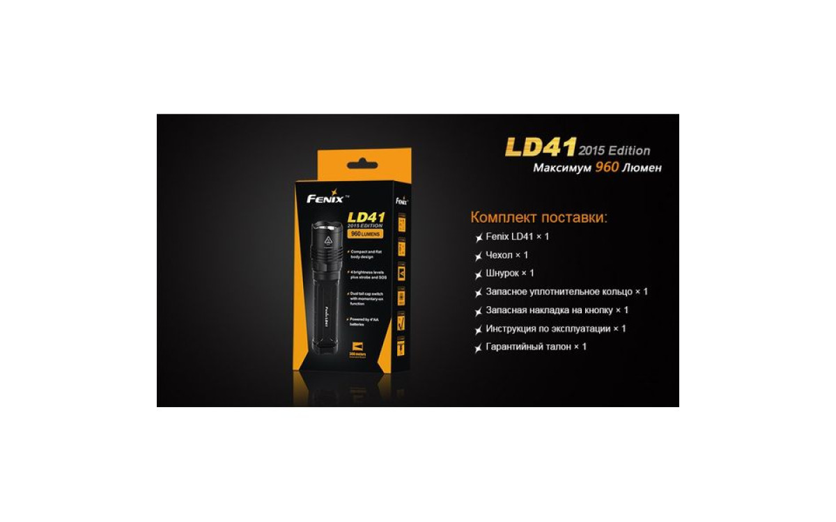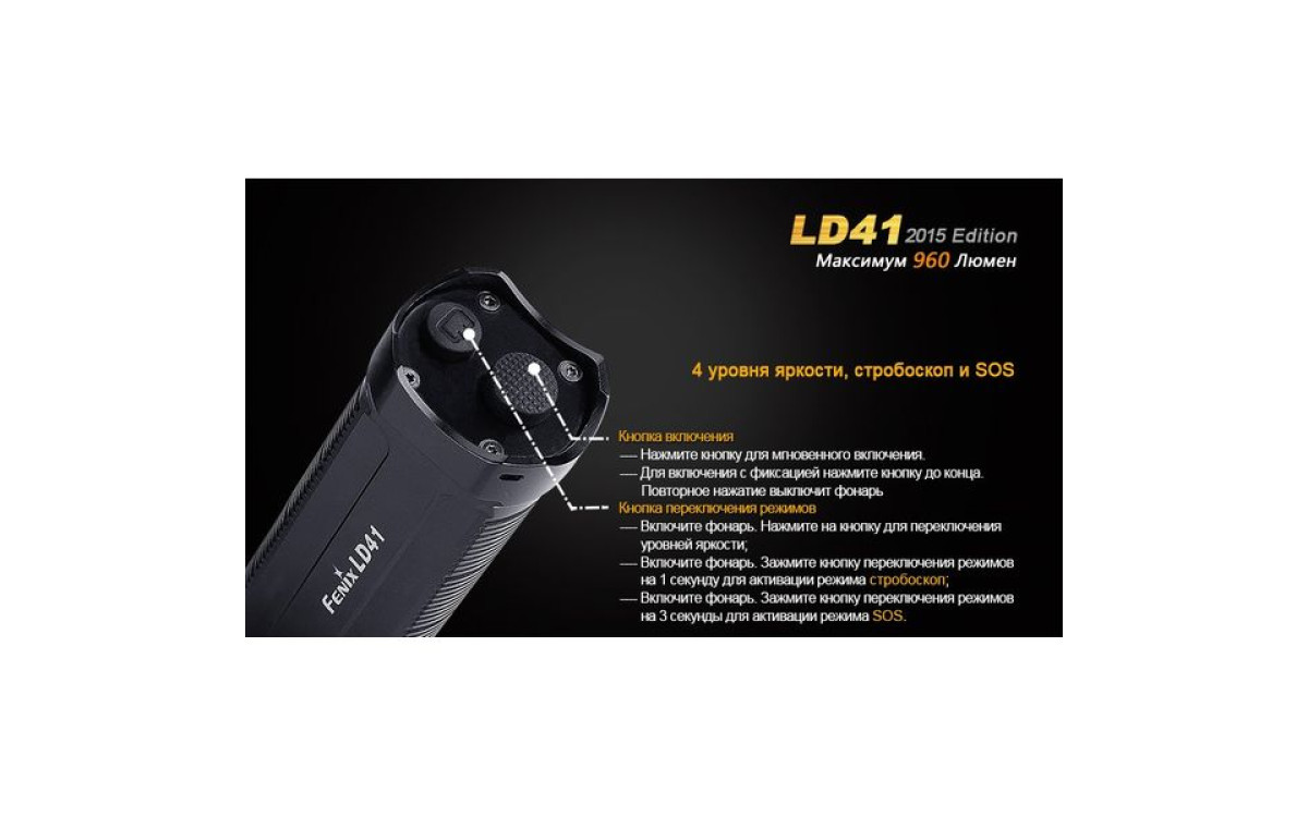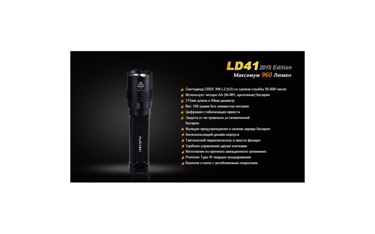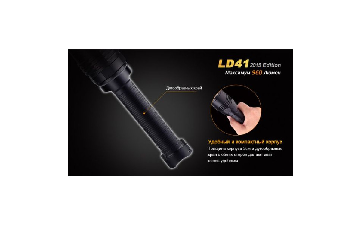 Модель Fenix LD41 очень практична в использовании. Фонарь легко управляется при помощи 2 торцевых кнопок, имеет высокий уровень защиты всех внутренних механизмов. В частности, его электросхема не подвержена короткому замыканию вследствие неправильной полярности элементов питания. Постоянный уровень яркости фонаря поддерживает система цифровой стабилизации.