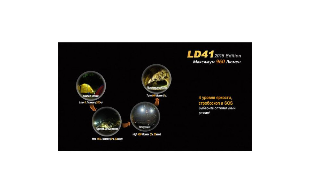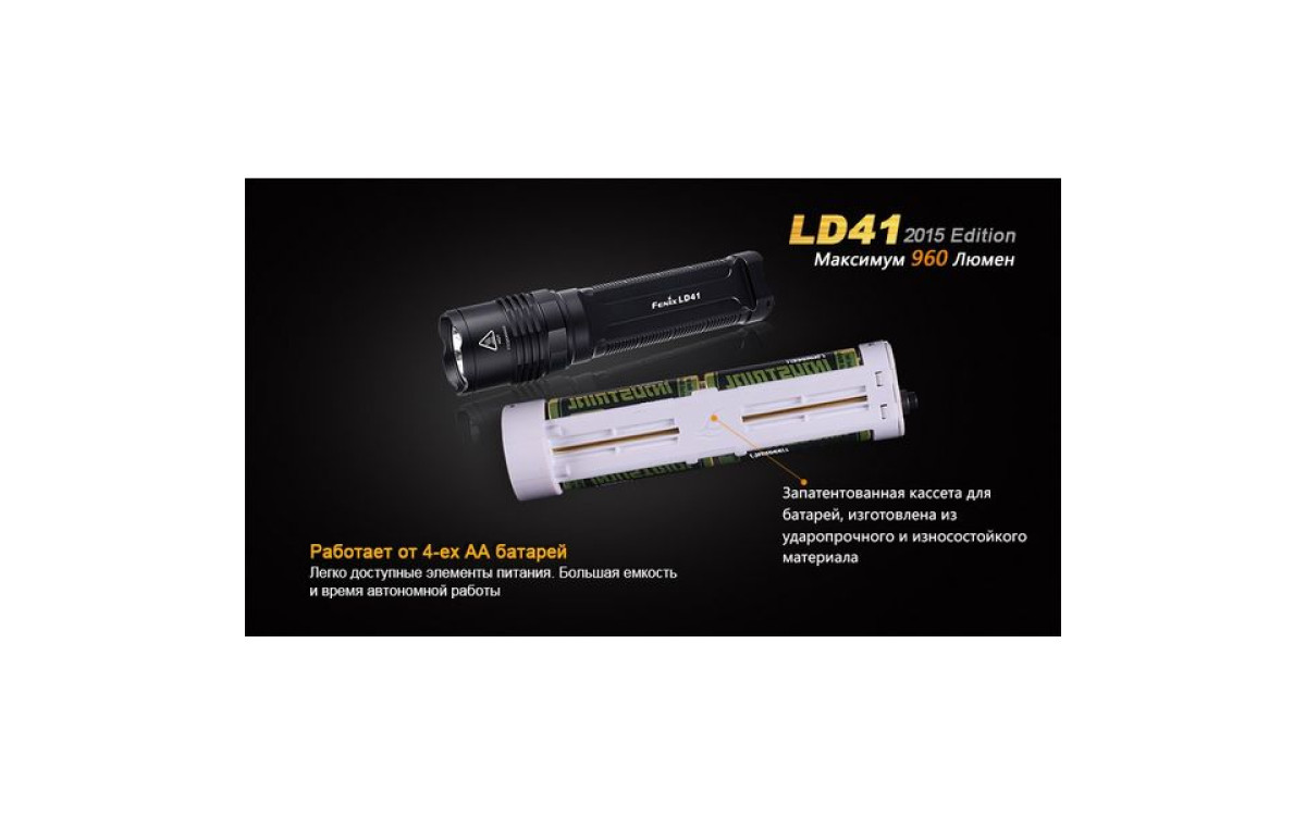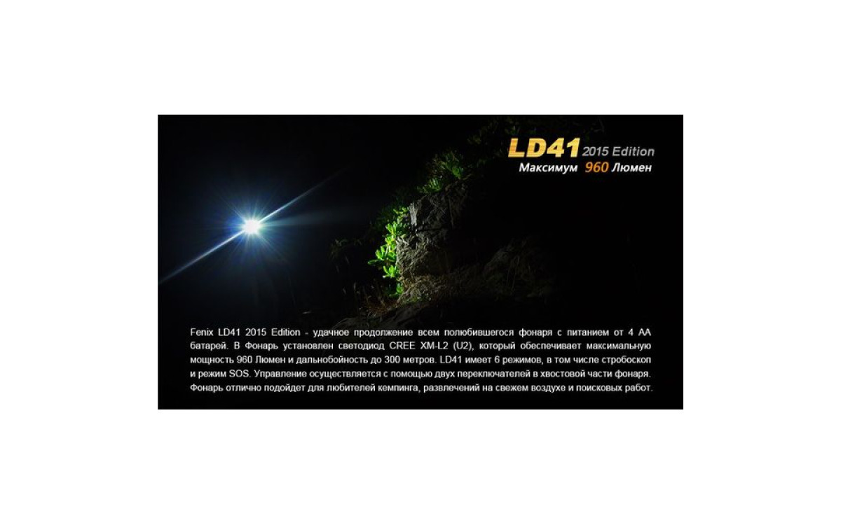 Благодаря широкому диапазону значений яркости в различных режимах, фонарь Fenix LD41 можно использовать в туристических и поисковых целях. А питание от батарей типоразмера АА позволит без труда подобрать замену севшим батарейкам даже в самом отдаленном селении.