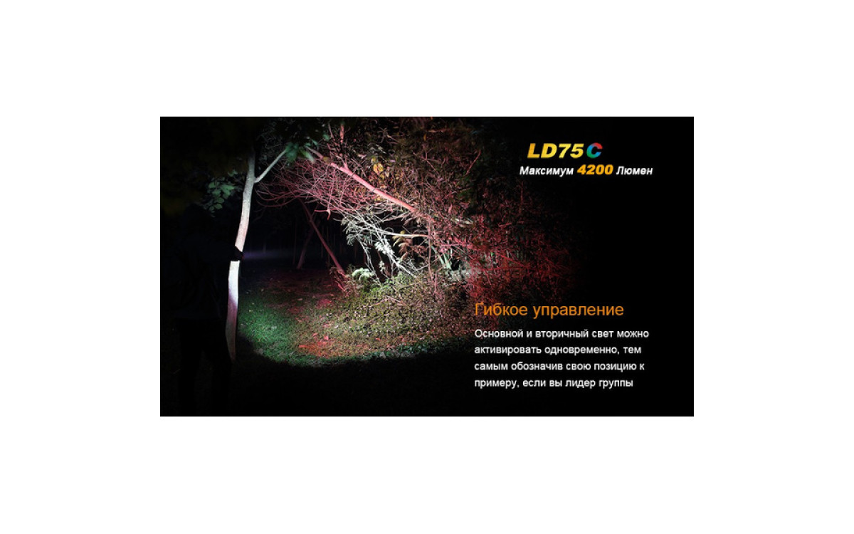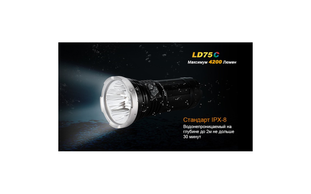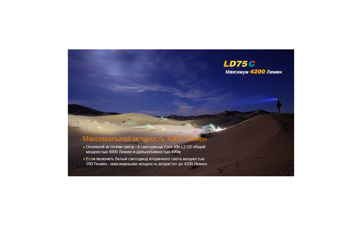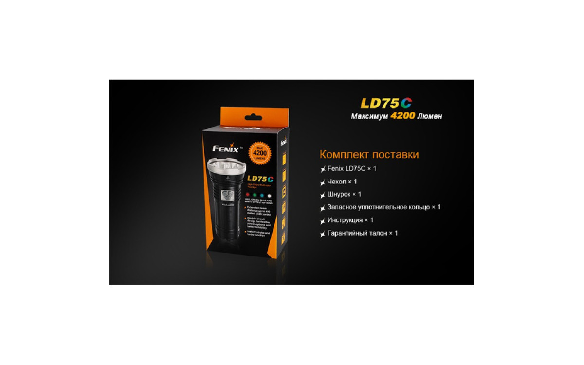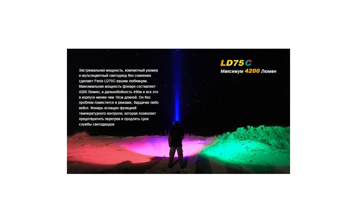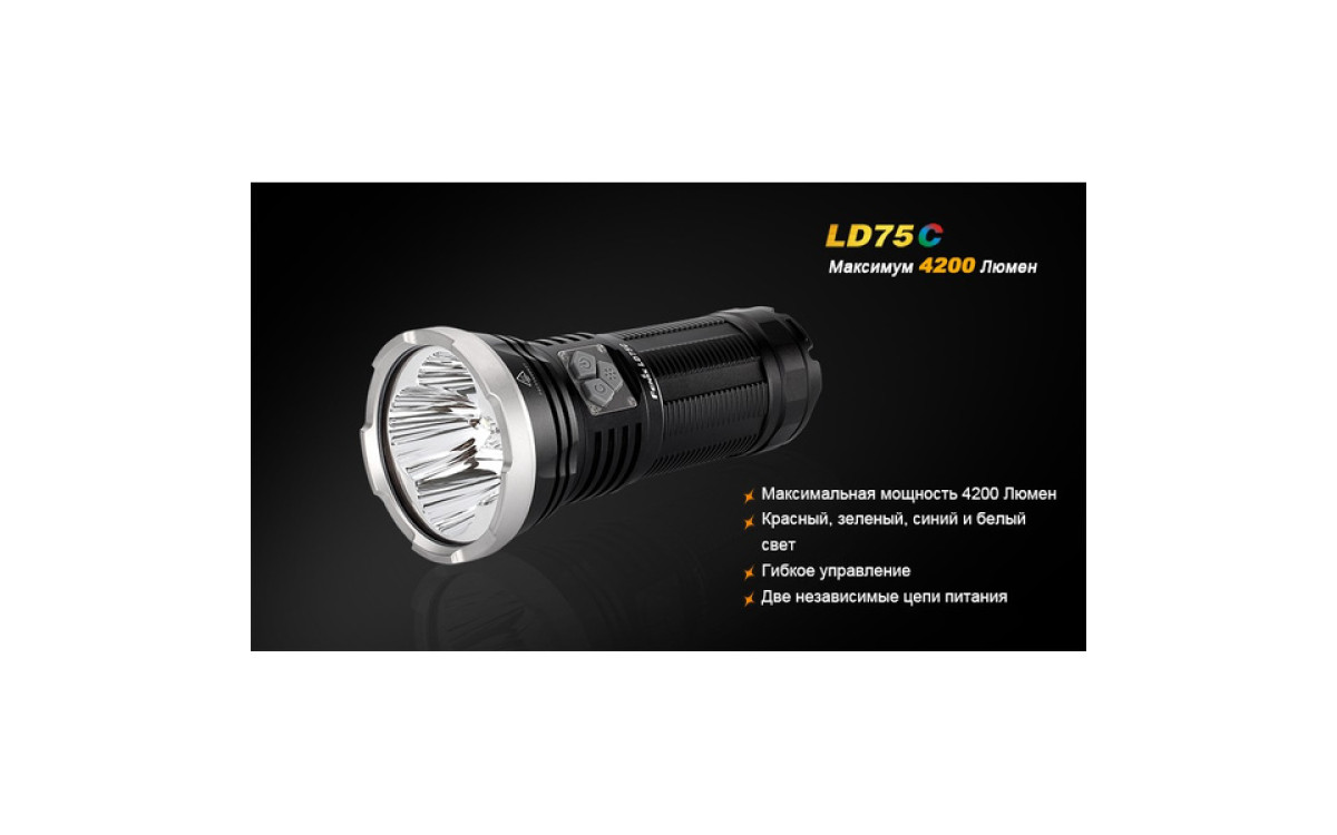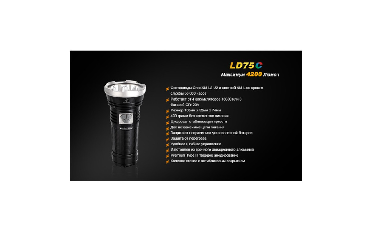 Экстремальная яркость, компактный размер и 3 дополнительных цвета (Красный, Синий, Зеленый) выделяют LD75 фаворитом среди фонарей для активных людей. Максимальная яркость 4200 люмен, дистанция луча 490 метров скрываются в 16-сантиметровом корпусе, который легко помещается в рюкзак, ящик для инструментов или бардачок автомобиля. В фонаре предустановленны 5 режимов яркости белого света, мгновенный доступ к Турбо режиму и Строб сигналу.