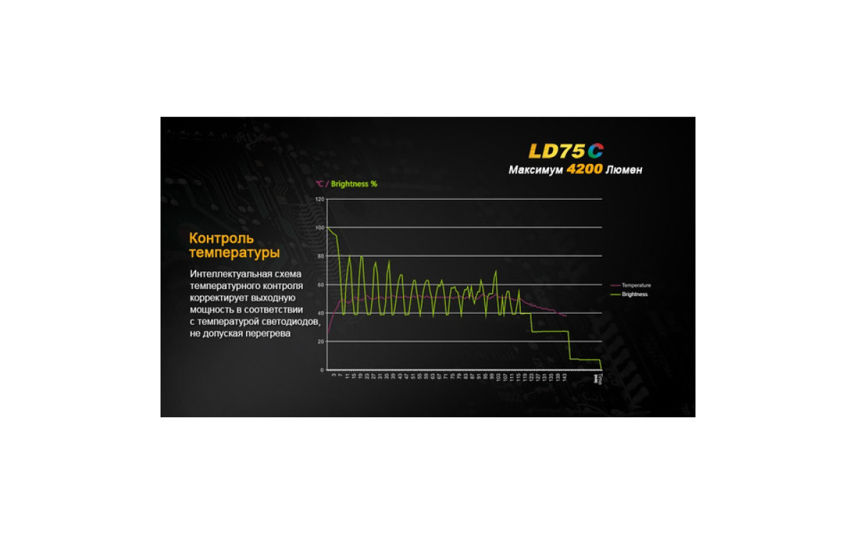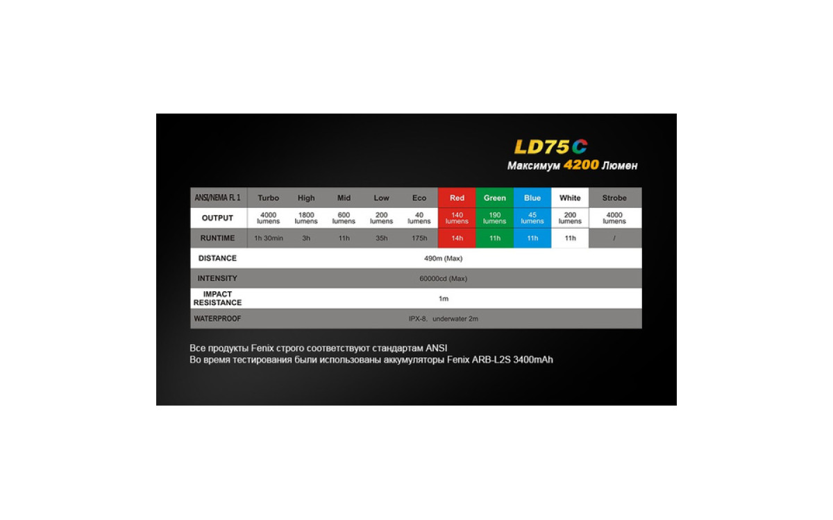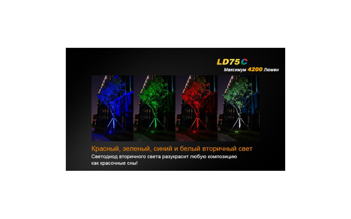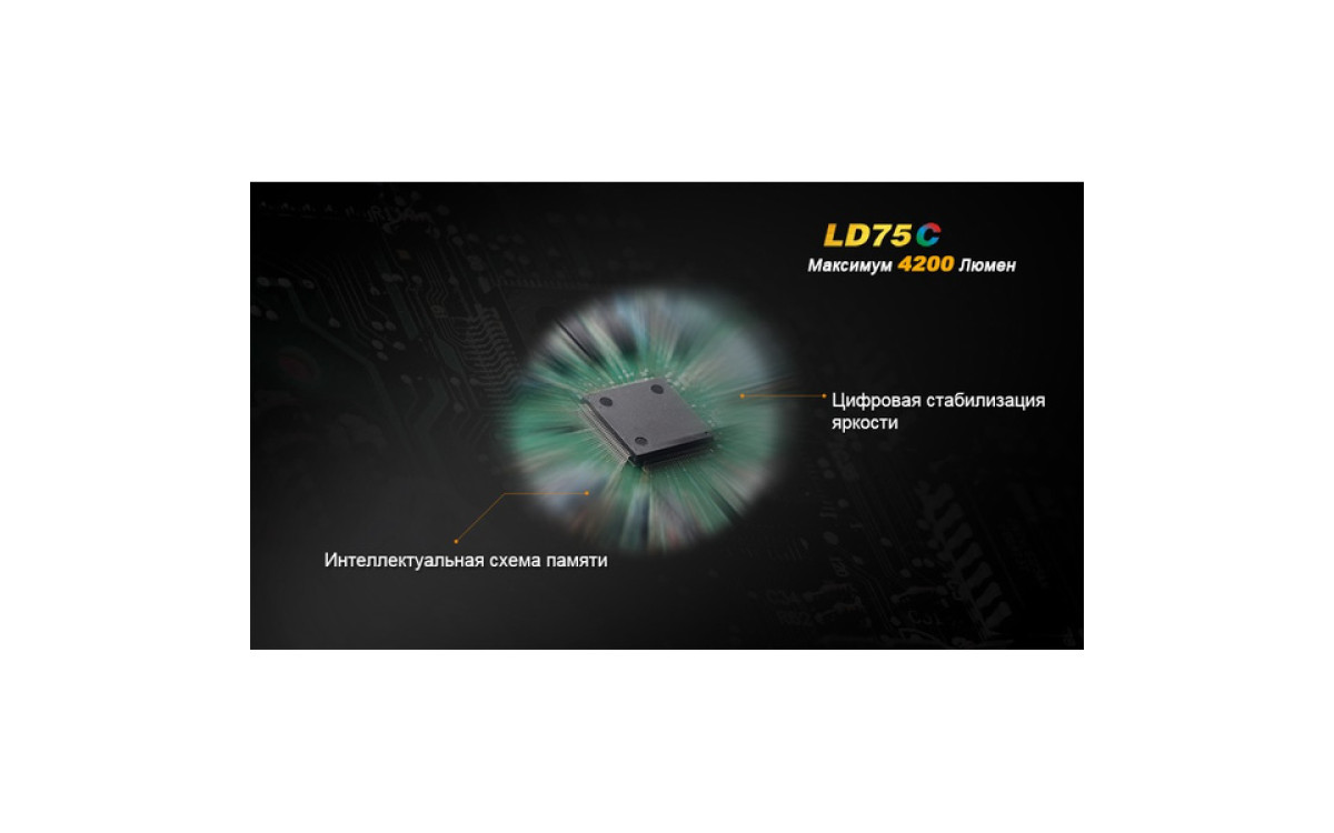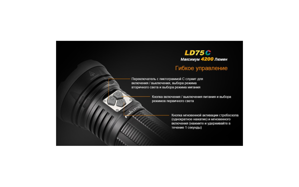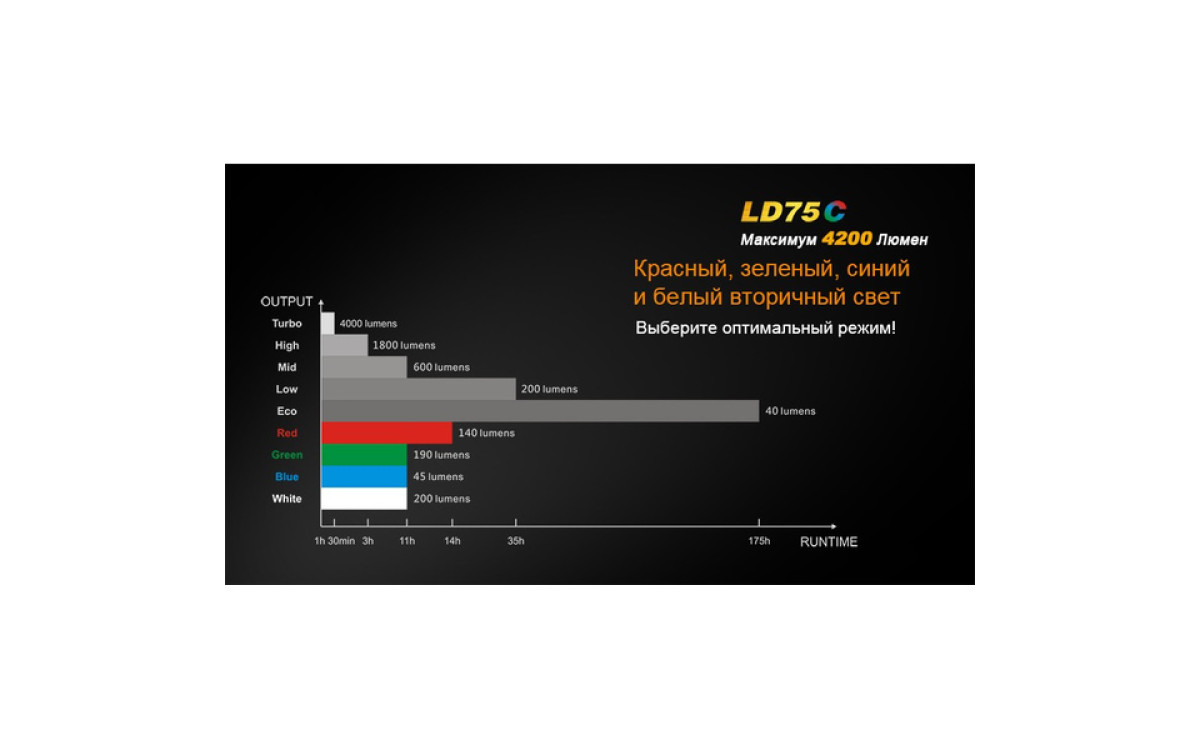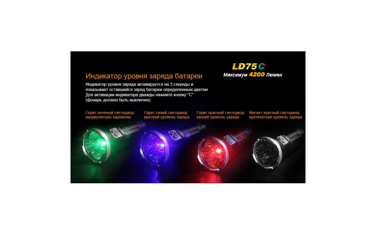 Экстремальная яркость, компактный размер и 3 дополнительных цвета (Красный, Синий, Зеленый) выделяют LD75 фаворитом среди фонарей для активных людей. Максимальная яркость 4200 люмен, дистанция луча 490 метров скрываются в 16-сантиметровом корпусе, который легко помещается в рюкзак, ящик для инструментов или бардачок автомобиля. В фонаре предустановленны 5 режимов яркости белого света, мгновенный доступ к Турбо режиму и Строб сигналу.