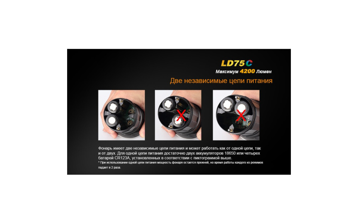 | Элементы питания: 4x18650 или 8xCR123A | |||