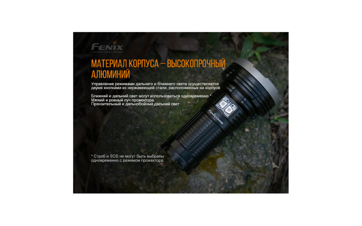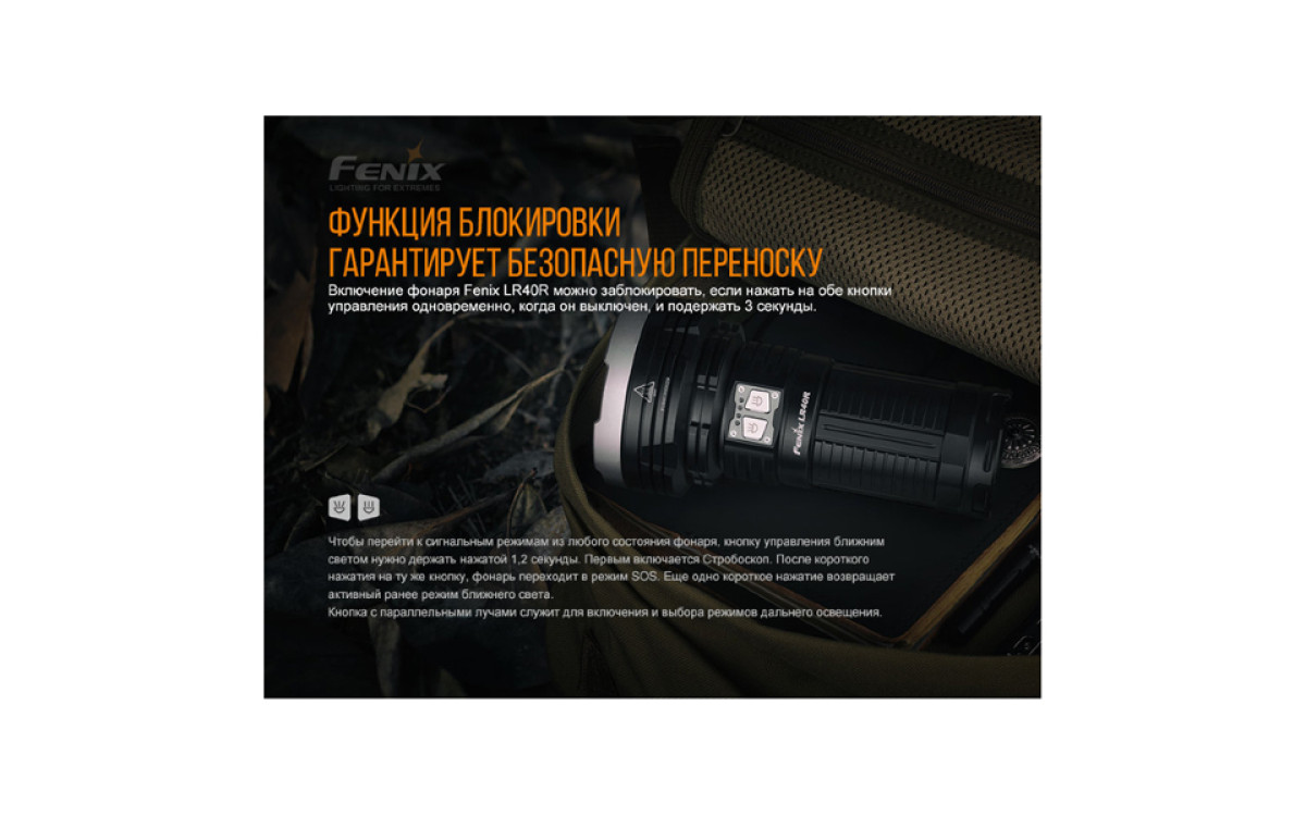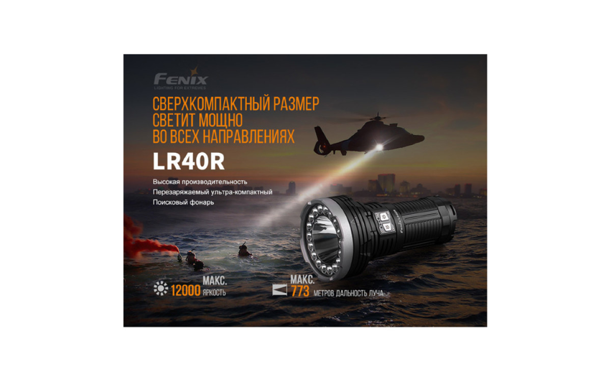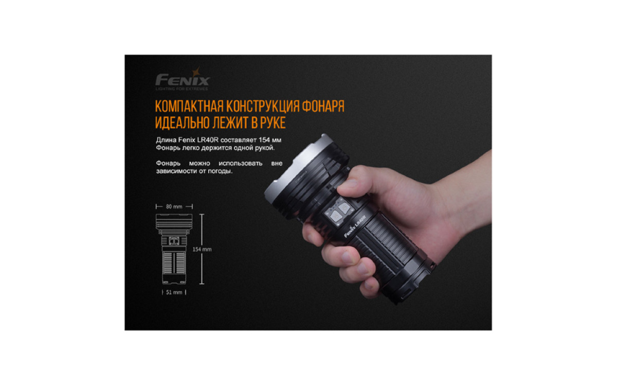 Фонарь Fenix LR40R - мощный аккумуляторный фонарь, комбинирующий ближний и дальний свет. Предназначенный для экстремальных условий и активной деятельности на открытом воздухе, этот фонарь окажет неоценимую помощь в исследовании пещер, поисковых и спасательных работах. Прекрасно подойдет в качестве резервного света в автомобиле.