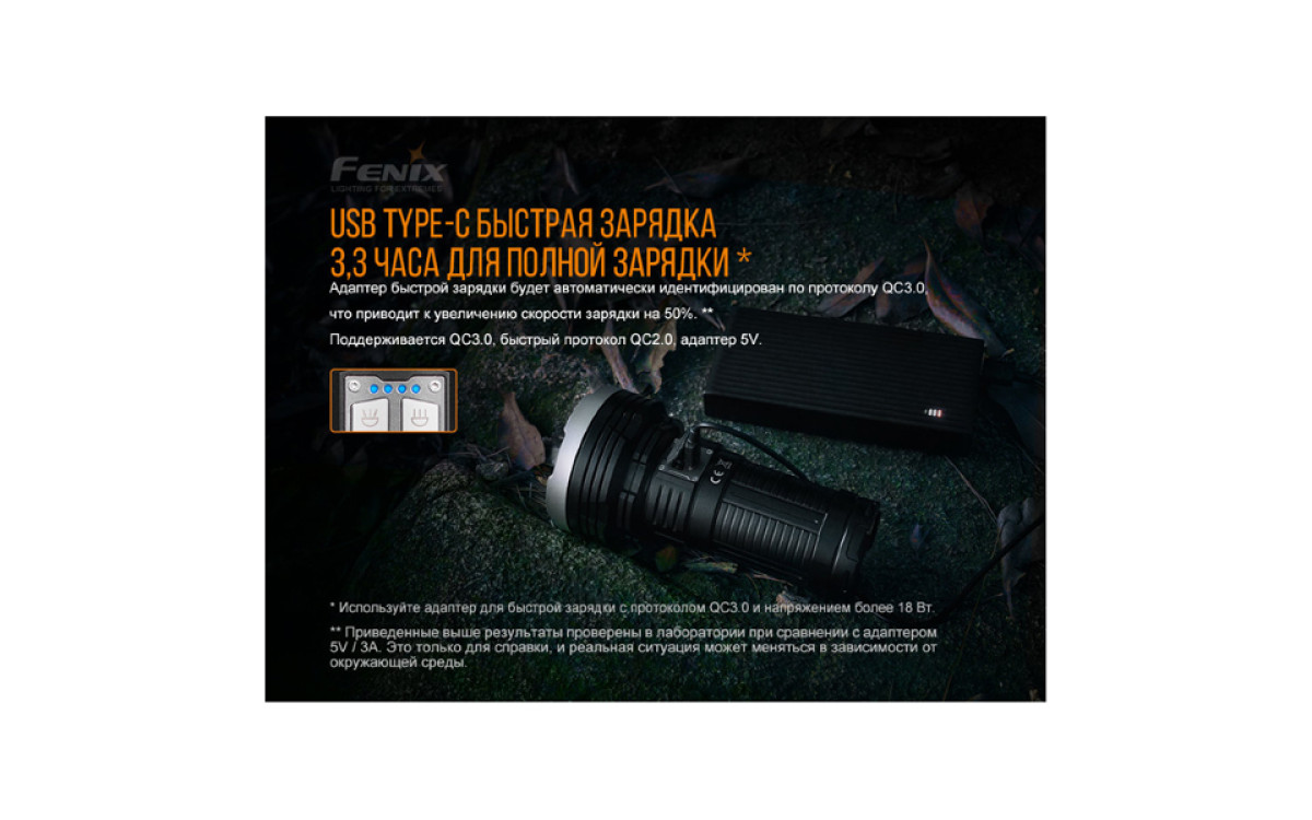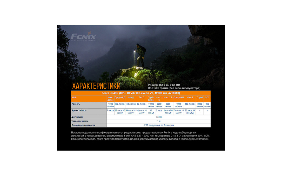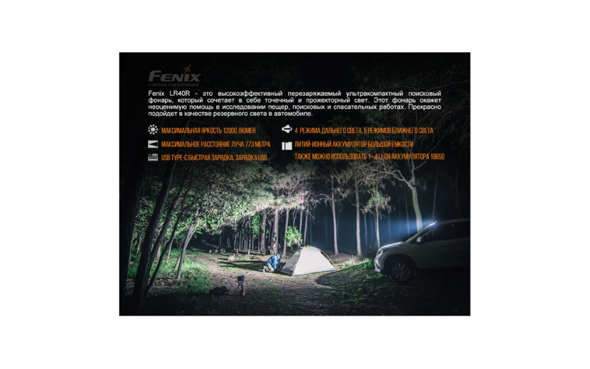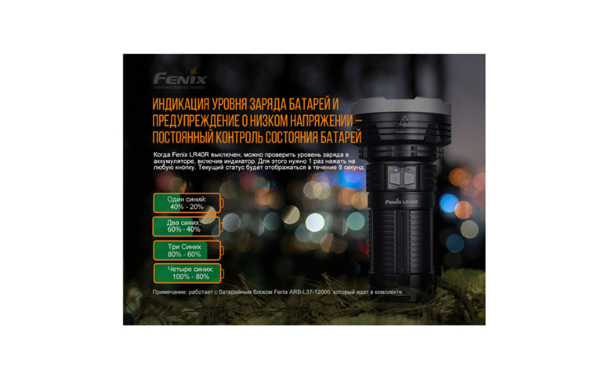| Комплектация | Фонарь LR40R, аккумуляторный блок Fenix ARB-L37-12000 Li-ion, кабель для зарядки USB Type-C, ремешок на руку, чехол, запасное уплотнительное кольцо, инструкция, гарантийный талон. | ||||||||||
