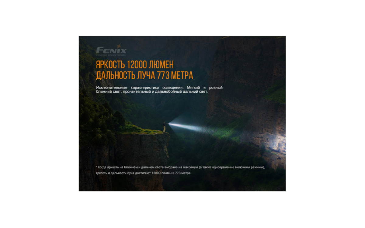 - Супер яркость 12000 люмен, ультра длинная дистанция луча 773 метра.