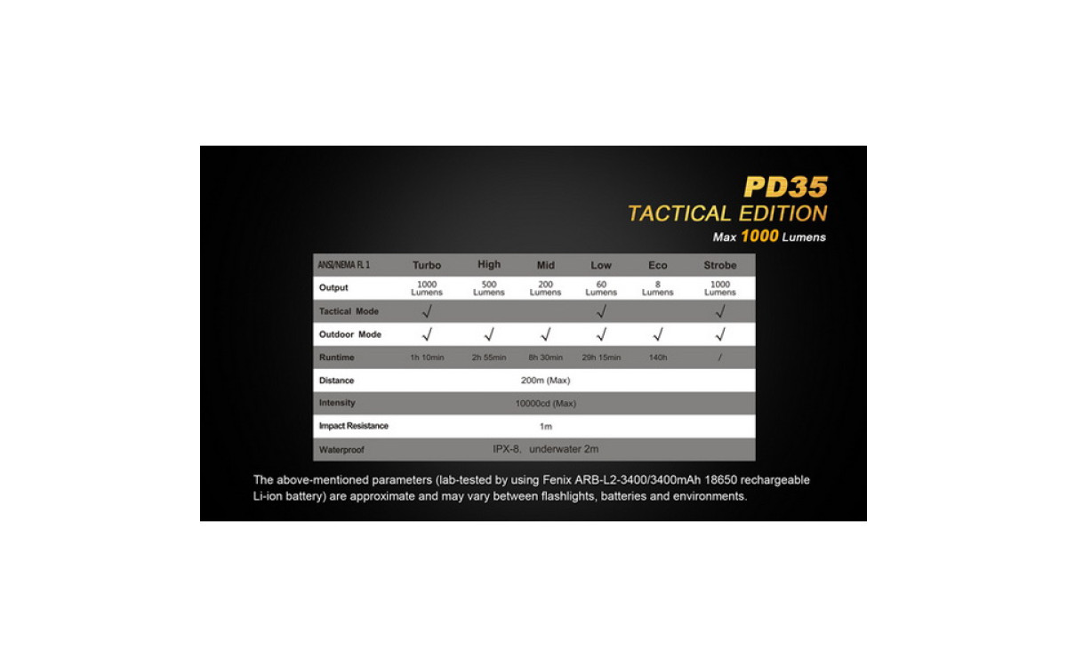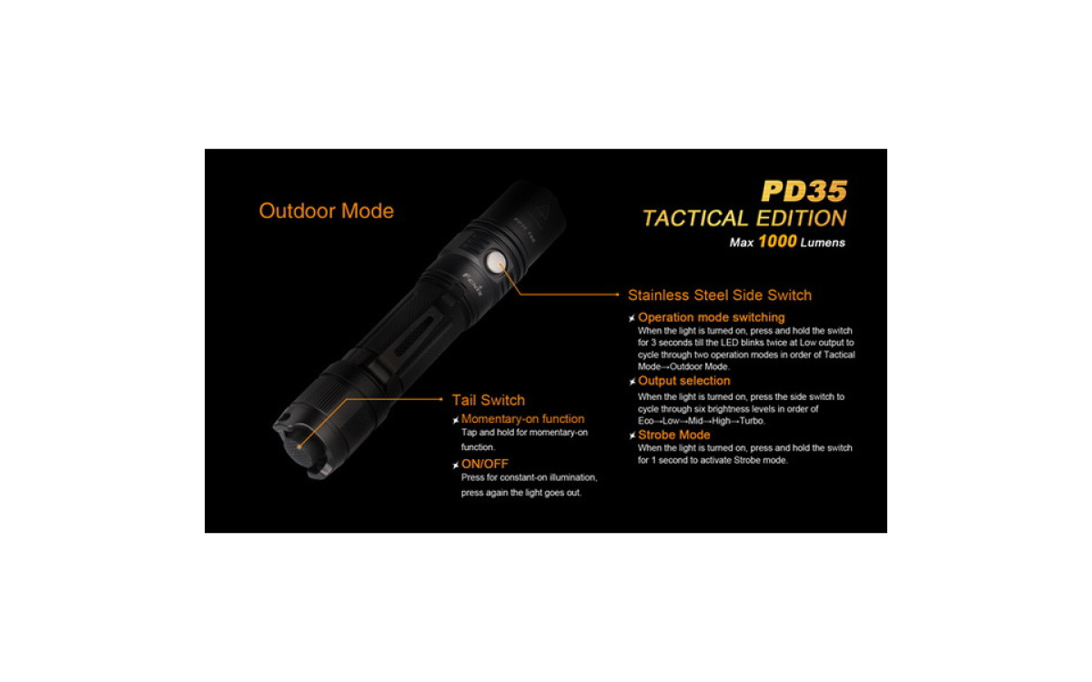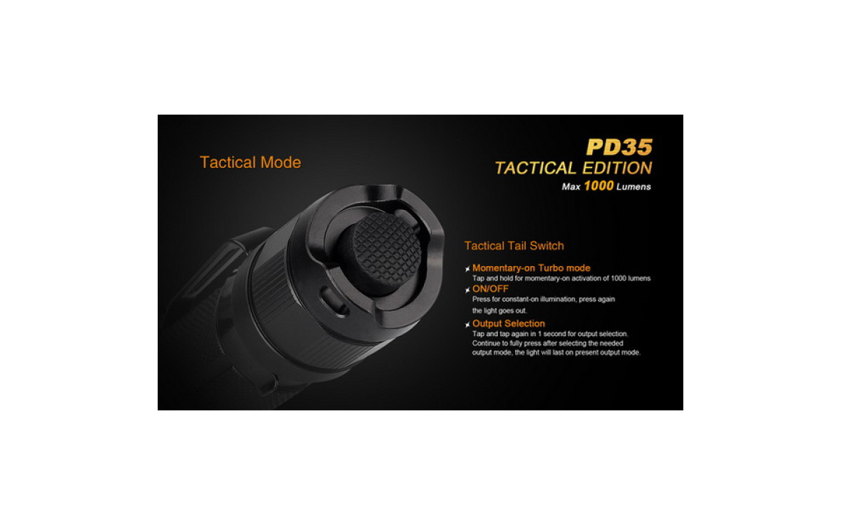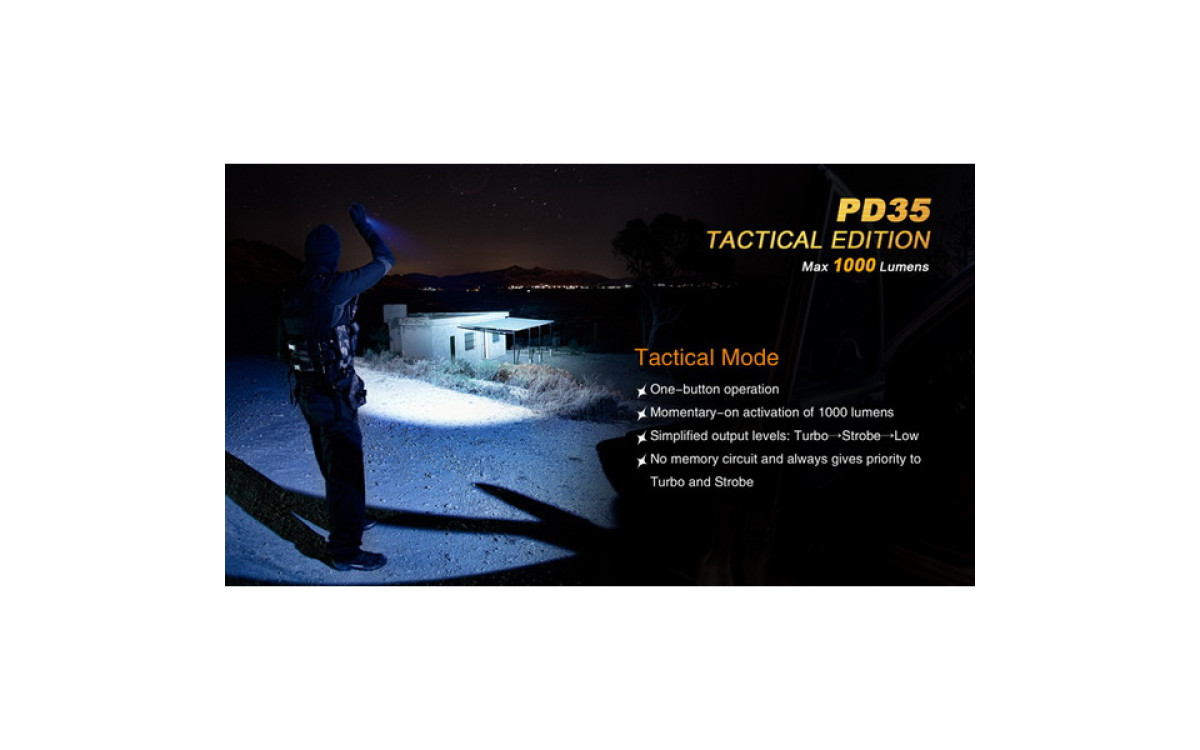 Fenix PD35TAC – это тактическая версия популярного мощного карманного фонаря Fenix PD35. Фонарь сохранил компактные размеры, фокусируясь при этом на тактических целях. Длина фонаря составляет менее 14 см, максимальная яркость достигает 1000 люмен, а дистанция освещения – 200 метров. В Туристической группе содержится 6 режимов, включая Строб сигнал. Тактическая группа режимов расширяет возможности PD35TAC, предоставляя упрощенный и быстрый доступ к режимам яркости. Вы можете полагаться на Fenix PD35TAC в любых жизненных ситуациях, его можно использовать как в ежедневном быту, так и в специализированных профессиональных сферах, например, в армейских подразделениях.