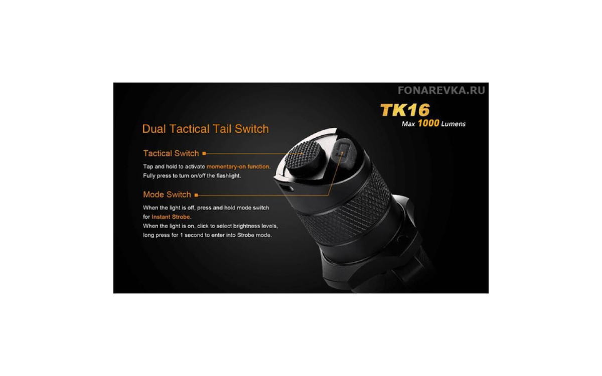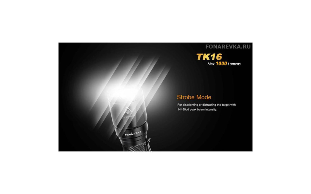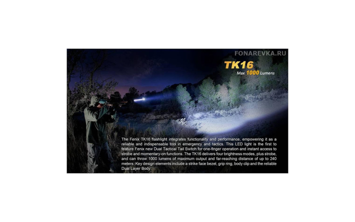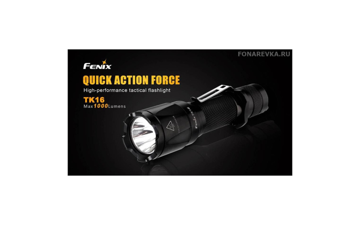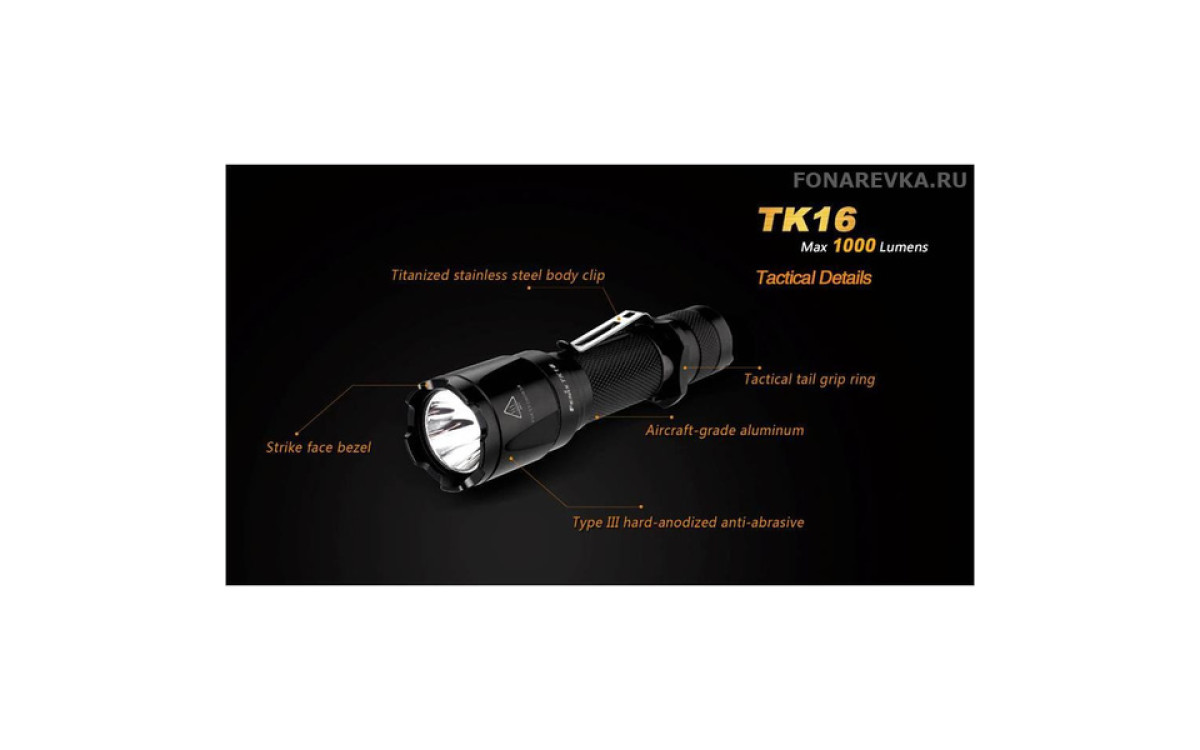 Максимальная яркость Фонаря Fenix TK16 достигает 1000 люмен. Длина дистанции освещения этого дальнобойного фонаря составляет 240 метров. Управление режимами, включая моментальное включение и режим стробоскопа, осуществляется двумя кнопками в хвосте, что обеспечивает надежное и гибкое применение в экстренных ситуациях. Fenix TK16 — сильный тактический фонарь для использования в военных и спец подразделениях, охоте, поисковых работах и т.п., обладающий эргономичным дизайном и надежной конструкцией, прочной ударной кромкой, клипсой на корпусе, кольцом для тактического хвата, богатым выбором тактических аксессуаров. Fenix ТК16 создан с учетом многолетнего опыта проектирования тактических фонарей Fenix, учтены все нюансы использования и улучшены функциональные тактико-технические характеристики.