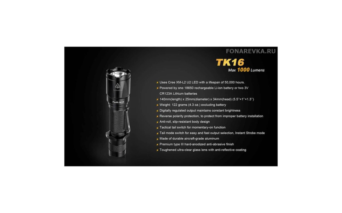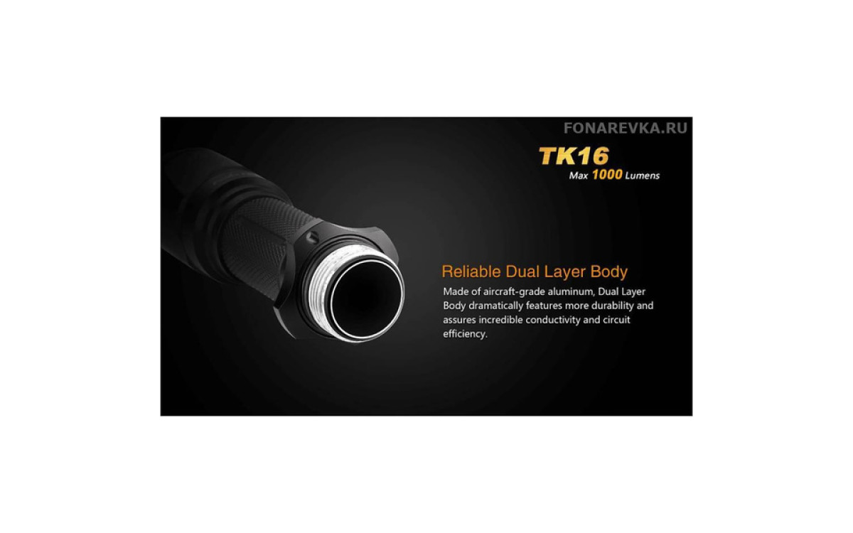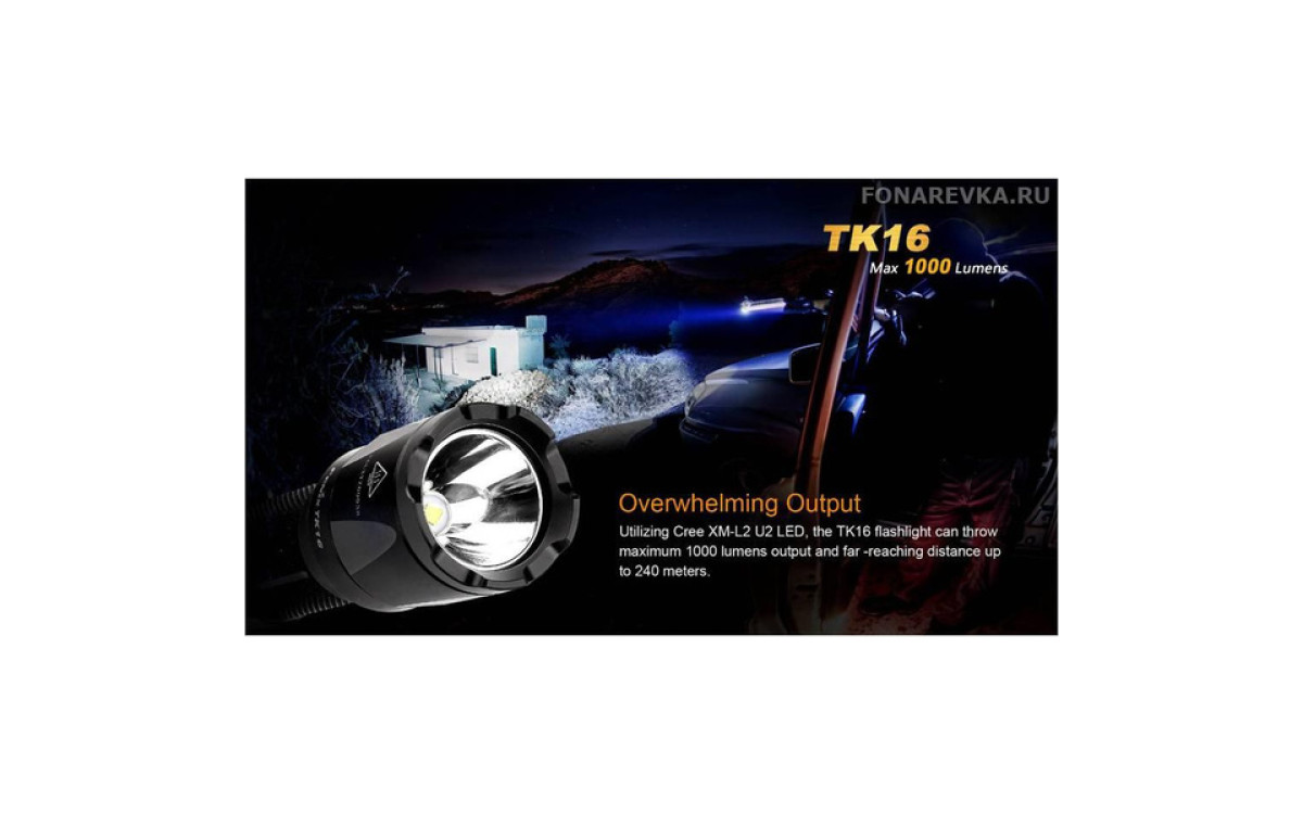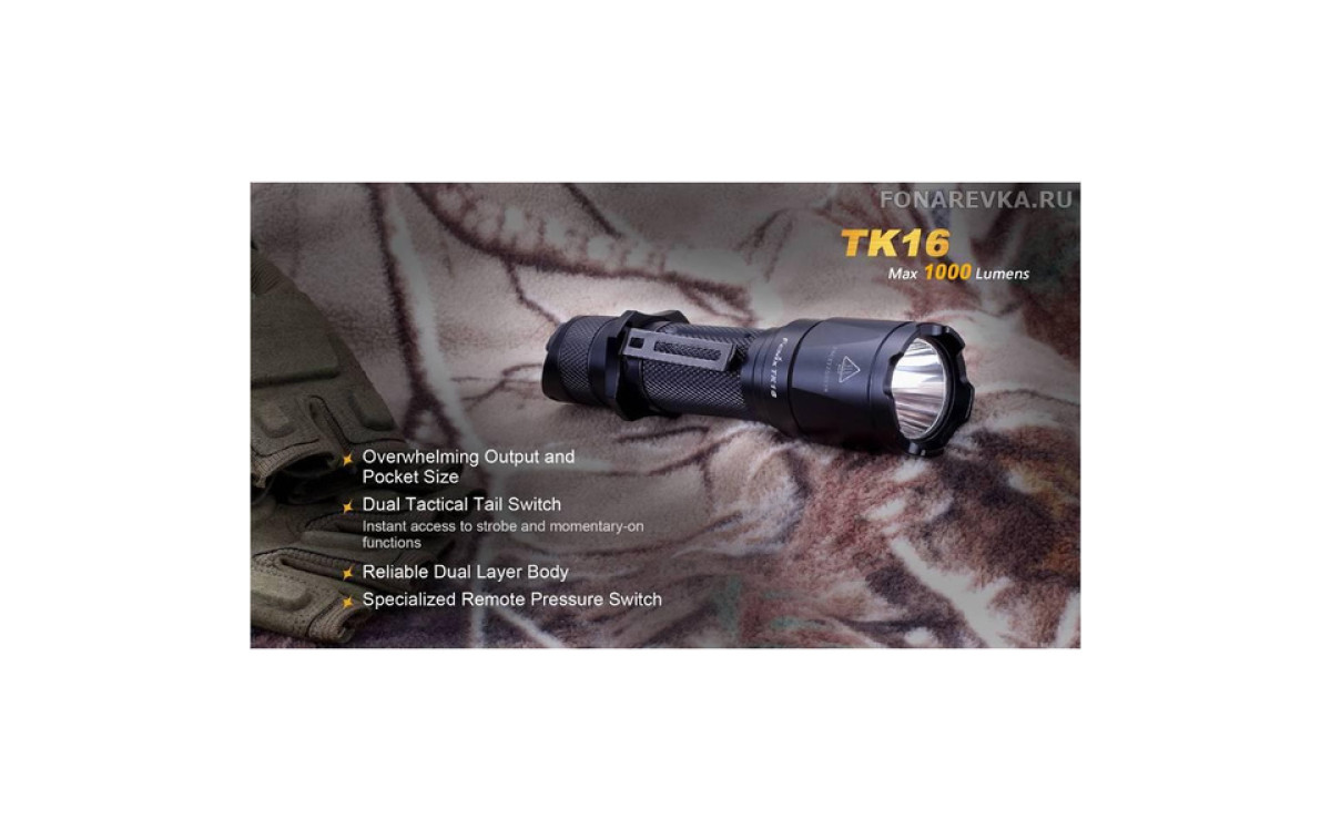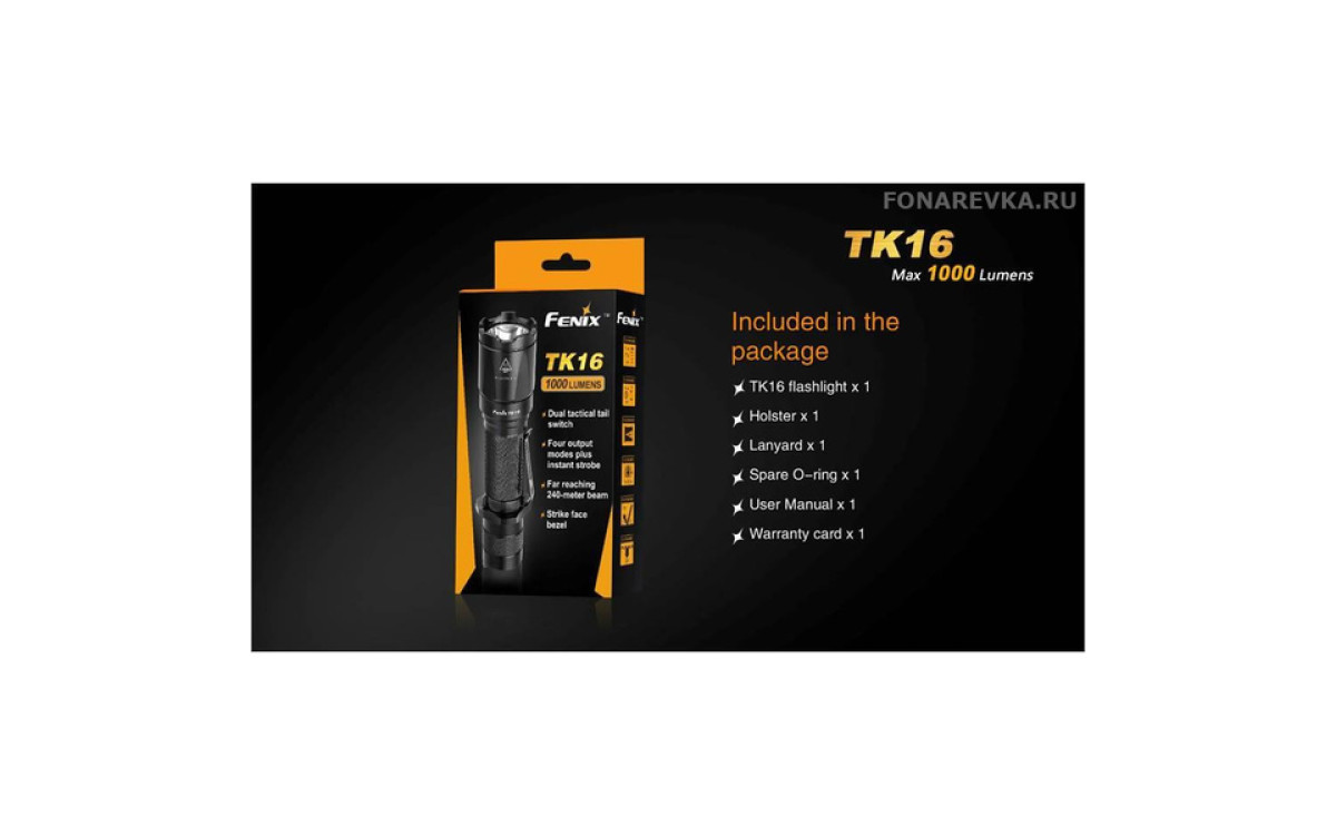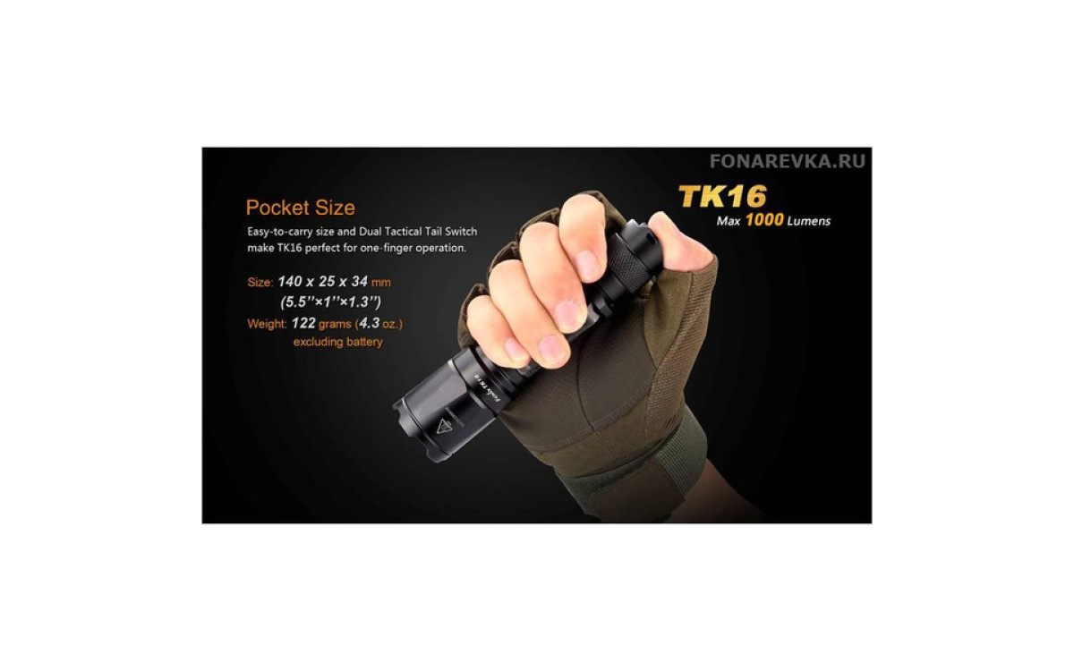 Максимальная яркость Фонаря Fenix TK16 достигает 1000 люмен. Длина дистанции освещения этого дальнобойного фонаря составляет 240 метров. Управление режимами, включая моментальное включение и режим стробоскопа, осуществляется двумя кнопками в хвосте, что обеспечивает надежное и гибкое применение в экстренных ситуациях. Fenix TK16 — сильный тактический фонарь для использования в военных и спец подразделениях, охоте, поисковых работах и т.п., обладающий эргономичным дизайном и надежной конструкцией, прочной ударной кромкой, клипсой на корпусе, кольцом для тактического хвата, богатым выбором тактических аксессуаров. Fenix ТК16 создан с учетом многолетнего опыта проектирования тактических фонарей Fenix, учтены все нюансы использования и улучшены функциональные тактико-технические характеристики.